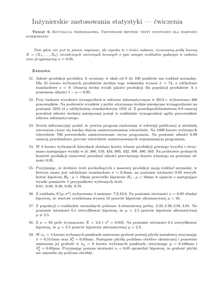 Inżynierskie zastosowania statystyki — ćwiczenia Temat 5: Estymacja przedziałowa, Testowanie hipotez: testy istotności dla wartości oczekiwanej Tam gdzie nie jest to jawnie napisane, ale wynika to z treści zadania, rozważamy próbę losową X = (X1 , . . . , Xn ) niezależnych zmiennych losowych o tym samym rozkładzie podanym w zadaniu oraz przyjmujemy α = 0.05. Zadania 51. Jakość produkcji produktu A oceniany w skali od 0 do 100 punktów ma rozkład normalny. Dla 25 losowo wybranych produktów średnia tego wskaźnika wynosi x̄ = 74, a odchylenie standardowe s = 9. Oszacuj średni wynik jakości produkcji dla populacji produktów A z poziomem ufności 1 − α = 0.95. 52. Przy badaniu wysokości wynagrodzeń w sektorze informatycznym w 2013 r. wylosowano 400 pracowników. Na podstawie wyników z próby otrzymano średnie miesięczne wynagrodzenie na poziomie 5255 zł z odchyleniem standardowym 1855 zł. Z prawdopodobieństwem 0.9 oszacuj przedział ufności średniej miesięcznej pensji w rozkładzie wynagrodzeń ogółu pracowników sektora informatycznego. 53. Serwis informacyjny podał, że pewien program emitowany w telewizji publicznej w niedzielę wieczorem cieszy się bardzo dużym zainteresowaniem telewidzów. Na 1800 losowo wybranych telewidzów 786 potwierdziło zainteresowanie owym programem. Na poziomie ufności 0.99 oszacuj przedziałowo procent telewidzów zainteresowanych wspomnianym programem. 54. W 8 losowo wybranych fabrykach zbadano koszty własne produkcji pewnego wyrobu i otrzymano następujące wyniki w zł: 380, 510, 434, 693, 432, 508, 480, 563. Na podstawie podanych kosztów produkcji oszacować przedział ufności przeciętnego kosztu własnego na poziomie ufności 0.95. 55. Przyjmując, że średnice śrub pochodzących z masowej produkcji mają rozkład normalny, w którym znane jest odchylenie standardowe σ = 0.2mm, na poziomie istotności 0.05 zweryfikować hipotezę H0 : µ = 10mm przeciwko hipotezie H1 : µ < 10mm w oparciu o następujące wyniki pomiarów 5 przypadkowo wybranych śrub: 9.81, 9.89, 9.49, 9.93, 9.78. 56. Z rozkładu N (µ, σ 2 ) wylosowano 4 zmienne: 7,9,10,8. Na poziomie istotności α = 0.05 zbadać hipotezę, że wartość oczekiwana wynosi 10 przeciw hipotezie alternatywnej µ < 10. 57. Z populacji o rozkładzie normalnych pobrano 4-elementową próbę: 2.32, 2.56, 2.91, 3.01. Na poziomie istotności 0.1 zweryfikować hipotezę, że µ = 2.5 przeciw hipotezie alternatywnej µ 6= 2.5. 58. Z n = 50 prób wyznaczono X̄ = 2.6 i s2 = 0.045. Na poziomie istotności 0.1 zweryfikować hipotezę, że µ = 2.5 przeciw hipotezie alternatywnej µ > 2.5. 59. W nx = 4 losowo wybranych punktach zmierzono grubość pewnej płytki metalowej otrzymując x̄ = 0.511mm oraz Sx2 = 0.03mm. Następnie płytkę poddano obróbce chemicznej i ponownie zmierzono jej grubość w ny = 9 losowo wybranych punktach, otrzymując ȳ = 0.449mm i Sy2 = 0.02mm. Przyjmując poziom istotności α = 0.05 sprawdzić hipotezę, że grubość płytki nie zmieniła się podczas obróbki. 60. Zmienne Xi pochodzą z rozkładu N (µx , σ 2 ), a niezależne zmienne Yi z rozkładu N (µy , σ 2 ), gdzie σ = 2, 5. Zmierzone średnie wynosiły x̄ = 3.55 i ȳ = 3.65. Zweryfikuj hipotezę H0 : µx = µy przeciw hipotezie alternatywnej H1 : µx 6= µy na poziomie istotności α = 1%. Liczności obu prób wynosiły odpowiednio n1 = 200 i n2 = 250. 61. Zmierzono średnie spalanie paliwa na 100km w samochodach pewnej marki. Przetestowano auta pochodzące z dwóch roczników: n1 = 30 samochodów wyprodukowanych w 2009 roku i otrzymano średnie spalanie na poziomie m1 = 5.6 l/100 km przy odchyleniu standardowym σ1 = 1.1 l/100 km oraz n2 = 100 samochodów wyprodukowanych w 2010 roku i otrzymano średnie spalanie na poziomie m2 = 5.3l/100 km przy odchyleniu standardowym σ2 = 1.3 l/100 km. Zweryfikować na poziomie istotności 5% hipotezę, czy auta wyprodukowane później mają istotnie mniejsze średnie spalanie paliwa?