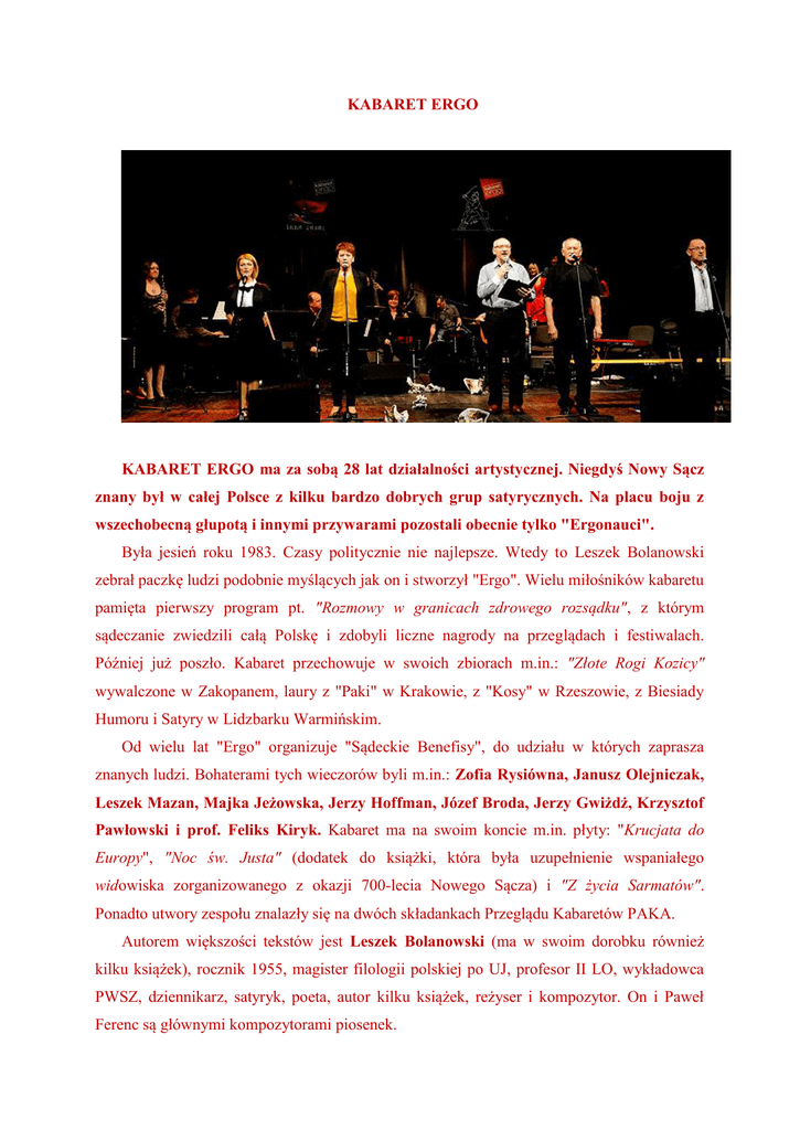 KABARET ERGO KABARET ERGO ma za sobą 28 lat działalności artystycznej. Niegdyś Nowy Sącz znany był w całej Polsce z kilku bardzo dobrych grup satyrycznych. Na placu boju z wszechobecną głupotą i innymi przywarami pozostali obecnie tylko "Ergonauci". Była jesień roku 1983. Czasy politycznie nie najlepsze. Wtedy to Leszek Bolanowski zebrał paczkę ludzi podobnie myślących jak on i stworzył "Ergo". Wielu miłośników kabaretu pamięta pierwszy program pt. "Rozmowy w granicach zdrowego rozsądku", z którym sądeczanie zwiedzili całą Polskę i zdobyli liczne nagrody na przeglądach i festiwalach. Później już poszło. Kabaret przechowuje w swoich zbiorach m.in.: "Złote Rogi Kozicy" wywalczone w Zakopanem, laury z "Paki" w Krakowie, z "Kosy" w Rzeszowie, z Biesiady Humoru i Satyry w Lidzbarku Warmińskim. Od wielu lat "Ergo" organizuje "Sądeckie Benefisy", do udziału w których zaprasza znanych ludzi. Bohaterami tych wieczorów byli m.in.: Zofia Rysiówna, Janusz Olejniczak, Leszek Mazan, Majka Jeżowska, Jerzy Hoffman, Józef Broda, Jerzy Gwiżdż, Krzysztof Pawłowski i prof. Feliks Kiryk. Kabaret ma na swoim koncie m.in. płyty: "Krucjata do Europy", "Noc św. Justa" (dodatek do książki, która była uzupełnienie wspaniałego widowiska zorganizowanego z okazji 700-lecia Nowego Sącza) i "Z życia Sarmatów". Ponadto utwory zespołu znalazły się na dwóch składankach Przeglądu Kabaretów PAKA. Autorem większości tekstów jest Leszek Bolanowski (ma w swoim dorobku również kilku książek), rocznik 1955, magister filologii polskiej po UJ, profesor II LO, wykładowca PWSZ, dziennikarz, satyryk, poeta, autor kilku książek, reżyser i kompozytor. On i Paweł Ferenc są głównymi kompozytorami piosenek. "W epoce, kiedy standardy współczesnej kultury wyznaczają reality show, telenowele i sitcomy, pojawienie się inteligentnego, literackiego kabaretu należy do wydarzeń równie rzadkich jak narodziny niedźwiadka panda" - napisał o "Ergo" Marcin Wolski, twórca audycji "60 minut na godzinę". Bardzo ciepło o sądeczanach wyrażali się m.in. Jan Tadeusz Stanisławski, Krzysztof Daukszewicz, Stanisław Tym i Magda Umer. Mistrz Jeremi Przybora po wysłuchaniu płyty "Z życia Sarmatów" powiedział niegdyś krótko: "Dawno nie słyszałem czegoś równie smacznego". Trudno o lepszą recenzję. Zwłaszcza, że - w zalewie kabaretowej amatorszczyzny i prymitywizmu - "Ergo" przez cały czas trzyma styl, klasę i dobry smak.