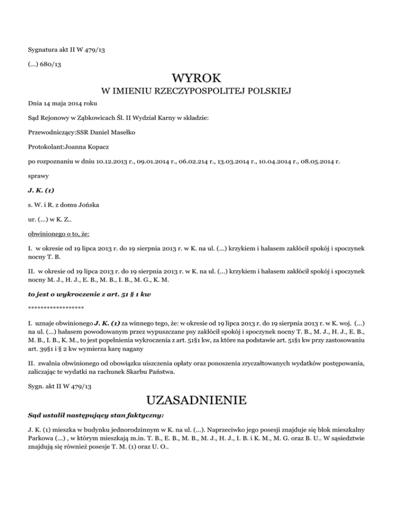 Sygnatura akt II W 479/13 (...) 680/13 WYROK W IMIENIU RZECZYPOSPOLITEJ POLSKIEJ Dnia 14 maja 2014 roku Sąd Rejonowy w Ząbkowicach Śl. II Wydział Karny w składzie: Przewodniczący:SSR Daniel Masełko Protokolant:Joanna Kopacz po rozpoznaniu w dniu 10.12.2013 r., 09.01.2014 r., 06.02.214 r., 13.03.2014 r., 10.04.2014 r., 08.05.2014 r. sprawy J. K. (1) s. W. i R. z domu Jońska ur. (...) w K. Z.. obwinionego o to, że: I. w okresie od 19 lipca 2013 r. do 19 sierpnia 2013 r. w K. na ul. (...) krzykiem i hałasem zakłócił spokój i spoczynek nocny T. B. II. w okresie od 19 lipca 2013 r. do 19 sierpnia 2013 r. w K. na ul. (...) krzykiem i hałasem zakłócił spokój i spoczynek nocny M. J., H. J., E. B., M. B., I. B., M. G., K. M. to jest o wykroczenie z art. 51 § 1 kw ****************** I. uznaje obwinionego J. K. (1) za winnego tego, że: w okresie od 19 lipca 2013 r. do 19 sierpnia 2013 r. w K. woj. (...) na ul. (...) hałasem powodowanym przez wypuszczane psy zakłócił spokój i spoczynek nocny T. B., M. J., H. J., E. B., M. B., I. B., K. M., to jest popełnienia wykroczenia z art. 51§1 kw, za które na podstawie art. 51§1 kw przy zastosowaniu art. 39§1 i § 2 kw wymierza karę nagany II. zwalnia obwinionego od obowiązku uiszczenia opłaty oraz ponoszenia zryczałtowanych wydatków postępowania, zaliczając te wydatki na rachunek Skarbu Państwa. Sygn. akt II W 479/13 UZASADNIENIE Sąd ustalił następujący stan faktyczny: J. K. (1) mieszka w budynku jednorodzinnym w K. na ul. (...). Naprzeciwko jego posesji znajduje się blok mieszkalny Parkowa (...) , w którym mieszkają m.in. T. B., E. B., M. B., M. J., H. J., I. B. i K. M., M. G. oraz B. U.. W sąsiedztwie znajdują się również posesje T. M. (1) oraz U. O.. Obwiniony posiada psy . Początkowo były trzy duże. Od maja 2013r., J. K. ma dodatkowo kilka małych piesków. Obwiniony duże psy trzyma na terenie posesji. Natomiast małe pieski przebywają w domu. Zdarzało się, że psy szczekały na przechodzących obok posesji ludzi oraz przebiegające w pobliżu zwierzęta, także bezpańskie, dzikie. W okresie letnim tj. od około 19 lipca 2013 r. z posesji obwinionego zaczęło dochodzić coraz głośniejsze szczekanie i ujadanie psów. Było słyszalne ponieważ w bloku otwierano okna. Sytuacje te powtarzały się i miały miejsce o tej samej porze, około godziny 06.00 rano oraz po godzinie 22.00. Obwiniony w tym czasie zwyczajowo wypuszczał ze swojego domu wszystkie małe pieski. Te z hałasem wybiegały na podwórko, zaczepiały duże psy przebywające na zewnątrz. Wszystkie psy bardzo hałasowały tj. głośno szczekały i ujadały zazwyczaj około kilkudziesięciu minut. Do sytuacji takich dochodziło niemal codziennie. Zdarzało się, że w tym czasie J. K. (1) wychodził z domu i uspokajał zwierzęta. Bywały jednak sytuacje, że nie reagował na zachowanie psów. Wielokrotnie sytuacje te obserwowali sąsiedzi: H. J., M. J., T. B., E. B., M. B., K. M., I. B.. Widzieli oni jak małe pieski z hałasem wybiegały na zewnątrz, a duże zaczynały im wtórować i zaczynało się głośne ujadanie. Szczekanie psów dochodzące z posesji obwinionego słyszeli również M. G., T. M. (1) i U. O.. Hałas w postaci głośnego szczekania i ujadania psów dochodzący z posesji obwinionego we wczesnych godzinach rannych oraz po godzinie 22.00 był uciążliwy i zakłócał spokój oraz spoczynek nocny: T. B., E. B., M. B., H. J., M. J., K. M. oraz I. B.. Ci początkowo nie reagowali. Sądzili, że jest to przejściowa sytuacja. Nie rozmawiali również z obwinionym w tej sprawie. Nie chcieli z nim konfliktu. Dyskutowali jedynie między sobą. Dopiero pod koniec lipca 2013 r. T. B. skontaktowała się z dzielnicowym, a w dniu 19 sierpnia 2013 r. złożyła zawiadomienie o podejrzeniu popełnienia wykroczenia. W sprawie tej wszczęto przedmiotowe postępowanie. Dowód: - zeznania T. B. k. 3 – 3v, 97v – 98v; - zeznania M. J. k. 5 – 5v, 82v – 83; - zeznania H. J. k. 8 – 8v, 81v – 82v; - zeznania E. B. k. 11 – 11v, 98v – 99v; - zeznania M. B. k. 14 – 14v, 17 – 17v, 99v – 100; - zeznania I. B. k. 18 – 10, 182v – 183; - zeznania K. M. k. 2- - 20v, 100v; - zeznania M. G. k. 23 – 24, 151v – 152; - częściowo zeznania T. M. (1) k. 152 – 152v; - częściowo zeznania U. O. k. 152v – 153; - częściowo zeznania B. U. k. 153; - częściowo wyjaśnienia J. K. (1) k. 69v – 70v, 100v – 101, 153v; - dokumentacja fotograficzna k. 49 – 58, 76 – 80, 85 – 94, 107 – 150; - informacja KP w K. Z.. z dnia 31.07.2013 r. k. 1; Po wszczęciu postępowania sytuacja uspokoiła się. Obwiniony zmieniał swoje dotychczasowe zachowanie. Nie wypuszczał już wszystkich psów naraz, ale stopniowo. Hasał zmniejszył się i nie jest już uciążliwy dla sąsiadów. T. B., E. B., M. B., H. J., M. J., K. M. oraz I. B. nie są zainteresowani ukaraniem J. K. (1). Chcieli oni jedynie, aby obwiniony wpłynął na zmniejszenie hałasu dochodzącego z jego posesji, co też się stało. Dowód: - zeznania T. B. k. 3 – 3v, 97v – 98v; - zeznania M. J. k. 5 – 5v, 82v – 83; - zeznania H. J. k. 8 – 8v, 81v – 82v; - zeznania E. B. k. 11 – 11v, 98v – 99v; - zeznania M. B. k. 14 – 14v, 17 – 17v, 99v – 100; - zeznania I. B. k. 18 – 10, 182v – 183; - zeznania K. M. k. 2- - 20v, 100v; - zeznania M. G. k. 23 – 24, 151v – 152. J. K. (1) nie posiada nikogo na utrzymaniu, jest emerytem i z tego tytułu osiąga miesięczny dochód w wysokości 1922 zło netto. Ponadto posiada dom jednorodzinny oraz samochód osobowy marki V.. Obwiniony nie był dotychczas karany sądownie. Ukarany był za wykroczenia. Dowód: - dane z wniosku o ukaranie k. 28; - wyjaśnienia J. K. (1) k. 69v – 70v, 100v – 101, 153v; - notatka urzędowa k. 26; J. K. (1) nie przyznał się do popełnienia zarzucanych mu czynów. W swoich wyjaśnieniach potwierdził jednak, że posiada psy tj. trzy duże oraz od maja 2012 r. kilka mał