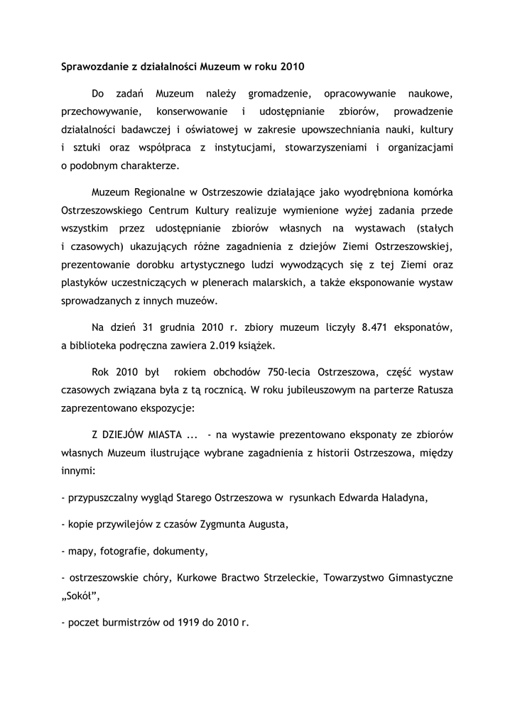 Sprawozdanie z działalności Muzeum w roku 2010 Do zadań przechowywanie, Muzeum należy konserwowanie gromadzenie, i opracowywanie udostępnianie zbiorów, naukowe, prowadzenie działalności badawczej i oświatowej w zakresie upowszechniania nauki, kultury i sztuki oraz współpraca z instytucjami, stowarzyszeniami i organizacjami o podobnym charakterze. Muzeum Regionalne w Ostrzeszowie działające jako wyodrębniona komórka Ostrzeszowskiego Centrum Kultury realizuje wymienione wyżej zadania przede wszystkim przez udostępnianie zbiorów własnych na wystawach (stałych i czasowych) ukazujących różne zagadnienia z dziejów Ziemi Ostrzeszowskiej, prezentowanie dorobku artystycznego ludzi wywodzących się z tej Ziemi oraz plastyków uczestniczących w plenerach malarskich, a także eksponowanie wystaw sprowadzanych z innych muzeów. Na dzień 31 grudnia 2010 r. zbiory muzeum liczyły 8.471 eksponatów, a biblioteka podręczna zawiera 2.019 książek. Rok 2010 był rokiem obchodów 750-lecia Ostrzeszowa, część wystaw czasowych związana była z tą rocznicą. W roku jubileuszowym na parterze Ratusza zaprezentowano ekspozycje: Z DZIEJÓW MIASTA ... - na wystawie prezentowano eksponaty ze zbiorów własnych Muzeum ilustrujące wybrane zagadnienia z historii Ostrzeszowa, między innymi: - przypuszczalny wygląd Starego Ostrzeszowa w rysunkach Edwarda Haladyna, - kopie przywilejów z czasów Zygmunta Augusta, - mapy, fotografie, dokumenty, - ostrzeszowskie chóry, Kurkowe Bractwo Strzeleckie, Towarzystwo Gimnastyczne „Sokół”, - poczet burmistrzów od 1919 do 2010 r. JAN PAWEŁ II – KU ŚWIĘTOŚCI - wystawa zorganizowana we współpracy z Kołem Związku Filatelistów Polskich przy Ostrzeszowskim Centrum Kultury.Swoje zbiory udostępnili: Jadwiga Graf, Zofia Szajdak, Maria Karwacka, Henryk Dembski, Antoni Filipowicz, Zenon Kałwiński, Marek Szymański. NIE SAMYM CHLEBEM ... czyli o ostrzeszowskich towarzystwach, organizacjach i stowarzyszeniach – celem wystawy było przybliżenie działalności ostrzeszowskich towarzystw, stowarzyszeń i organizacji w I poł. XX wieku. Dla zwiedzających dużym zaskoczeniem była liczba i różnorodność tworzonych organizacji oraz ich społeczne znaczenie w procesie kształtowania postaw i umiejętności kolejnych pokoleń młodych ostrzeszowian. WYSTAWA PRAC KAMERALNYCH PROF. TOMASZA SIWIŃSKIEGO - artysta studiował malarstwo w PWSSP w Poznaniu, uzyskując dyplom w 1979 r. Tworzy wyrafinowane w kolorze i formie kompozycje malarskie z pogranicza realności i abstrakcji oraz wysublimowane rysunki. Eksperymentuje w zakresie warsztatu i tworzywa, realizując swoje prace w technikach własnych. Od kilku lat jest merytorycznym opiekunem plenerów plastycznych im. A. Serbeńskiego organizowanych przez OCK. Wystawa składała się z dwóch części: pierwsza to cykl 28 prac kameralnych wykonanych różnymi technikami, druga to pastele, które powstały w czasie ostrzeszowskich plenerów malarskich – mogliśmy je eksponować dzięki życzliwości właścicieli Państwa Dembskich i Sieraczków. WYSTAWA POPLENEROWA - w tegorocznym XV Plenerze Plastycznym im. Antoniego Serbeńskiego uczestniczyły 22 osoby: Monika Biliczak, Aleksandra Bojszczak, Agata Borkowska, Ewa Borkowska, Wanda Grobelna, Katarzyna Grzesiek, Julia Homieja, Magdalena Homieja, Wanda Jędrzejewska, Agnieszka Kawacka, Paulina Kempa, Angelika Machuła, Mariusz Mikołajczyk, Dorota Pawlak, Magdalena Pawłowska, Małgorzata Pfisterer, Monika Puchała, Alina Rabiega, Anna Smolenko, Iwona Szymanek, Natalia Śmiady, Teresa Więcek - Mizerna. Uczestnicy pleneru pochodzą z Poznania, Gniezna, Krakowa, Suchego Lasu, Grabowa nad Prosną, Myjomic, Kraszewic i Ostrzeszowa. Opiekę merytoryczną nad uczestnikami pleneru sprawowali panowie: prof. Tomasz Siwiński oraz Antoni Wencek. Na wystawie prezentowane są obrazy przedstawiające znane i nieznane zakątki Ostrzeszowa i okolic wykonane ołówkiem, węglem, pastelami, akwarelą, akrylem i farbami olejnymi. Zawartość ekspozycji jest doskonałą pomocą dydaktyczną w realizacji lekcji plastyki, wiedzy o sztuce i szeroko pojętego regionalizmu. RZEMIEŚLNICZE TRADYCJE POŁUDNIOWEJ WIELKOPOLSKI – wystawa została zorganizowana we współpracy z Muzeum Ziemi Kępińskiej. Prezentowano na niej eksponaty ze zbiorów ostrzeszowskiego i kępińskiego Muzeum, Cechu Rzemiosł Różnych w Ostrzeszowie oraz mieszkańców naszego miasta: Andrzeja Kaczmarka, Bogdana Gibasiewicza, Janiny Kałużnej oraz Witolda i Macieja Pelków. Były to fotografie, dokumenty potwierdzające prawo wykonywania zawodu, statuty cechów, sztandary narzędzia pracy rzemieślników, ich wyroby i inne przedmioty związane z życiem braci cechowej. W roku 2010 wystawy stałe i czasowe w muzeum oraz basztę zwiedziło 5.247 osób. W ramach współpracy szkół z muzeum młodzież z Zespołu Szkół nr 2 wykonała 361 skanów negatywów – dokumentacji fotograficznej eksponatów, a uczniowie I Liceum Ogólnokształcącego zeskanowali protokólarze Rady Miejskiej z 1875-99 i z 1923-27 r. W oparciu o eksponaty z zasobów archiwalnych i magazynowych Muzeum oraz materiały prezentowane na wystawach przeprowadzane są lekcje języka polskiego, historii, plastyki, wiedzy o sztuce i szeroko pojętego regionalizmu odbyły się 64 lekcje (9 tematów), uczestniczyło w nich 1920 uczniów. Ze zgromadzonych muzealiów, wydawnictw książkowych, maszynopisów i rękopisów, a także prasy regionalnej korzystają studenci różnych uczelni piszący prace magisterskie i licencjackie, uczestnicy olimpiad przedmiotowych, uczniowie szkół podstawowych, gimnazjalnych i ponadgimnazjalnych.