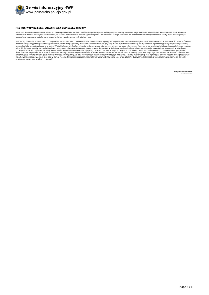 Serwis informacyjny KWP www.pomorska.policja.gov.pl PSY POGRYZŁY DZIECKO, WŁAŚCICIELKA USŁYSZAŁA ZARZUTY. Policjanci z Komendy Powiatowej Policji w Tczewie przesłuchali 43-letnią właścicielkę trzech psów, które pogryzły 9-latkę. W wyniku tego zdarzenia dziewczynka z obrażeniami ciała trafiła do szpitala w Gdańsku. Funkcjonariusze ustalili, że jeden z psów nie miał aktualnego szczepienia. Za narażenie innego człowieka na bezpośrednie niebezpieczeństwo utraty życia albo ciężkiego uszczerbku na zdrowiu kodeks karny przewiduję karę pozbawienia wolności do roku. W miniony czwartek (7 marca br.) przed godziną 17.00 policjanci z Tczewa zostali powiadomieni o pogryzieniu przez psy 9-letniej dziewczynki. Do zdarzenia doszło w miejscowości Rokitki. Świadek zdarzenia odganiając trzy psy atakujące dziecko, został też pogryziony. Funkcjonariusze ustalili, że psy rasy Mastif Tybetański wydostały się z podwórka ogrodzonej posesji najprawdopodobniej przez niewłaściwie zabezpieczoną bramkę. Właścicielka powiedziała policjantom, że psy przed zdarzeniem biegały po podwórku luzem. Mundurowi sprawdzając książeczki szczepień czworonogów ujawnili, że jeden z psów nie miał aktualnych szczepień. 9-latka została przetransportowana do szpitala w Gdańsku, gdzie udzielono jej pomocy. Dziecko pozostało na obserwacji w placówce. Funkcjonariusze szczegółowo ustalając okoliczności tego zdarzenia wykonali oględziny, przesłuchali osoby mające związek z tą sprawą, zabezpieczyli ślady oraz przeprowadzili eksperyment. Śledczy 43-letniej właścicielce psów przedstawili zarzuty nieumyślnego narażenia człowieka na bezpośrednie niebezpieczeństwo utraty życia albo ciężkiego uszczerbku na zdrowiu. Kodeks karny przewiduję za to karę do roku pozbawienia wolności. Pamiętajmy, że za zachowanie psa zawsze odpowiada jego właściciel. Szkody, które czynią psy, wynikają z błędów popełnianych przez ludzi np. chowanie nieodpowiedniej rasy psa w domu, nieprzestrzeganie szczepień, niewłaściwe warunki bytowe dla psa, brak szkoleń i dyscypliny. Jeżeli jesteś właścicielem psa pamiętaj, że brak wyobraźni może doprowadzić do tragedii! Data publikacji:2016-04-07 Dawid Krajewski page 1 / 1 Powered by TCPDF (www.tcpdf.org)