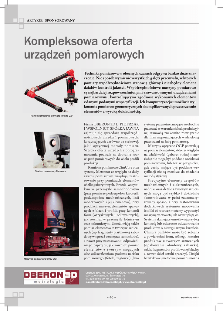 ARTYKUŁ SPONSOROWANY Kompleksowa oferta urządzeń pomiarowych Technika pomiarowa w obecnych czasach odgrywa bardzo duże znaczenie. Nie sposób wymienić wszystkich gałęzi przemysłu, w których pomiary współrzędnościowe stanowią główny i niezbędny element działów kontroli jakości. Współrzędnościowe maszyny pomiarowe są najbardziej rozpowszechnionymi zaawansowanymi urządzeniami pomiarowymi, kontrolującymi zgodność wykonanych elementów z danymi podanymi w specyfikacji. Ich komputeryzacja umożliwia wykonanie pomiarów geometrycznych skomplikowanych przestrzennie elementów z wysoką dokładnością. Ramię pomiarowe CimCore Infinite 2.0 System pomiarowy Metronor Rys. 2. Pomiar wizyjny Maszyna pomiarowa firmy OGP Firma OBERON 3D L. PIETRZAK I WSPÓLNICY SPÓŁKA JAWNA zajmuje się sprzedażą współrzędnościowych urządzeń pomiarowych, korzystających zarówno ze stykowej, jak i optycznej metody pomiaru. Szeroka oferta urządzeń i oprogramowania pozwala na dobranie rozwiązań pomiarowych do wielu profili produkcji. Ramiona pomiarowe CimCore oraz systemy Metronor ze względu na duży zakres pomiarowy znajdują zastosowanie przy pomiarach elementów wielkogabarytowych. Przede wszystkim w przemyśle samochodowym (przy pomiarze podzespołów karoserii, podzespołów mechanicznych, linii montażowych i jej elementów), przy produkcji maszyn, elementów spawanych z blach i profili, przy kontroli form (wtryskowych i odlewniczych), jak również w przemyśle lotniczym oraz szkutniczym. Umożliwiają także pomiar elementów z tworzyw sztucznych (np. fragmenty plastikowej zabudowy wnętrza i zewnętrza samochodu), a nawet przy zastosowaniu odpowiedniego osprzętu, jak również pomiar elementów z tworzyw mogących ulec odkształceniom podczas nacisku pomiarowego (fotele, zagłówki). Jako systemy przenośne, mogące swobodnie pracować w warunkach hali produkcyjnej stanowią znakomite rozwiązanie dla firm nieposiadających wydzielonej przestrzeni na izbę pomiarową. Maszyny optyczne OGP pozwalają na pomiar elementów, które ze względu na właściwości (gabaryt, rodzaj materiału) nie mogą być poddane naciskowi pomiarowemu, lub też w przypadku, gdy cechy mające być poddane weryfikacji nie są możliwe do zbadania metodą stykową. Precyzyjne elementy zespołów mechanicznych i elektronicznych, nadruki oraz detale z tworzyw sztucznych mogą być szybko i dokładnie skontrolowane w pełni zautomatyzowany sposób, a przy zastosowaniu dodatkowych systemów mocowania (stoliki obrotowe) możemy wyposażyć maszynę w czwartą lub nawet piątą oś. Systemy skanujące umożliwiają szybką kontrolę lub odwrotne odwzorowanie produktów o nieregularnym kształcie. Chmura punktów może być zebrana z powierzchni form, różnego kształtu produktów z tworzyw sztucznych (opakowania, obudowy, zabawki), szkła, fragmentów profilowanej blachy, a nawet dzieł sztuki (rzeźby). Dzięki bezstykowej metodzie pomiaru można OBERON 3D L. PIETRZAK I WSPÓLNICY SPÓŁKA JAWNA 02-401 Warszawa, ul. Świerszcza 76 tel. 22 539 59 70, fax 22 539 59 71 e-mail: [email protected], www.oberon3d.pl – 40 – styczeń-luty 2010 r. ARTYKUŁ SPONSOROWANY badać elementy wykonane z delikatnych materiałów. Bramowe maszyny współrzędnościowe produkcji firmy Aberlink znajdują zastosowanie przy detalach wymagających wysokiej dokładności wykonania i kontroli. Można mierzyć wzajemne zależności geometryczne poszczególnych elementów (położenie liniowe i kątowe), a przy zastosowaniu pliku CAD z zapisanymi wartościami nominalnymi można zbadać błąd kształtu powierzchni nieregularnych. Maszyny znajdują zastosowanie w przemyśle obróbczym: przy produkcji podzespołów maszyn, korpusów i form. W ofercie firmy Aberlink znajdują się zarówno maszyny sterowane ręcznie, jak i maszyny CNC. Główną zaletą maszyn Aberlink jest korzystny stosunek możliwości pomiarowych do ceny. Maszyny te są reprezentowane przez serie: – Axiom Too – o zakresach od 640 x 600 x 500 mm aż do 640 x 1500 x 500 mm, na łożyskach powietrznych, o lekkiej konstrukcji, umożliwiającej duże prędkości przejazdów, – maszyny Zenith Too – o zakresach aż do 1000 x 3000 x 800 mm, o solidnej podstawie, umożliwiającej pomiar dużych i ciężkich elementów. W ofercie dostępna jest także maszyna optyczna produkcji Aberlink – ProjektX, który spełnia funkcję projektora CNC lub ręcznego. Firma OBERON 3D ma w swojej ofercie również rozwiązania software’owe. Jednym z nich jest oprogramowanie PowerINSPECT firmy Delcam. Jest ono idealnym rozwiązaniem dla kontroli części, wzbogaconym o funkcję odwrotnego odwzorowania. Jest w pełni zintegrowanym pakietem przeznaczonym do kontroli geometrii i powierzchni oraz tworzenia odwrotnych odwzorowań. Łatwy w użyciu graficzny interfejs umożliwia przeprowadzenie błyskawicznej kontroli mierzonego detalu. Oprogramowanie umożliwia porównanie mierzonego detalu z plikiem CAD (3D) i wyświe- tlenie rozbieżności pomiędzy wymiarami nominalnymi a rzeczywistymi przy użyciu m.in. wielokolorowej grafiki. Dzięki temu możliwa jest natychmiastowa kontrola każdego zmierzonego punktu. Oprogramowanie PowerINSPECT jest dostępne w języku polskim. Firma OBERON 3D L. PIETRZAK I WSPÓLNICY SPÓŁKA JAWNA ma od niedawna w swojej ofercie system mocowania produkcji firmy Alukeep. Umożliwia on szybkie, stabilne i powtarzalne zamocowanie detalu podczas przeprowadzania pomiarów urządzeniami działającymi w oparciu o metodę stykową, optyczną lub skaning. Dzięki swojej modularności system idealnie dopasowuje się do potrzeb i oczekiwań użytkownika. Różnorodność elementów podpierających, blokujących i zaciskających pozwala na zestawienie systemu mocowania o dowolnej konfiguracji. Filozofia Alukeep to minimalizacja liczby elementów połączeniowych potrzebnych do stworzenia konstrukcji i oferowanie w zestawach jak największej liczby elementó
