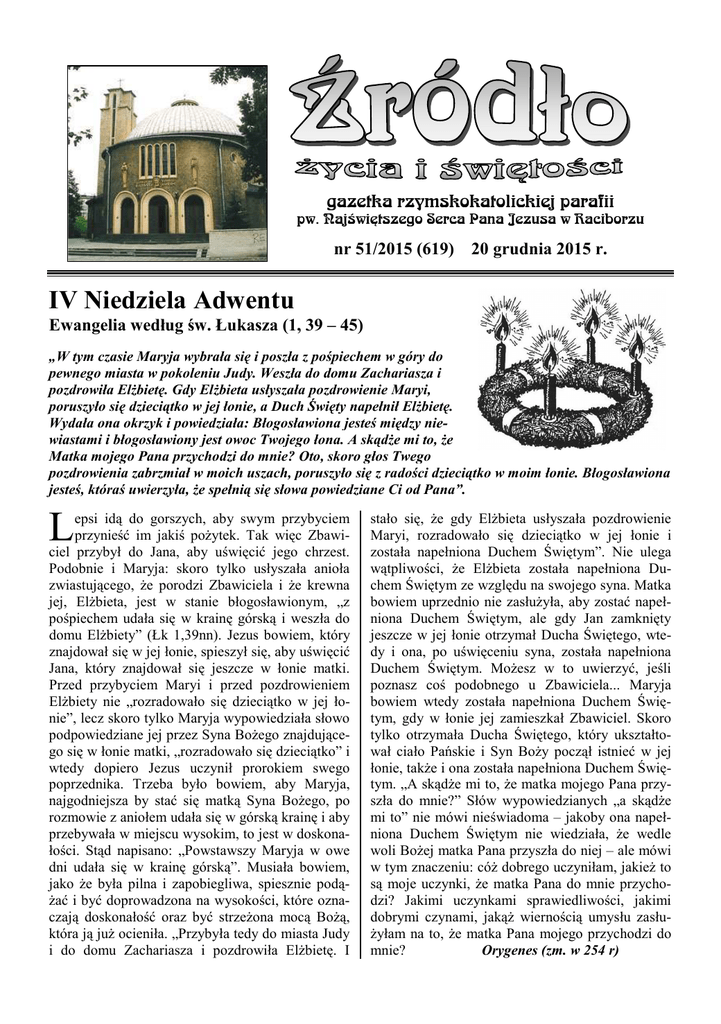 gazetka rzymskokatolickiej parafii pw. Najświętszego Serca Pana Jezusa w Raciborzu nr 51/2015 (619) 20 grudnia 2015 r. IV Niedziela Adwentu Ewangelia według św. Łukasza (1, 39 – 45) „W tym czasie Maryja wybrała się i poszła z pośpiechem w góry do pewnego miasta w pokoleniu Judy. Weszła do domu Zachariasza i pozdrowiła ElŜbietę. Gdy ElŜbieta usłyszała pozdrowienie Maryi, poruszyło się dzieciątko w jej łonie, a Duch Święty napełnił ElŜbietę. Wydała ona okrzyk i powiedziała: Błogosławiona jesteś między niewiastami i błogosławiony jest owoc Twojego łona. A skądŜe mi to, Ŝe Matka mojego Pana przychodzi do mnie? Oto, skoro głos Twego pozdrowienia zabrzmiał w moich uszach, poruszyło się z radości dzieciątko w moim łonie. Błogosławiona jesteś, któraś uwierzyła, Ŝe spełnią się słowa powiedziane Ci od Pana”. L epsi idą do gorszych, aby swym przybyciem przynieść im jakiś poŜytek. Tak więc Zbawiciel przybył do Jana, aby uświęcić jego chrzest. Podobnie i Maryja: skoro tylko usłyszała anioła zwiastującego, Ŝe porodzi Zbawiciela i Ŝe krewna jej, ElŜbieta, jest w stanie błogosławionym, „z pośpiechem udała się w krainę górską i weszła do domu ElŜbiety” (Łk 1,39nn). Jezus bowiem, który znajdował się w jej łonie, spieszył się, aby uświęcić Jana, który znajdował się jeszcze w łonie matki. Przed przybyciem Maryi i przed pozdrowieniem ElŜbiety nie „rozradowało się dzieciątko w jej łonie”, lecz skoro tylko Maryja wypowiedziała słowo podpowiedziane jej przez Syna BoŜego znajdującego się w łonie matki, „rozradowało się dzieciątko” i wtedy dopiero Jezus uczynił prorokiem swego poprzednika. Trzeba było bowiem, aby Maryja, najgodniejsza by stać się matką Syna BoŜego, po rozmowie z aniołem udała się w górską krainę i aby przebywała w miejscu wysokim, to jest w doskonałości. Stąd napisano: „Powstawszy Maryja w owe dni udała się w krainę górską”. Musiała bowiem, jako Ŝe była pilna i zapobiegliwa, spiesznie podąŜać i być doprowadzona na wysokości, które oznaczają doskonałość oraz być strzeŜona mocą BoŜą, która ją juŜ ocieniła. „Przybyła tedy do miasta Judy i do domu Zachariasza i pozdrowiła ElŜbietę. I stało się, Ŝe gdy ElŜbieta usłyszała pozdrowienie Maryi, rozradowało się dzieciątko w jej łonie i została napełniona Duchem Świętym”. Nie ulega wątpliwości, Ŝe ElŜbieta została napełniona Duchem Świętym ze względu na swojego syna. Matka bowiem uprzednio nie zasłuŜyła, aby zostać napełniona Duchem Świętym, ale gdy Jan zamknięty jeszcze w jej łonie otrzymał Ducha Świętego, wtedy i ona, po uświęceniu syna, została napełniona Duchem Świętym. MoŜesz w to uwierzyć, jeśli poznasz coś podobnego u Zbawiciela... Maryja bowiem wtedy została napełniona Duchem Świętym, gdy w łonie jej zamieszkał Zbawiciel. Skoro tylko otrzymała Ducha Świętego, który ukształtował ciało Pańskie i Syn BoŜy począł istnieć w jej łonie, takŜe i ona została napełniona Duchem Świętym. „A skądŜe mi to, Ŝe matka mojego Pana przyszła do mnie?” Słów wypowiedzianych „a skądŜe mi to” nie mówi nieświadoma – jakoby ona napełniona Duchem Świętym nie wiedziała, Ŝe wedle woli BoŜej matka Pana przyszła do niej – ale mówi w tym znaczeniu: cóŜ dobrego uczyniłam, jakieŜ to są moje uczynki, Ŝe matka Pana do mnie przychodzi? Jakimi uczynkami sprawiedliwości, jakimi dobrymi czynami, jakąŜ wiernością umysłu zasłuŜyłam na to, Ŝe matka Pana mojego przychodzi do mnie? Orygenes (zm. w 254 r) 2 Źródło - gazetka Poniedziałek – 21 grudnia 2015 Łk 1,39-45 630 Za †† ks. Jana Posta w rocznicę śmierci, jego rodziców i siostrę Marię 700 Dziękczynna w intencji Janusza Kyrcz z okazji 50. rocznicy urodzin o BoŜe błogosławieństwo i dalsze łaski dla całej rodziny 1730 Roraty 1. Za † Ŝonę Lillę Urych w 16. r. śmierci, †† rodziców z obu stron i †† pokrewieństwo 2. Za † Stefanię Bielak w 1. rocznicę śmierci Wtorek – 22 grudnia 2015 Łk 1,46-56 630 Za † Zbigniewa Kikina w 30. dzień po śmierci 800 W języku niemieckim: Zu Mutter Gottes der immerwährenden Hilfe aus Anlass des Geburtstages für Ehemann, Vater und Großvater Heinz Joachim um weitere Gesundheit, Zufriedenheit sowie Gottes Segen Z ok. ur. męŜa Kazimierza o łaskę, wiarę, BoŜe błogosławieństwo, opiekę Matki Najświętszej 900 1730 Roraty dla dzieci 1. Do BoŜej Opatrzności w intencji Ewy i Tadeusza z podziękowaniem za otrzymane łaski, z prośbą o zdrowie i opiekę Matki Boskiej na dalsze lata 2. Za † męŜa Piotra Paraczyńskiego w 2. r. śm. oraz rodziców z obu stron i dusze w czyśćcu cierpiące Środa – 23 grudnia 2015 Łk 1,57-66 630 Za † Ŝonę Marię w 4. rocznicę śmierci, jej † brata ks. Filipa Wolnik, †† rodziców, rodzeństwo i pokrewieństwo oraz dusze w czyśćcu cierpiące 700 Za † brata Andrzeja Durlak w rocz. śmierci, †† rodziców Anielę i Józefa i wszystkich †† z rodziny 1730 Roraty dla dzieci 1. Z okazji 40. rocznicy ślubu Stanisławy i Jana Rusin i za cała rodzinę z podziękowaniem za otrzymane łaski, z prośbą o dalsze BoŜe błogosławieństwo i zdrowie 2. Za †† męŜa Stanisława Pielczyk, synów Janusza i Andrzeja o spokój duszy Czwartek – 24 grudnia 2015 Łk 1,67-79 630 Za †† rodziców Zofię i Filipa Miczajka, szwagra Ludwika, teściów Łucję i Gerarda Jasny oraz dusze w czyśćcu cierpiące 700 Z okazji imienin ks. Proboszcza Adama Rogalskiego o BoŜe błogosławieństwo w pracy duszpasterskiej i opiekę Matki BoŜej (od Rycerstwa Niepokalanej) WIGILIA NARODZENIA PAŃSKIEGO 1530 Pasterka w intencji dzieci naszej parafii i wszystkich rodzin 2400 1. Pasterka w intencji Parafian 2. Do dzieciątka Jezus z podziękowaniem za otrzymane łaski w intencji rodziny Taszka, z prośbą o zdrowie i BoŜe błogosławieństwo