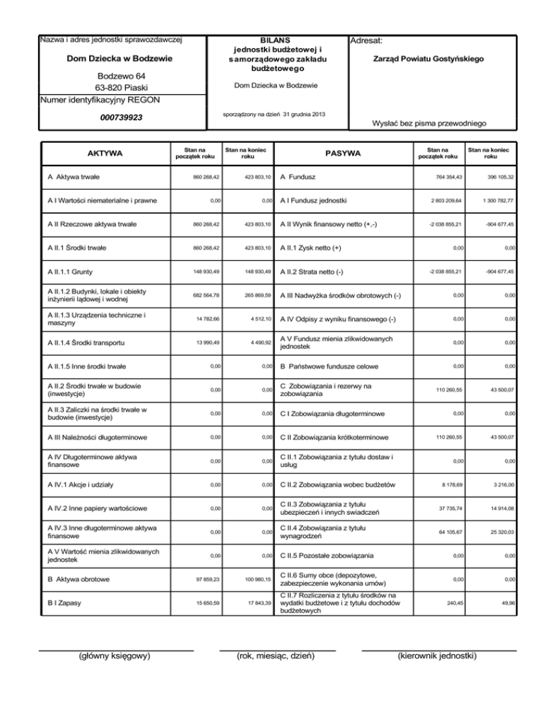 Nazwa i adres jednostki sprawozdawczej BILANS jednostki budżetowej i s amorządowego zakładu budżetowego Dom Dziecka w Bodzewie Bodzewo 64 63-820 Piaski Numer identyfikacyjny REGON A Aktywa trwałe Zarząd Powiatu Gostyńskiego Dom Dziecka w Bodzewie 000739923 AKTYWA Adresat: sporządzony na dzień 31 grudnia 2013 Stan na początek roku Stan na koniec roku Wysłać bez pisma przewodniego Stan na początek roku PASYWA A Fundusz Stan na koniec roku 860 268,42 423 803,10 0,00 0,00 A II Rzeczowe aktywa trwałe 860 268,42 423 803,10 A II Wynik finansowy netto (+,-) A II.1 Środki trwałe 860 268,42 423 803,10 A II.1 Zysk netto (+) A II.1.1 Grunty 148 930,49 148 930,49 A II.2 Strata netto (-) A II.1.2 Budynki, lokale i obiekty inżynierii lądowej i wodnej 682 564,78 265 869,59 A III Nadwyżka środków obrotowych (-) 0,00 0,00 A II.1.3 Urządzenia techniczne i maszyny 14 782,66 4 512,10 A IV Odpisy z wyniku finansowego (-) 0,00 0,00 A II.1.4 Środki transportu 13 990,49 4 490,92 A V Fundusz mienia zlikwidowanych jednostek 0,00 0,00 A II.1.5 Inne środki trwałe 0,00 0,00 B Państwowe fundusze celowe 0,00 0,00 A II.2 Środki trwałe w budowie (inwestycje) 0,00 0,00 C Zobowiązania i rezerwy na zobowiązania 110 260,55 43 500,07 A II.3 Zaliczki na środki trwałe w budowie (inwestycje) 0,00 0,00 C I Zobowiązania długoterminowe 0,00 0,00 A III Należności długoterminowe 0,00 0,00 C II Zobowiązania krótkoterminowe 110 260,55 43 500,07 A IV Długoterminowe aktywa finansowe 0,00 0,00 C II.1 Zobowiązania z tytułu dostaw i usług 0,00 0,00 A IV.1 Akcje i udziały 0,00 0,00 C II.2 Zobowiązania wobec budżetów 8 178,69 3 216,00 A IV.2 Inne papiery wartościowe 0,00 0,00 C II.3 Zobowiązania z tytułu ubezpieczeń i innych swiadczeń 37 735,74 14 914,08 A IV.3 Inne długoterminowe aktywa finansowe 0,00 0,00 C II.4 Zobowiązania z tytułu wynagrodzeń 64 105,67 25 320,03 A V Wartość mienia zlikwidowanych jednostek 0,00 0,00 C II.5 Pozostałe zobowiązania 0,00 0,00 B Aktywa obrotowe 97 859,23 100 980,15 C II.6 Sumy obce (depozytowe, zabezpieczenie wykonania umów) 0,00 0,00 B I Zapasy 15 650,59 17 843,39 240,45 49,96 A I Wartości niematerialne i prawne (główny księgowy) A I Fundusz jednostki 396 105,32 2 803 209,64 1 300 782,77 -2 038 855,21 -904 677,45 0,00 -2 038 855,21 C II.7 Rozliczenia z tytułu środków na wydatki budżetowe i z tytułu dochodów budżetowych (rok, miesiąc, dzień) 764 354,43 (kierownik jednostki) 0,00 -904 677,45 B I.1 Materiały 15 650,59 17 843,39 B I.2 Półprodukty i produkty w toku 0,00 0,00 B I.3 Produkty gotowe 0,00 B I.4 Towary C III Rezerwy na zobowiązania 0,00 0,00 D Fundusze specjalne 83 512,67 85 177,86 0,00 D 1 Zakładowy Fundusz Świadczeń Socjalnych 83 512,67 85 177,86 0,00 0,00 D 2 Inne fundusze 0,00 0,00 73 373,15 64 543,43 E Rozliczenia międzyokresowe 0,00 0,00 B II.1 Należności z tytułu dostaw i usług 0,00 0,00 E I Rozliczenia międzyokresowe przychodów 0,00 0,00 B II.2 Należności od budżetów 0,00 0,00 E II Inne rozliczenia międzyokresowe 0,00 0,00 B II.3 Należności z tytułu ubezpieczeń i innych świadczeń 0,00 0,00 73 373,15 64 543,43 0,00 0,00 8 835,49 18 593,33 0,00 0,00 8 835,49 18 593,33 B III.3 Środki pieniężne państwowego funduszu celowego 0,00 0,00 B III.4 Inne środki pieniężne 0,00 0,00 B III.5 Akcje lub udziały 0,00 0,00 B III.6 Inne papiery wartościowe 0,00 0,00 B III.7 Inne krótkoterminowe aktywa finansowe 0,00 0,00 B IV Rozliczenia międzyokresowe 0,00 0,00 958 127,65 524 783,25 958 127,65 524 783,25 B II Należności krótkoterminowe B II.4 Pozostałe należności B II.5 Rozliczenia z tytułu środków na wydatki budżetowe i z tytułu dochodów budżetowych B III Krótkoterminowe aktywa finansowe B III.1 Środki pieniężne w kasie B III.2 Środki pieniężne na rachunkach bankowych Suma aktywów Suma pasywów A. Objaśnienie - wykazane w bilansie wartości aktywów trwałych i obrotowych są pomniejszone odpowiednio o umorzenie i odpisy aktualizujące. B. Informacje uzupełniające istotne dla rzetelności i przejrzystości sytuacji finansowej i majątkowej: 1 2 3 4 5 6 7 Symbol Opis Umorzenie wartości niematerialnych i prawnych Umorzenie środków trwałych Umorzenie pozostałych środków trwałych Odpisy aktualizujące środki trwałe Odpisy aktualizujące środki trwałe w budowie Odpisy aktualizujące wartości niematerialne i prawne Odpisy aktualizujące należności (główny księgowy) (rok, miesiąc, dzień) Wartość 750,00 46 485,16 210 357,30 0,00 0,00 0,00 0,00 (kierownik jednostki) Opis sprawozdania (główny księgowy) (rok, miesiąc, dzień) (kierownik jednostki)