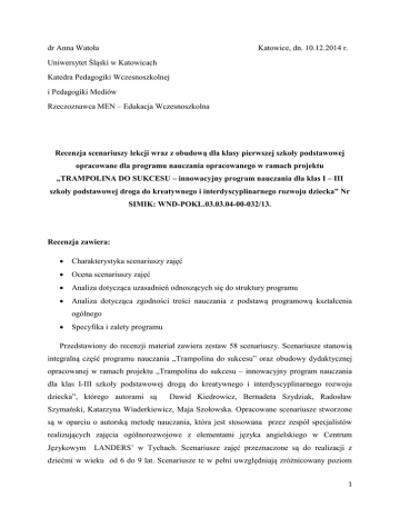 dr Anna Watoła Katowice, dn. 10.12.2014 r. Uniwersytet Śląski w Katowicach Katedra Pedagogiki Wczesnoszkolnej i Pedagogiki Mediów Rzeczoznawca MEN – Edukacja Wczesnoszkolna Recenzja scenariuszy lekcji wraz z obudową dla klasy pierwszej szkoły podstawowej opracowane dla programu nauczania opracowanego w ramach projektu „TRAMPOLINA DO SUKCESU – innowacyjny program nauczania dla klas I – III szkoły podstawowej droga do kreatywnego i interdyscyplinarnego rozwoju dziecka” Nr SIMIK: WND-POKL.03.03.04-00-032/13. Recenzja zawiera: Charakterystyka scenariuszy zajęć Ocena scenariuszy zajęć Analiza dotycząca uzasadnień odnoszących się do struktury programu Analiza dotycząca zgodności treści nauczania z podstawą programową kształcenia ogólnego Specyfika i zalety programu Przedstawiony do recenzji materiał zawiera zestaw 58 scenariuszy. Scenariusze stanowią integralną część programu nauczania „Trampolina do sukcesu” oraz obudowy dydaktycznej opracowanej w ramach projektu „Trampolina do sukcesu – innowacyjny program nauczania dla klas I-III szkoły podstawowej drogą do kreatywnego i interdyscyplinarnego rozwoju dziecka”, którego autorami są Dawid Kiedrowicz, Bernadeta Szydziak, Radosław Szymański, Katarzyna Wiaderkiewicz, Maja Szołowska. Opracowane scenariusze stworzone są w oparciu o autorską metodę nauczania, która jest stosowana przez zespół specjalistów realizujących zajęcia ogólnorozwojowe z elementami języka angielskiego w Centrum Językowym LANDERS’ w Tychach. Scenariusze zajęć przeznaczone są do realizacji z dziećmi w wieku od 6 do 9 lat. Scenariusze te w pełni uwzględniają zróżnicowany poziom 1 rozwoju dzieci, który jest szczególnie istotny w wieku przedszkolnym i młodszym wieku szkolnym. Zestaw scenariuszy podzielony jest na 16 bloków tematycznych. Pierwszy blok tematyczny zatytułowano: „Nowi przyjaciele”. W ramach pierwszego bloku uwzględniono następujące tematy: Poznajemy Tinę i Toma – witamy się z postaciami. Wiem, kim jestem – tworzymy portfolio. Podajmy sobie dłonie – uczymy się powitań Poznajemy Wielką Brytanię – zapoznanie z różnicami kulturowymi. Jesteśmy uprzejmi – uczymy się zwrotów grzecznościowych. Liczymy kolory – uczymy się liczyć oraz poznajemy kolory Scenariusze zawarte w tym bloku tematycznym stanowią szczególnie istotny element procesu nauczania-uczenia się, gdyż dotyczą początkowej fazy wprowadzania dziecka w świat uczenia się czegoś nowego, w nowym środowisku, z nowymi dziećmi i nauczycielami. Autorzy programu poza celami operacyjnymi, ze szczególną troską zadbali o uwzględnienie celów wychowawczych związanych z procesem integracji zespołu klasowego, kształtowania właściwych postaw i systemu wartości, uczenie kultury zachowania, tolerancji i szacunku dla innych ludzi i kultur, kształtowanie aktywnego udziału w zajęciach, kształtowanie odpowiedzialności za bezpieczeństwo własne i innych. Ten blok scenariuszy uwzględnia ważny element procesu uczenia się małych dzieci, bowiem budzi dziecięcą ciekowość, jest w swej treści interesujący, zaspokaja potrzeby poznawcze dostosowane do zróżnicowanych właściwości psychofizycznych dzieci. Kolejne cztery bloki tematyczne to: Nasza nowa klasa W moim plecaku – poznajemy zawartość plecaka Tina zgubiła telefon – poznajemy relacje przestrzenne W drodze do szkoły Chodźmy do szkoły – poznajemy elementy ruchu drogowego. Bezpieczna droga do szkoły – zapoznajemy się z czasownikami wskazującymi drogę. Bezpieczeństwo z gościem specjalnym – powtórka wiadomości 2 Jesienny przyjaciel Tiny Twarz przyjaciela – poznajemy części ciała – głowa. Od stóp do głów – poznajemy części ciała. Mój przyjaciel potwór – utrwalamy nazwy części ciała. Halloween. Poznajemy dom Tiny Tworzymy rodzinny album – nazywamy członków rodziny Odwiedziny w domu Tiny – nazywamy domowe pomieszczenia Zabawa w chorego – używamy przyimka in Powyższe tematy z punktu widzenia prawidłowości rozwojowych małych dzieci gwarantują dalsze pobudzanie i rozwijanie zainteresowań dziecięcych, co umożliwia dzieciom aktywny udział w zaplanowanych przez nauczyciela działaniach. Następne bloki tematyczne: Świat po drugiej stronie drzwi Na świeżym powietrzu – opowiadamy o miejscach, w których warto spędzać czas Jak pięknie wokół mnie – nazywamy elementy środowiska naturalnego Jak postrzegamy świat wkoło nas – nazywamy zmysły Bezpieczeństwo w sieci – poznajemy zasady korzystania z Internetu Nadchodzi czas zimy Odwiedziny Pani Zimy – poznajemy oznaki zimy. Mikołaj – zapoznajemy się z elementami ubioru. Chora Tina – uzupełniamy słownictwo związane z ubiorem Święta Bożego Narodzenia – poznajemy tradycje Bożego Narodzenia Bal za siedmioma górami... – identyfikujemy postacie z literatury. Zaproszenie na przyjęcie Urodziny Toma – celebrujemy urodziny Toma. Organizujemy wielkie przyjęcie – poznanie słownictwa związanego z owocami Na półce z zabawkami – poznajemy nazwy zabawek 3 Jak szybko płynie czas Dzień Babci i Dziadka – tworzymy życzenia okolicznościowe. Tinę dopadła nuda – poznajemy czynności czasu wolnego. Potrafię robić wiele rzeczy – określamy czynności, które potrafimy robić. Dźwięki wokół nas Perkusja Toma – zapoznajemy się z instrumentami muzycznymi Tom gra na perkusji. A ty? - pytamy się o umiejętność grania na instrumentach Naucz mnie grać – tworzymy przeczenia za pomocą czasownika can. Festiwal dźwięków – porządkujemy wiadomości o instrumentach Tajemniczy ogród Lubię zielone miejsca – poznajemy nazwy elementów środowiska naturalnego Skarb w ogrodzie – poznajemy nowe przyimki miejsca Powitajmy wiosnę Tematy realizowane w ramach kolejnych sześciu bloków tematycznych w dalszym ciągu uwzględniają obszary związane z poznawaniem i rozumieniem siebie i otaczającego dzieck