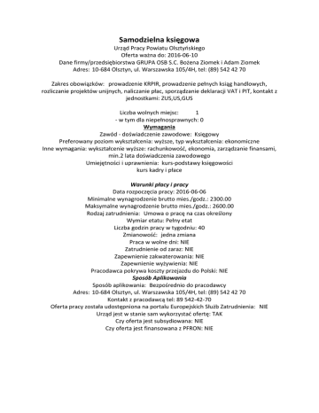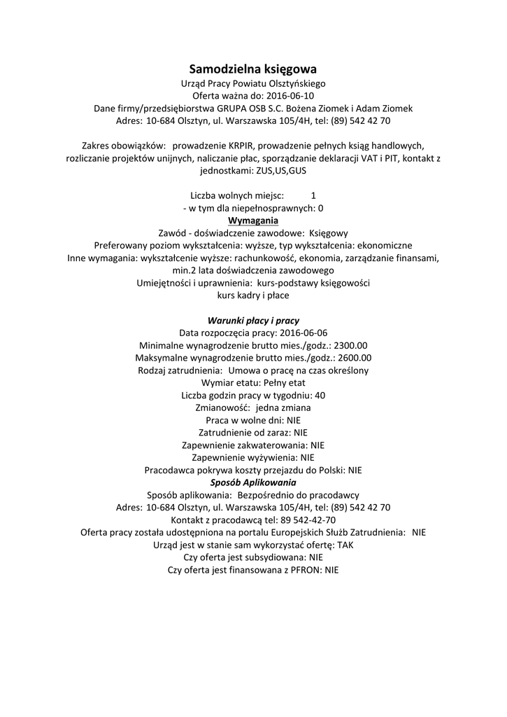 Samodzielna księgowa Urząd Pracy Powiatu Olsztyńskiego Oferta ważna do: 2016-06-10 Dane firmy/przedsiębiorstwa GRUPA OSB S.C. Bożena Ziomek i Adam Ziomek Adres: 10-684 Olsztyn, ul. Warszawska 105/4H, tel: (89) 542 42 70 Zakres obowiązków: prowadzenie KRPIR, prowadzenie pełnych ksiąg handlowych, rozliczanie projektów unijnych, naliczanie płac, sporządzanie deklaracji VAT i PIT, kontakt z jednostkami: ZUS,US,GUS Liczba wolnych miejsc: 1 - w tym dla niepełnosprawnych: 0 Wymagania Zawód - doświadczenie zawodowe: Księgowy Preferowany poziom wykształcenia: wyższe, typ wykształcenia: ekonomiczne Inne wymagania: wykształcenie wyższe: rachunkowość, ekonomia, zarządzanie finansami, min.2 lata doświadczenia zawodowego Umiejętności i uprawnienia: kurs-podstawy księgowości kurs kadry i płace Warunki płacy i pracy Data rozpoczęcia pracy: 2016-06-06 Minimalne wynagrodzenie brutto mies./godz.: 2300.00 Maksymalne wynagrodzenie brutto mies./godz.: 2600.00 Rodzaj zatrudnienia: Umowa o pracę na czas określony Wymiar etatu: Pełny etat Liczba godzin pracy w tygodniu: 40 Zmianowość: jedna zmiana Praca w wolne dni: NIE Zatrudnienie od zaraz: NIE Zapewnienie zakwaterowania: NIE Zapewnienie wyżywienia: NIE Pracodawca pokrywa koszty przejazdu do Polski: NIE Sposób Aplikowania Sposób aplikowania: Bezpośrednio do pracodawcy Adres: 10-684 Olsztyn, ul. Warszawska 105/4H, tel: (89) 542 42 70 Kontakt z pracodawcą tel: 89 542-42-70 Oferta pracy została udostępniona na portalu Europejskich Służb Zatrudnienia: NIE Urząd jest w stanie sam wykorzystać ofertę: TAK Czy oferta jest subsydiowana: NIE Czy oferta jest finansowana z PFRON: NIE