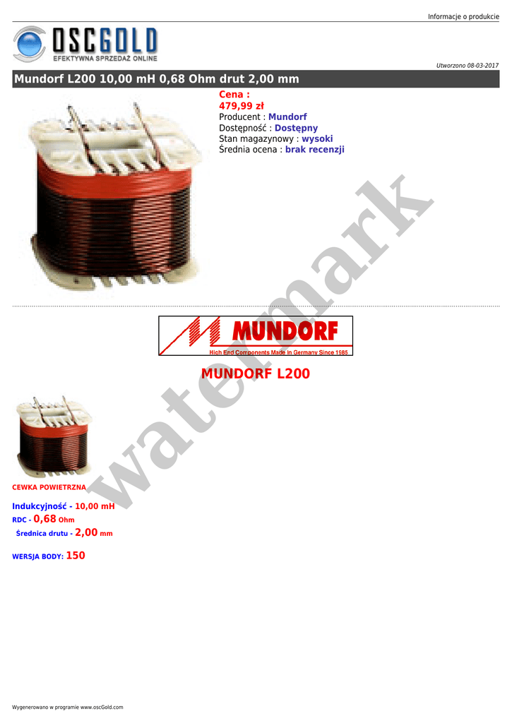 Informacje o produkcie Utworzono 08-03-2017 Mundorf L200 10,00 mH 0,68 Ohm drut 2,00 mm Cena : 479,99 zł er m ar k Producent : Mundorf Dostępność : Dostępny Stan magazynowy : wysoki Średnia ocena : brak recenzji w at MUNDORF L200 CEWKA POWIETRZNA Indukcyjność - 10,00 mH RDC - 0,68 Ohm Średnica drutu WERSJA BODY: 2,00 mm 150 Wygenerowano w programie www.oscGold.com er m ar k Cewki powietrzne firmy Mundorf, są uznawane za jedne z najlepszych cewek na świecie. Do produkcji używa się drutu miedzianego o dużej czystości, przez co mają bardzo dobre właściwości, aby stosować je w zwrotnicach systemów audio. Dźwięk jest szybki dynamiczny z dużą ilością detali i dobrą przestrzenią. MUNDORF-a SĄ LEPSZE? at DLACZEGO CEWKI Przepływający przez cewkę prąd elektryczny powoduje drgania drutu. Im większa średnica drutu tym większa eliminacja drgań. Jednakże cewki powietrzne nie posiadają w swoim wnętrzu żadnego karkasu dlatego są bardzo mocno podatne na drgania i efekt mikrofonowania, które to mają negatywny wpływ na brzmienie, ponieważ dodają składowe do toru muzycznego. w Mundorf znalazł rozwiązanie tego problemu, cewki powietrzne nawinięte są na stabilny karkas z ABS-u który bardzo mocno eliminuje drgania, a cewka dalej pozostaje powietrzna. Ciasne i stabilne nawijanie ma również na to wpływ, dlatego cewki firmy Mundorf są synonimem jakości na całym świecie. Dodatkowo w ofercie Mundorfa są cewki spiekane, w których dodatkowo drut pokryty jest kolejną termospiekalną warstwą lakieru która w procesie przepływu prądu elektrycznego łączy ze sobą uzwojenia, powodując dużą eliminację zakłóceń. Idąc jeszcze dalej cewki z największą eliminacji zakłóceń, są impregnowane próżniowo a potem suszone w 130 Stopniach Celsjusza. Takie cewki charakteryzują się niesamowitą przestrzenią oraz dynamiką grania.