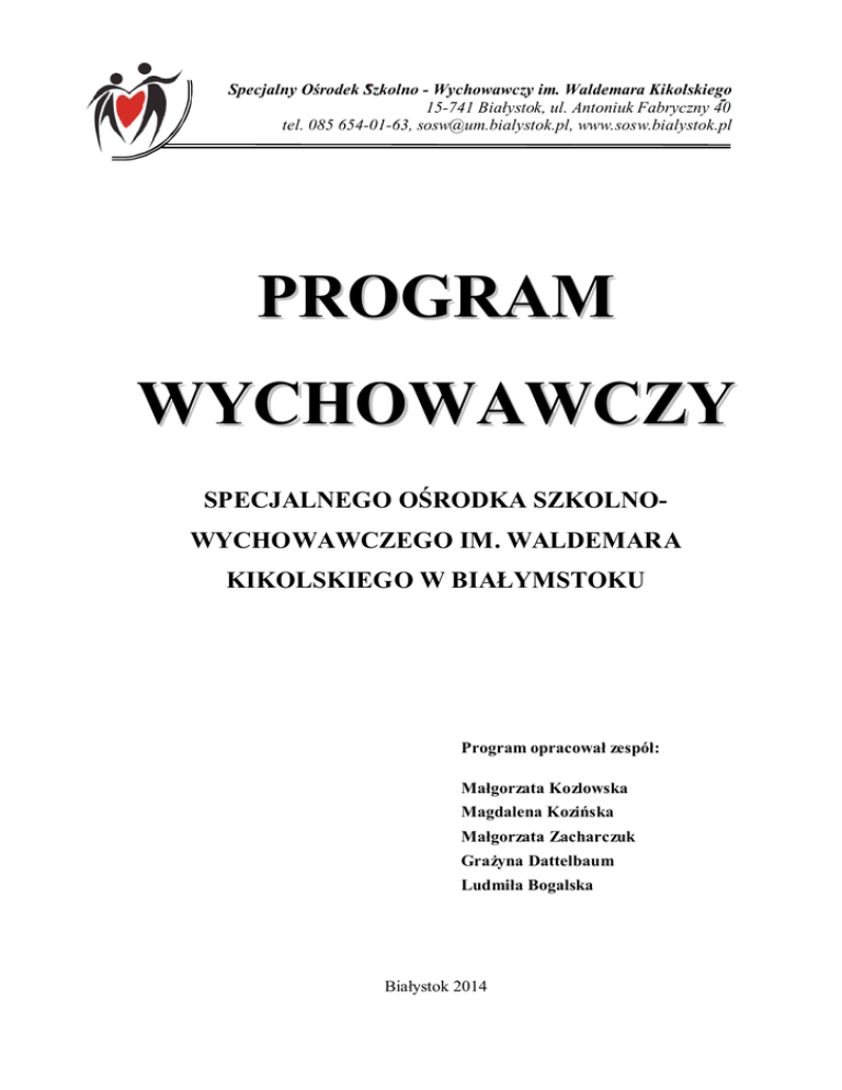 Specjalny Ośrodek Szkolno - Wychowawczy im. Waldemara Kikolskiego 15-741 Białystok, ul. Antoniuk Fabryczny 40 tel. 085 654-01-63, [email protected], www.sosw.bialystok.pl PROGRAM WYCHOWAWCZY SPECJALNEGO OŚRODKA SZKOLNOWYCHOWAWCZEGO IM. WALDEMARA KIKOLSKIEGO W BIAŁYMSTOKU Program opracował zespół: Małgorzata Kozlowska Magdalena Kozińska Małgorzata Zacharczuk Grażyna Dattelbaum Ludmiła Bogalska Białystok 2014 Podstawy prawne 1. Ustawa z dnia 7 września 1991 r. o systemie oświaty (Dz. U. z 2004 r. Nr 256, poz.2572, z późn. zm.); 2. Ustawa z dnia 26 stycznia 1982 r. Karta Nauczyciela (Dz. U. z 2006 r. Nr 97, poz. 674, z późn. zm); 3. Rozporządzenie Ministra Edukacji Narodowej z dnia 27.08.2012 r. w sprawie podstawy programowej wychowania przedszkolnego oraz kształcenia ogólnego w poszczególnych typach szkół (Dz. U. z 2012 r., poz. 997) 4. Rozporządzenie Ministra Edukacji Narodowej i Sportu z dnia 21 maja 2001 r. w sprawie ramowych statutów publicznego przedszkola oraz publicznych szkół (Dz.U. Nr 61 poz. 624, z 2002 r. Dz.U. Nr 10 poz. 96; z 2003 r. Dz.U. Nr 146 poz. 1416; z 2004 r. Nr 66 poz. 606;z 2005 r. Dz. U. Nr 10 poz. 75; z 2007 r. Dz. U. Nr 35 poz. 222) 5. Rozporządzenie Ministra Edukacji Narodowej i Sportu z dnia 7 marca 2005 r. w sprawie ramowych statutów placówek publicznych (Dz. U. Nr 52, poz. 466); 6. Rozporządzenie Ministra Edukacji Narodowej z dnia 17 listopada 2010 r. w sprawie warunków organizowania kształcenia, wychowania i opieki dla dzieci i młodzieży niepełnosprawnych oraz niedostosowanych społecznie w specjalnych przedszkolach, szkołach i oddziałach oraz w ośrodkach (Dz. U. Nr 228, poz. 1489 z późn.zm.) 7. Rozporządzenie Ministra Edukacji Narodowej z dnia 30 kwietnia 2013 r. w sprawie zasad udzielania i organizacji pomocy psychologiczno-pedagogicznej w publicznych przedszkolach, szkołach i placówkach (Dz. U. 2013 nr 0 poz. 532) 8. Powszechna Deklaracja Praw Człowieka z 10 grudnia 1948 r. 9. Europejska Konwencja o Ochronie Praw Człowieka i Podstawowych Wolności z Deklaracja Praw Dziecka z 1959 r. 10. Konwencja o Prawach Dziecka Narodów Zjednoczonych z 20 listopada 1989 r. 11. Konstytucja Rzeczypospolitej Polskiej z 1997 r. (art. 48, 53, 70) 12. Program Polityki Prorodzinnej Państwa z 17.11.1998 r. 13. Deklaracja Praw Osób Upośledzonych Umysłowo 14. Europejskiej Karty Praw Człowieka z 4 listopada 1950 r.; 15. Ramowy Program Wychowawczy Miasta Białegostoku, Białystok 2014 2 SPIS TREŚCI Rozdział I Informacje ogólne Rozdział II Cele ogólne Rozdział III Wartości wychowawcze, do których osiągnięcia, poszanowania i przestrzegania powinni zmierzać wychowankowie Rozdział IV Zadania osób odpowiedzialnych za realizację programu Rozdział V Cele wychowawcze Samorządu Wychowanków Rozdział VI Obyczaje i tradycje. Stałe uroczystości o charakterze wychowawczym i kulturalnym. Rozdział VII Obszary działań, zadania i formy realizacji Rozdział VIII Wizja absolwenta Rozdział IX Ewaluacja 3 I Informacje ogólne 1.Informacje o placówce Specjalny Ośrodek Szkolno -Wychowawczy w Białymstoku przy ul. Antoniuk Fabryczny 40 został powołany decyzją wojewody w Białymstoku z dnia 15.09.1997 r. Powstał w wyniku połączenia dwóch posiadających wieloletnie tradycje placówek: Specjalnego Ośrodka Szkolno-Wychowawczego w Kamionce i Specjalnego Ośrodka Szkolno- Wychowawczego funkcjonującego w Zespole Placówek Opiekuńczo-Wychowawczych w Białymstoku przy ul. Orlej 2. Wychowankowie i pracownicy obu placówek przenieśli się do nowej siedziby przy ul. Antoniuk Fabryczny w lutym 1998 r. Celem powołania Ośrodka jest opieka nad dziećmi z niepełnosprawnością intelektualną w stopniu lekkim, umiarkowanym i znacznym oraz za zgodą organu prowadzącego głębokim. Struktura Ośrodka prezentuje się następująco: • Szkoła Podstawowa Specjalna dla uczniów z niepełnosprawnością intelektualną w stopniu lekkim, umiarkowanym i znacznym • Publiczne Gimnazjum Nr 24 dla dzieci z niepełnosprawnością intelektualną w stopniu lekkim oraz umiarkowanym i znacznym • Internat z blokiem żywienia: • Zespoły rewalidacyjno - wychowawcze Wychowankowie Ośrodka mają możliwość rozwijania swoich zainteresowań i zdobywania wiedzy niezbędnej w procesie edukacyjnym w następujących pracowniach specjalistycznych: − pracownia plastyczna − pracownia w drewnie − pracownia gospodarstwa domowego − pracownia informatyczna − pracownia muzyczna − pracownia teatralna − pracownia ceramiczna − sala rekreacyjna − blok rehabilitacyjny − pracownia terapii Integracji Sensorycznej 4 − pracownia Tomatisa − biblioteka 2. Informacje o programie Niniejszy program jest modyfikacją programu przyjętego do realizacji w rok. szk. 2013/2014 Jego podstawowe założenia i zadania szczegółowe zostały sformułowane w oparciu o: − podstawę programową kształcenia ogólnego, − wnioski i opinie formułowane przez pracowników pracujących w SOSW, − wyniki sprawowanego nadzoru pedagogicznego, − priorytetów Ministra Edukacji Narodowej oraz Podlaskiego Kuratora Oświaty, − ewaluację ilościową dotychczasowego programu, zapisy w dziennikach lekcyjnych, sprawozdania wychowawców klas i grup internatowych. − Raport z ewaluacji wewnętrznej przeprowadzonej w SOSW im. W. Kikolskiego w Białymstoku w roku szkolnym 2013/2014 − Ramowy program Wychowawczy Miasta Białegostoku, Białystok 2014 − Działania kierunkowe Prezydenta Miasta Białegostoku: rok 2014 „Być sobą, aby być kimś”, rok 2015 „Miłość i odpowiedzialność” − Kierunki polityki oświatowej Ministra Edukacji Narodowej 3. Założenia ogólne Program Wychowawczy kierowany jest do pracy z dzieckiem niepełnosprawnym, objętym programem nauczania na odpowiednim etapie kształcenia i dostosowany do możliwości psychofizycznych dziecka. Zadania programu są zgodne z podstawą programową i realizowane będą na wszystkich zajęciach szkol