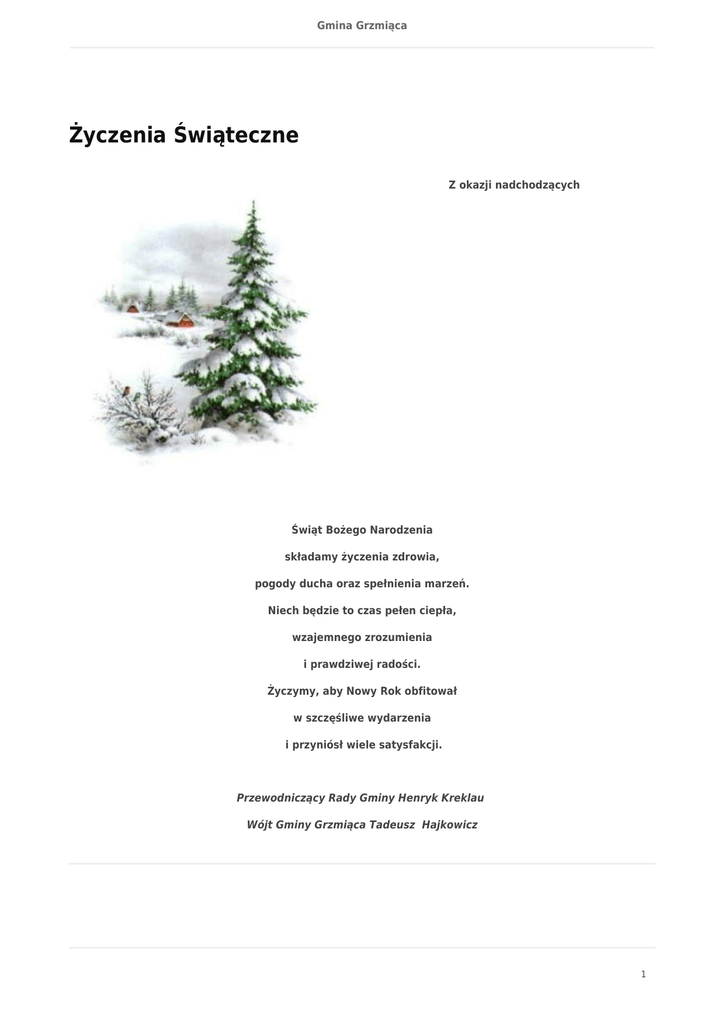 Gmina Grzmiąca Życzenia Świąteczne Z okazji nadchodzących Świąt Bożego Narodzenia składamy życzenia zdrowia, pogody ducha oraz spełnienia marzeń. Niech będzie to czas pełen ciepła, wzajemnego zrozumienia i prawdziwej radości. Życzymy, aby Nowy Rok obfitował w szczęśliwe wydarzenia i przyniósł wiele satysfakcji. Przewodniczący Rady Gminy Henryk Kreklau Wójt Gminy Grzmiąca Tadeusz Hajkowicz 1