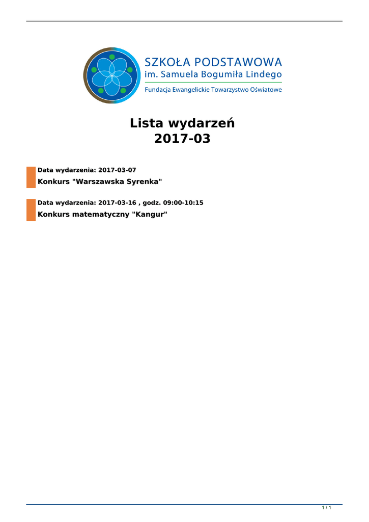 Lista wydarzeń 2017-03 Data wydarzenia: 2017-03-07 Konkurs "Warszawska Syrenka" Data wydarzenia: 2017-03-16 , godz. 09:00-10:15 Konkurs matematyczny "Kangur" 1/1 Powered by TCPDF (www.tcpdf.org) Powered by TCPDF (www.tcpdf.org)