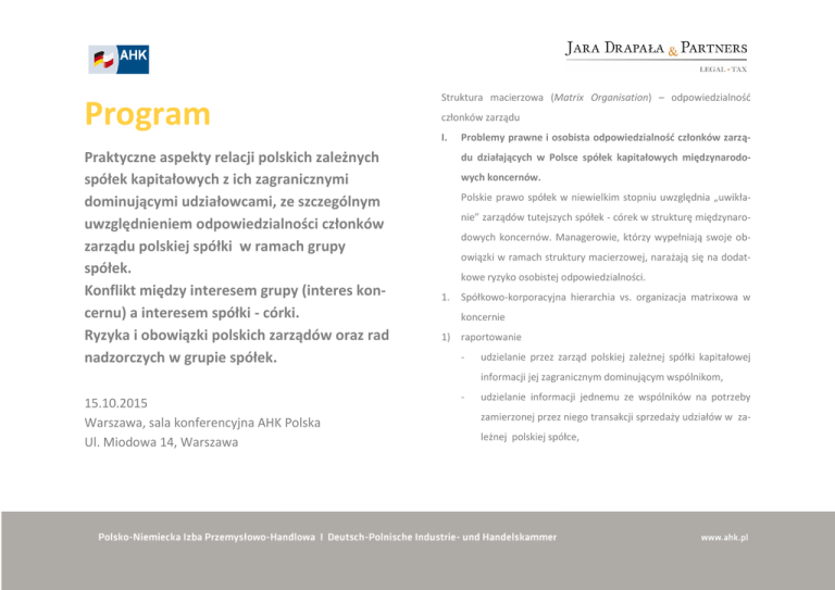 Program Praktyczne aspekty relacji polskich zależnych spółek kapitałowych z ich zagranicznymi dominującymi udziałowcami, ze szczególnym uwzględnieniem odpowiedzialności członków zarządu polskiej spółki w ramach grupy spółek. Konflikt między interesem grupy (interes koncernu) a interesem spółki - córki. Ryzyka i obowiązki polskich zarządów oraz rad nadzorczych w grupie spółek. Struktura macierzowa (Matrix Organisation) – odpowiedzialność członków zarządu I. Problemy prawne i osobista odpowiedzialność członków zarządu działających w Polsce spółek kapitałowych międzynarodowych koncernów. Polskie prawo spółek w niewielkim stopniu uwzględnia „uwikłanie” zarządów tutejszych spółek - córek w strukturę międzynarodowych koncernów. Managerowie, którzy wypełniają swoje obowiązki w ramach struktury macierzowej, narażają się na dodatkowe ryzyko osobistej odpowiedzialności. 1. Spółkowo-korporacyjna hierarchia vs. organizacja matrixowa w koncernie 1) raportowanie - udzielanie przez zarząd polskiej zależnej spółki kapitałowej informacji jej zagranicznym dominującym wspólnikom, 15.10.2015 Warszawa, sala konferencyjna AHK Polska Ul. Miodowa 14, Warszawa - udzielanie informacji jednemu ze wspólników na potrzeby zamierzonej przez niego transakcji sprzedaży udziałów w zależnej polskiej spółce, - udzielanie informacji w ramach raportowania w grupie spó- - łek (w tym compliance) do podmiotów dominujących lub powiązanych ze wspólnikiem, 2) wiążące polecenia z „centrali” - charakter wiążących poleceń wydawanych zarządowi przez odpowiedzialność wobec wspólnika (koncernu) za nieprzestrzeganie wewnątrz-koncernowych zasad (zarządzeń) - odpowiedzialność organizacyjna (odwołanie z funkcji) - odpowiedzialność wobec spółki – actio pro socio 2) Odpowiedzialność wobec osób trzecich dominującego wspólnika zagranicznego oraz podmioty z nim - należyta staranność powiązane ( dedykowane do obsługi finansowej, administra- - terminowe złożenie wniosku o upadłość cyjnej, sprzedażowej). - odpowiedzialność za podatki i opłaty publiczne - odpowiedzialność na zasadach ogólnych (odpowiedzialność 3) outsourcing 4) restrukturyzacja działalności operacyjnej 5) cash pooling 6) pożyczka (upstream loan) i poręczenia na rzecz spółki - matki i innych spółek koncernu „przebijająca”) III. Matrix kontra prawo pracy lepsze wykorzystanie potencjału pracowników, z pominięciem problemów związanych z „transgranicznym” delego- 7) przystąpienie do długu waniem, przeniesieniem bądź udostępnieniem pracowników 8) zastaw na udziałach i ich know-how. II. Osobista i cywilna odpowiedzialność członków organów w or- Pracownicy są wprawdzie zatrudnieni u polskiego pracodaw- ganizacji matrixowej 1) Odpowiedzialność „wewnętrzna” cy, ale wykonują pracę (i polecenia) w ramach grup roboczych organizacji macierzowej koncernu w „transgranicznych” zespołach. Problem - Czy (formalny) pracodawca wykonuje (jeszcze) nadzór i funkcję Prelegent kierownicze (prawo udzielania poleceń) nad pracownikiem w strukturze matrixowej? - Czy członek zarządu może scedować swoje kompetencje jako pracodawca / kierownik zakładu pracy (art. 3 KP) na innego „przełożonego” w strukturze macierzowej koncernu? - Transfer danych osobowych pracowników? - Kto może udzielać poleceń służbowych, dokonywać oceny okresowej i wypowiadać umowę z pracownikiem? Zbigniew Jara specjalizuje się w doradztwie w zakresie prawa spółek, nabywania przedsiębiorstw (M&A), prawa handlowego, joint ventures, prawa kartelowego, a także w zakresie rozwoju i finansowania projektów. Swoje doświadczenie zawodowe zdobywał jako niemiecki adwokat (Rechtsanwalt) w latach 1994 - 1996 w Gurland & Lambsdorff we Frankfurcie nad Menem, w 1997 r. w Gleiss Lutz we Frankfurcie nad Menem, a w latach 1998 - 2005 w warszawskim biurze kancelarii Gleiss Lutz jako współzałożyciel i Partner Zarządzający. Od 2005 r. jest Partnerem Założycielem i Partnerem Zarządzającym w kancelarii JARA DRAPAŁA & PARTNERS w Warszawie. Projekty, które realizował dotyczyły wielu transakcji M&A oraz joint venture, m.in. kompleksowego doradztwa prawnego niemieckiemu właścicielowi przy restrukturyzacji, a następnie przy sprzedaży ponad 210 dyskontów (część operacyjna) na rzecz lidera na polskim rynku, kompleksowego doradztwa odnośnie struktury (SPV) i warunków współpracy (joint venture) niemieckiego koncernu z polskimi podmiotami w związku z budową fabryki fundamentów do morskich elektrowni wiatrowych. Doradzał także niemieckiemu koncernowi rolnemu przy restrukturyzacji, a następnie przy połączeniu kilkunastu spółek akcyjnych w Polsce. Zbigniew Jara jest członkiem Deutscher Anwaltverein. W latach 1996 - 1997 był wykładowcą w Szkole Prawa Niemieckiego na Uniwersytecie Warszawskim. Prowadzi liczne wykłady i szkolenia w ww. zakresie w kraju i za granicą. Autor licznych publikacji z zakresu prawa spółek i prawa handlowego oraz prawa kartelowego, m.in. na temat: wykonywania prawa głosu z udziałów/akcji; zaskarżania uchwał zgromadzeń wspólników/akcjonariuszy, reprezentowania spółki kapitałowej w umowach z członkami zarządu, obowiązku informacji i zachowania poufności w trakcie due diligence, wykupów menedżerskich (MBO) w spółkach akcyjnych, transgranicznych fuzji spółek. Redaktor i autor Komentarza do Kodeksu Spółek Handlowych wydawnictwa C.H. Beck w serii Duże Komentarze Becka, 2014 oraz w serii Komentarze Online, 2015, a także autor m.in. Polnisches Kartellrecht (pl.: Polskie prawo kartelowe) [w:] Handbuch des Wirtschaftsrechts in Osteuropa. Länderteil Polen, wyd. C.H. Beck, 2015 oraz Spółka akcyjna. Wzory dokumentów z komentarzem, wyd. Heymanns, 2004. Studia na Uniwersytetach we Wrocławiu i Frankfurcie nad Menem, Niemcy. Marcin Chomiuk specjalizuje się w doradztwie w zakresie praw