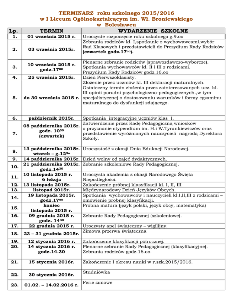 Lp. TERMINARZ roku szkolnego 2015/2016 w I Liceum Ogólnokształcącym im. Wł. Broniewskiego w Bolesławcu TERMIN WYDARZENIE SZKOLNE 1. 01 września 2015 r. 2. 03 września 2015r. 3. 4. 5. 6. 7. Uroczyste rozpoczęcie roku szkolnego g.9.oo Zebrania rodziców kl. I,spotkanie z wychowawcami,wybór Rad Klasowych i przedstawicieli do Prezydium Rady Rodziców (czwartek godz.17oo). Plenarne zebranie rodziców (sprawozdawczo-wyborcze). Spotkania wychowawców kl. II i III z rodzicami. Prezydium Rady Rodziców godz.16.oo 25 września 2015r. Dzień Pierwszoklasisty. Złożenie przez uczniów kl. III deklaracji maturalnych. Ostateczny termin złożenia przez zainteresowanych ucz. kl. III opinii poradni psychologiczno-pedagogicznych.,w tym do 30 września 2015 r. specjalistycznej o dostosowaniu warunków i formy egzaminu maturalnego do dysfunkcji zdającego. 10 września 2015 r. godz.1700 październik 2015r. Spotkania integracyjne uczniów klas I. Zatwierdzenie przez Radę Pedagogiczną wniosków 08 października 2015r. o przyznanie stypendium im. H.i W.Tyrankiewiczów oraz godz. 1030 przedstawienie wyróżnionych nauczycieli nagrodą Dyrektora (czwartek) Szkoły. 17. 13 października 2015r. wtorek – g.123o 14 października 2015r. 21 października 2015r. godz.1430 10 listopada 2015 r. 6 lekcja 13 listopada 2015r. listopad 2015r. 19 listopada 2015r. godz.17oo koniec listopada 2015 r. 09 grudnia 2015 r. godz. 1430 22 grudnia 2015 r. 18. 23 – 31 grudnia 2015r. 19. 20. 12 stycznia 2016 r. 14 stycznia 2016 r. godz.14.30 Zakończenie klasyfikacji półrocznej. Plenarne zebranie Rady Pedagogicznej (klasyfikacyjne). Zebrania rodziców godz.16.oo. 21. 15 stycznia 2016r. Zakończenie I okresu nauki w r.szk.2015/2016. 22. 30 stycznia 2016r. 23. 01.02. – 14.02.2016 r. 8. 9. 10. 11. 12. 13. 14. 15. 16. Uroczystość z okazji Dnia Edukacji Narodowej. Dzień wolny od zajęć dydaktycznych. Zebranie szkoleniowe Rady Pedagogicznej. Uroczysta akademia z okazji Narodowego Święta Niepodległości. Zakończenie próbnej klasyfikacji kl. I, II, III Międzynarodowy Dzień Języków Obcych. Spotkania wychowawców i nauczycieli kl.I,II,III z rodzicami – omówienie próbnej klasyfikacji. Próbna matura (język polski, język obcy, matematyka) Zebranie Rady Pedagogicznej (szkoleniowe). Uroczysty apel świąteczny – wigilijny. Zimowa przerwa świąteczna Studniówka Ferie zimowe 24. 25. 26. 27. 28. 29. 30. 31. 32. 33. 34. 35. 36. 37. 38. 39. 40. 41. 42. 43. 44. 45. 46. 47. Złożenie przez uczniów kl. I deklaracji wyboru przedmiotu rozszerzonego. Ogłoszenie harmonogramu części ustnej egz. maturalnego. początek marca 2016r. Powołanie PZE i ZN (S Z E). 09 marca 2016r. Zebranie Rady Pedagogicznej (szkoleniowe). godz.1430 17 marca 2016 r. Spotkania nauczycieli przedmiotów i wychowawców oo godz. 17 z rodzicami ucz. kl. III (wywiadówki g.17oo) 24. - 29.03.2016r. Wiosenna przerwa świąteczna. 21,22 kwietnia 2016r. Dni Otwarte Szkoły dla Gimnazjalistów 22 kwietnia 2016r. Zakończenie klasyfikacji klas III Zebranie Rady Pedagogicznej (klasyfikacyjne) podsumowujące pracę klas kończących w cyklu trzyletnim. 27 kwietnia 2016 r. Część szkoleniowa Rady Pedagogicznej: (środa) godz.1430 a) szkolenie SZE b) szkolenie PZE 28 kwietnia 2016r. Święto Narodowe 3 Maja – akademia – podsumowanie ruchu godz.12.30 olimpijskiego. 29 kwietnia 2016 r. Zakończenie nauki w klasach III LO, wręczenie świadectw oo godz.17 ukończenia szkoły. 02 maja 2016r. Dzień wolny od zajęć dydaktycznych. Dni wolne od zajęć dydaktycznych dla uczniów kl. I i II 4,5,6, maja 2016 r. (matura – język polski, matematyka, język angielski). 04 – 24 maja 2016r. Egzamin maturalny w części pisemnej. 04 –27 maja 2016 r. Egzamin maturalny w części ustnej. 27 maja 2016r. Dzień wolny od zajęć dydaktycznych. 02 czerwca 2016r. Spotkania nauczycieli przedmiotów i wychowawców kl.I i II godz.1700 z rodzicami (wywiadówki godz.17oo) czerwiec 2016 r. Dzień Samorządności. 17 czerwca 2016 r. Zakończenie rocznej klasyfikacji kl. I i II. Plenarne zebranie Rady Pedagogicznej (klasyfikacyjne) 22 czerwca 2016 r. I część obrad. godz.143o do 26 lutego 2016r. 24 czerwca 2016 r. godz. 9oo 28 czerwca 2016 r. godz.9.oo 05 lipca 2016 r. 29 sierpnia 2016 r. godz.9oo Zakończenie roku szkolnego 2015/2016. 30 sierpnia 2016 r. godz.9oo Plenarne zebranie Rady Pedagogicznej. Organizacja roku szkolnego 2016/2017. Podsumowujące zebranie Rady Pedagogicznej (II część obrad). Wydanie świadectw maturalnych. Egzaminy poprawkowe. (poniedziałek)