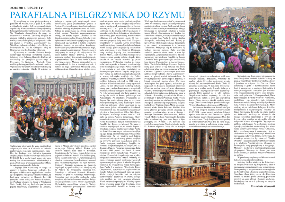 26.04.2011- 3.05.2011 r. PARAFIALNA PIELGRZYMKA DO RZYMU Wyruszyliśmy w trasę pielgrzymkową z parafii bł. M. Kozala 26.04. o godz. 3.30, każdy z żółtą chustę, abyśmy byli rozpoznawalni i nie zagubili się. W drodze odmawialiśmy tajemnicę bolesną różańca i śpiewaliśmy nawet po włosku. We Wrocławiu dołączyliśmy do grupy ze Skierniewic i Głowna. Zajęliśmy miejsca na górnym pokładzie piętrowego autokaru, było trochę ciasno, ale liczył się cel pielgrzymki i nikt nie myślał o wygodzie. Zapoznaliśmy się. Wśród nas było czterech księży - ks. Robert ze Świnoujścia, ks. Jan, ks. Grzegorz - obaj ze Skierniewic oraz ks. Stanisław z Głowna. Wyruszamy w kierunku Kudowy Zdroju odmawiając tajemnice chwalebne różańca. Jedziemy przez Polanicę, Duszniki, Kudowę aż docieramy do przejścia granicznego z Czechami. To Kudowa - Nachod. Tutaj mieliśmy dłuższy postój na kawę i małe co nieco Wjechaliśmy na teren Czech i kierowaliśmy się do granicy z Austrią. Około 19 jesteśmy w Trebicach na Morawach. To jedno z najbardziej zabytkowych miast w Czechach ze świetnie zachowanym zespołem staromiejskim. Bazylika św. Prokopa oraz dzielnica żydowska znajdują się na liście światowego dziedzictwa UNESCO. Tu w hotelu Grand mamy pierwszy nocleg. Po zakwaterowaniu i obiadokolacji o godz. 20.00 nasza grupa uczestniczyła we Mszy św. odprawianej przez ks. Roberta. Drugiego dnia wyruszamy w drogę ku granicy z Austrią. Śpiewamy godzinki. Ks. Grzegorz ze Skierniewic wygłosił nam katechezę o cierpieniu. Następnie poinformował nas, że będziemy zwiedzać w Rzymie bazyliki (bazylika - dom króla): św. Jana na Lateranie, św. Pawła za Murami, św. Piotra w Watykanie i Matki Boskiej Śnieżnej. Po drodze podziwiamy piękne krajobrazy, dojeżdżamy do Znojmo, jednego z najstarszych zabytkowych miast morawskich, gdzie przekraczamy granicę z Austrią. Czechy odbieramy jako kraj spokojny, niewiele różniący się krajobrazowo od Polski. Jednak po przejechaniu na stronę austriacką widać różnicę. Wszędzie zagospodarowane tereny, jest bardzo czysto. Zbliżamy się do Wiednia, mijamy dolinę Dunaju. Szkoda, że nie było czasu na zwiedzanie tego pięknego miasta. Przewodnik opowiedział o historii i kulturze Wiednia. Austria to przepiękne krajobrazy. Zachwyceni tym pięknem wzdychamy do Boga, gdyż jeszcze bardziej czujemy Jego obecność i dziękujemy, że stworzył taki piękny świat. Na trasie robimy krótkie przerwy, a czas w autokarze umilamy śpiewem i wsłuchujemy się w przemówienia Ojca św. Jana Pawła II, które chwytają za serce. Musimy zapamiętać to. co nam przekazał, bo jest w tym tyle mądrości i miłości do Boga i człowieka. Minęliśmy Graz, zbliżamy się do Klagenfurt, trasa wiedzie przez tunele w Alpach, których jest mnóstwo, one też zachwycają. Mijamy Villach. Piękno tych terenów zapiera nam dech w piersiach. Dojeżdżamy do Tarvisio - miasta leżącego na pograniczu Włoch i Austrii. Widzieliśmy góry, tunele (naliczyliśmy ich 38), teraz rozciąga się równina z winnicami, brzoskwiniami, sosnami pinia charakterystycznymi dla tych terenów. Omijamy Wenecję położoną na licznych bagnistych wyspach Adriatyku i kierujemy się na Padwę. Tu zwiedzamy Bazylikę Św. Antoniego z pięknymi freskami. Wewnątrz znajduje się grób św. Antoniego Padewskiego. Atmosfera jest niezwykle podniosła, pełna skupienia, słychać tylko szmer modlitw. Święty ten jest patronem osób i rzeczy zaginionych. Chyba każdy zna modlitwę - wierszyk: "Święty Antoni padewski/ pocieszycielu niebieski/ niech się stanie wola twoja/ niech się znajdzie zguba moja". W Padwie znajduje się rownież jeden z najstarszych uniwersytetów w Europie założony w 1222 r. O godz. 18.00 celebrowana jest Msza św. Po trudzie podróży podążamy w kierunku hotelu Sole( słońce) trasą Via adriatica do Rosoliny, gdzie nocowaliśmy. Rosolina Mare oddalona jest od Wenecji około 60 km i otoczona przyrodą delty rzeki Pad. Nazajutrz wyjeżdżamy w kierunku Loreto (wszystkim katolikom kojarzy się ono z litanią loretańską do Matki Bożej), gdzie znajduje się sanktuarium kultu maryjnego z tzw. Świętym Domkiem, który według legendy jest nazaretańskim domem Maryi. Miał on zostać przeniesiony z Nazaretu przez grecką rodzinę Angeli, która chciała w ten sposób uchronić go przed zniszczeniem. W Bazylice znajduje się wspaniała kaplica polska z freskami przedstawiającymi chwałę polskiego oręża. Papież Jan Paweł II po wyjściu z niej miał powiedzieć, że dostrzegł w tym miejscu "cząstkę swej Ojczyzny". Tuż za nią na trzech tarasach schodzących w stronę Adriatyku znajduje się Polski Cmentarz Wojenny, na którym spoczywa 1080 polskich żołnierzy poległych w 1944 roku w walkach. Wśród nich także ci, którzy wyzwalali Loreto. Na nim odmawiamy modlitwę za tych, którzy spoczywają w Loreto oraz za wszystkich polskich żołnierzy poległych na ziemi włoskiej. Po tych wzruszających chwilach jedziemy na nocleg do hotelu w Roseto położonego nad Adriatykiem. Po śniadaniu wyjeżdżamy do Rzymu. Na trasie mijamy góry ze szczytami pokrytymi śniegiem, który mieni się w słońcu pięknymi kolorami. Znów zaczynają się na trasie tunele, jeden z nich ma11 km. Pan Darek poinformował nas, że najdłuższy przecinający góry jest w Szwajcarii i ma 30 km. Wjeżdżamy do Rzymu - wiecznego miasta, które w 754 r. stało się stolicą Państwa Kościelnego. Mamy pozwolenie na wjazd autokarem do Placu św. Piotra. Nawiedzanie bazylik rozpoczynamy od Bazyliki św. Pawła za Murami. To jedna z czterech znajdujących się na terenie Rzymu i Watykanu. Miejsce pochówku świętego Pawła. Na dziedzińcu otoczonym kolumnami znajduje się jego posąg. Zniszczona przez pożar, została odbudowana. W jej wnętrzu pod łukiem tęczowym kończącym nawę główną znajduje się przykryty gotyckim baldachimem grób św. Pawła. Następnie nawi