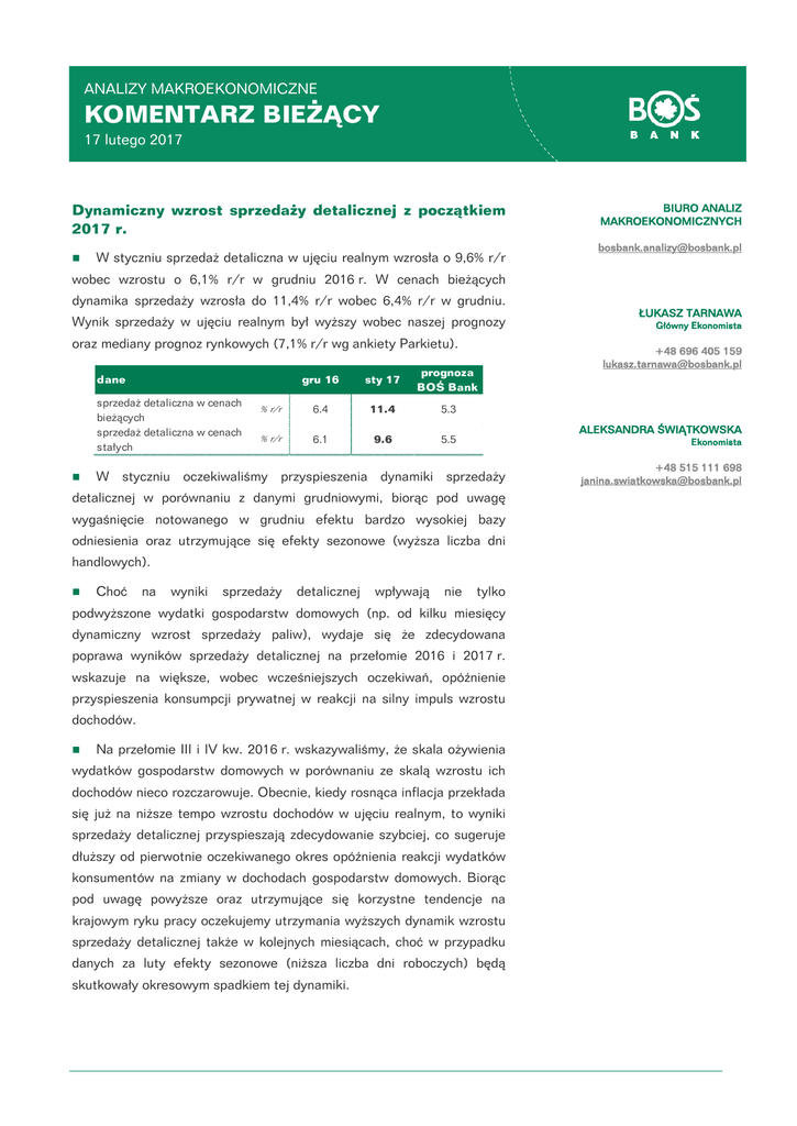 ANALIZY MAKROEKONOMICZNE KOMENTARZ BIEŻĄCY 17 lutego 2017 Dynamiczny wzrost sprzedaży detalicznej z początkiem 2017 r.  W styczniu sprzedaż detaliczna w ujęciu realnym wzrosła o 9,6% r/r BIURO ANALIZ MAKROEKONOMICZNYCH [email protected] wobec wzrostu o 6,1% r/r w grudniu 2016 r. W cenach bieżących dynamika sprzedaży wzrosła do 11,4% r/r wobec 6,4% r/r w grudniu. Wynik sprzedaży w ujęciu realnym był wyższy wobec naszej prognozy oraz mediany prognoz rynkowych (7,1% r/r wg ankiety Parkietu). gru 16 sty 17 prognoza BOŚ Bank % r/r 6.4 11.4 5.3 % r/r 6.1 9.6 5.5 dane sprzedaż detaliczna w cenach bieżących sprzedaż detaliczna w cenach stałych  wygaśnięcie notowanego w grudniu efektu bardzo wysokiej bazy odniesienia oraz utrzymujące się efekty sezonowe (wyższa liczba dni handlowych). na wyniki sprzedaży detalicznej wpływają nie tylko podwyższone wydatki gospodarstw domowych (np. od kilku miesięcy dynamiczny wzrost sprzedaży paliw), wydaje się że zdecydowana poprawa wyników sprzedaży detalicznej na przełomie 2016 i 2017 r. wskazuje na większe, wobec wcześniejszych oczekiwań, opóźnienie przyspieszenia konsumpcji prywatnej w reakcji na silny impuls wzrostu dochodów.  Na przełomie III i IV kw. 2016 r. wskazywaliśmy, że skala ożywienia wydatków gospodarstw domowych w porównaniu ze skalą wzrostu ich dochodów nieco rozczarowuje. Obecnie, kiedy rosnąca inflacja przekłada się już na niższe tempo wzrostu dochodów w ujęciu realnym, to wyniki sprzedaży detalicznej przyspieszają zdecydowanie szybciej, co sugeruje dłuższy od pierwotnie oczekiwanego okres opóźnienia reakcji wydatków konsumentów na zmiany w dochodach gospodarstw domowych. Biorąc pod uwagę powyższe oraz utrzymujące się korzystne tendencje na krajowym ryku pracy oczekujemy utrzymania wyższych dynamik wzrostu sprzedaży detalicznej także w kolejnych miesiącach, choć w przypadku danych za luty efekty sezonowe (niższa liczba dni roboczych) będą skutkowały okresowym spadkiem tej dynamiki. +48 696 405 159 [email protected] Ekonomista W styczniu oczekiwaliśmy przyspieszenia dynamiki sprzedaży Choć Główny Ekonomista ALEKSANDRA ŚWIĄTKOWSKA detalicznej w porównaniu z danymi grudniowymi, biorąc pod uwagę  ŁUKASZ TARNAWA +48 515 111 698 [email protected] Powyższe wnioski nie wpływają na średniookresowe  prognozy stopniowego wyhamowywania dynamiki spożycia gospodarstw domowych w II poł. 2017 r. (kiedy wpływ na dynamikę dochodów transferów w ramach programu „Rodzina 500+” będzie wygasał). Wskazują one natomiast na szansę na dalszy, silniejszy wzrost dynamiki konsumpcji prywatnej w I poł. 2017 r., co będzie dodatkowym czynnikiem wspierającym wzrost dynamiki PKB z początkiem 2017 r. W  kolejnych wspierającym kwartałach wyniki cały konsumpcji czas czynnikiem prywatnej będzie utrzymujący się trend poprawy sytuacji na rynku pracy. Jednocześnie jednak coraz silniej odczuwalnym hamulcem tej poprawy będzie silny wzrost inflacji CPI (ograniczający realną siłę nabywczą dochodów gospodarstw domowych). Kategorie sprzedaży detalicznej (ceny stałe) Dynamika sprzedaży detalicznej 18.0 w cenach bieżących w cenach stałych 30 żywność paliwa samochody po wykl. żywności, paliw i samochodów % r/r % r/r 12.0 15 6.0 0 0.0 -6.0 sty-09 sty-10 sty-11 sty-12 sty-13 sty-14 sty-15 sty-16 -15 sty-12 sty-17 Źródło: GUS wrz-12 maj-13 sty-14 wrz-14 maj-15 sty-16 wrz-16 Źródło: GUS, BOŚ Bank lut 16 mar 16 kwi 16 maj 16 cze 16 lip 16 sie 16 wrz 16 paź 16 lis 16 gru 16 sty 17 sprzedaż detaliczna w cenach bieżących % r/r 3.9 0.8 3.2 2.2 4.6 2.0 5.6 4.8 3.7 6.6 6.4 11.4 sprzedaż detaliczna w cenach stałych % r/r 6.2 3.0 5.5 4.3 6.5 4.4 7.8 6.3 4.6 7.4 6.1 9.6 źródło: G US WAŻNA INFORMACJA: Niniejszy materiał ma charakter prognozy, został opracowany wyłącznie w celu informacyjnym i nie może być traktowany jako doradztwo ani porada inwestycyjna. W szczególności nie może być traktowany jako oferta lub rekomendacja do zawierania jakichkolwiek transakcji. Nie jest to forma reklamy ani oferta sprzedaży jakiejkolwiek usługi oferowanej przez BOŚ Bank. Przedstawione w niniejszej publikacji opinie i prognozy są wyrazem niezależnej oceny autorów w momencie ich wydania i mogą ulec zmianie bez zapowiedzi. Informacje, w tym dane statystyczne, zawarte w materiale pochodzą z ogólnie dostępnych, wiarygodnych źródeł, jednak BOŚ Bank nie może zagwarantować ich dokładności i pełności. BOŚ Bank nie ponosi odpowiedzialności za skutki decyzji podjętych na podstawie informacji zawartych w niniejszym materiale. Niniejszy dokument stanowi własność BOŚ Bank. Materiał może być wykorzystywany do opracowań własnych pod warunkiem powołania się na źródło. Powielanie bądź publikowanie niniejszego raportu lub jego części bez pisemnej zgody BOŚ Bank jest zabronione. Bank Ochrony Środowiska Spółka Akcyjna z siedzibą w Warszawie przy ul. Żelaznej 32, 00-832 Warszawa, zarejestrowana w Sądzie Rejonowym dla m.st. Warszawy w Warszawie, XII Wydział Gospodarczy Krajowego Rejestru Sądowego pod nr KRS: 0000015525 NIP: 527-020-33-13; kapitał zakładowy: 628 732 450 zł wpłacony w całości. 2 2017-02-17