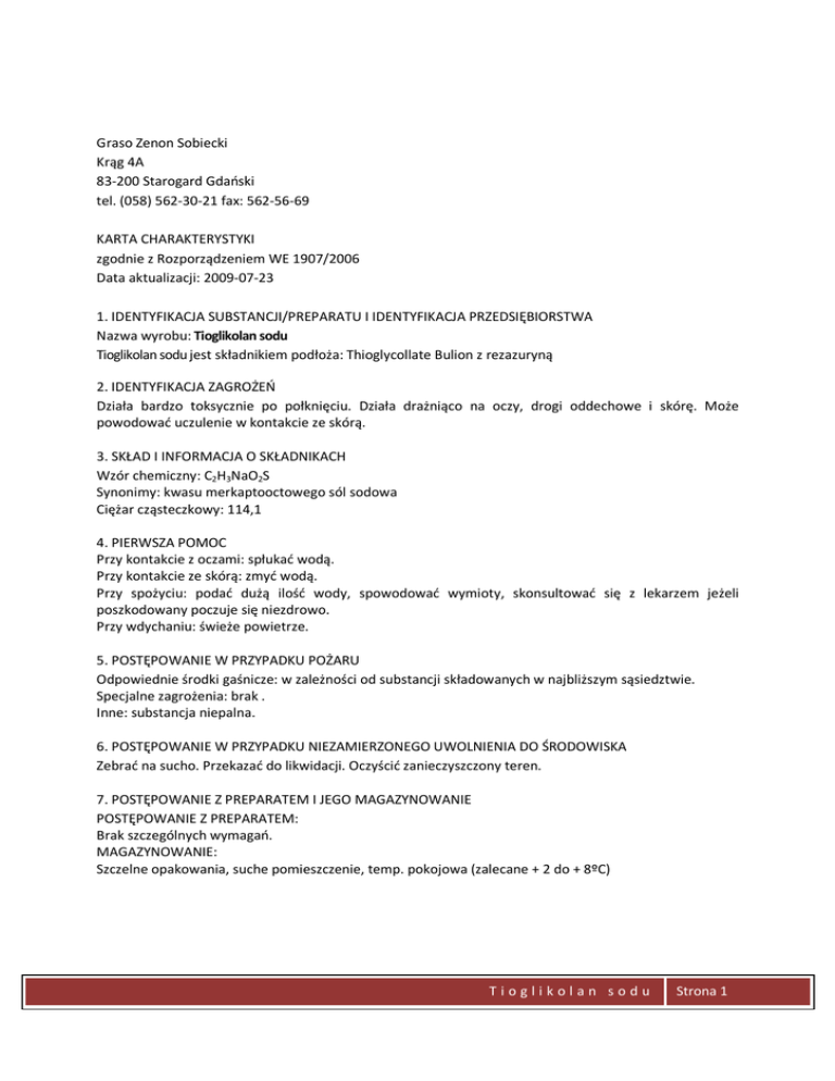 Graso Zenon Sobiecki Krąg 4A 83-200 Starogard Gdański tel. (058) 562-30-21 fax: 562-56-69 KARTA CHARAKTERYSTYKI zgodnie z Rozporządzeniem WE 1907/2006 Data aktualizacji: 2009-07-23 1. IDENTYFIKACJA SUBSTANCJI/PREPARATU I IDENTYFIKACJA PRZEDSIĘBIORSTWA Nazwa wyrobu: Tioglikolan sodu Tioglikolan sodu jest składnikiem podłoża: Thioglycollate Bulion z rezazuryną 2. IDENTYFIKACJA ZAGROŻEŃ Działa bardzo toksycznie po połknięciu. Działa drażniąco na oczy, drogi oddechowe i skórę. Może powodować uczulenie w kontakcie ze skórą. 3. SKŁAD I INFORMACJA O SKŁADNIKACH Wzór chemiczny: C2H3NaO2S Synonimy: kwasu merkaptooctowego sól sodowa Ciężar cząsteczkowy: 114,1 4. PIERWSZA POMOC Przy kontakcie z oczami: spłukać wodą. Przy kontakcie ze skórą: zmyć wodą. Przy spożyciu: podać dużą ilość wody, spowodować wymioty, skonsultować się z lekarzem jeżeli poszkodowany poczuje się niezdrowo. Przy wdychaniu: świeże powietrze. 5. POSTĘPOWANIE W PRZYPADKU POŻARU Odpowiednie środki gaśnicze: w zależności od substancji składowanych w najbliższym sąsiedztwie. Specjalne zagrożenia: brak . Inne: substancja niepalna. 6. POSTĘPOWANIE W PRZYPADKU NIEZAMIERZONEGO UWOLNIENIA DO ŚRODOWISKA Zebrać na sucho. Przekazać do likwidacji. Oczyścić zanieczyszczony teren. 7. POSTĘPOWANIE Z PREPARATEM I JEGO MAGAZYNOWANIE POSTĘPOWANIE Z PREPARATEM: Brak szczególnych wymagań. MAGAZYNOWANIE: Szczelne opakowania, suche pomieszczenie, temp. pokojowa (zalecane + 2 do + 8ºC) Tioglikolan sodu Strona 1 8. KONTROLA NARAŻENIA I ŚRODKI OCHRONY INDYWIDUALNEJ Środki ochrony indywidualnej: Ochrona dróg oddechowych: konieczna w przypadku pylenia-respirator. Ochrona oczu: konieczna – okulary ochronne Ochrona rąk – konieczna – rękawice ochronne Ochrona ciała – konieczna – ubranie ochronne Środki ochronne i higieny: natychmiast zmienić skażone ubranie, Wymyć twarz i ręce po pracy z tą substancją. 9. WŁAŚCIWOŚCI FIZYKOCHEMICZNE Forma: ciało stałe Kolor: biały Zapach: cuchnący PH: około 6 (w 20ºC) Temp. Topnienia: brak danych Temp. Wrzenia: brak danych Temp. Samozapłonu: nie dotyczy Temp. Zapłonu: nie dotyczy Granice wybuchowości: nie dotyczy Lepkość dynamiczna: brak danych Lepkość kinematyczna: brak danych Ciśnienie par: brak danych Gęstość: brak danych Ciężar nasypowy: 200 kg/m3 Rozpuszczalność: w wodzie: 1000g/l (20ºC) w rozpuszczalnikach organicznych: brak danych 10. STABILNOŚĆ I REAKTYWNOŚĆ Warunki których należy unikać: Materiały których należy unikać: Niebezpieczne produkty rozkładu: Następne dane: brak brak brak higroskopijny, czuły na powietrze 11. INFORMACJE TOKSYKOLOGICZNE LD50 148mg/kg (szczury) LD50 200 mg/kg (myszy) Pozostałe dane: w warunkach przemysłowych nie stwarza zagrożenia. 12. INFORMACJE EKOLOGICZNE Brak danych ilościowych. Nie dopuścić do dostania się do ujęć wody pitnej, gleby i ścieków. 13. POSTĘPOWANIE Z ODPADAMI Ustawy z dnia 27.04.2001 (Dz. U. Nr 62, poz. 628), z dnia 11.05.2001 (Dz. U. Nr 63 poz.638) Rozporządzenie z dnia 27.09.2001 (dz. U. Nr 112, poz. 1206) 14. INFORMACJE O TRANSPORCIE Patrz pkt. 7 Tioglikolan sodu Strona 2 15. INFORMACJE DOTYCZĄCE PRZEPISÓW PRAWNYCH Dz. U. Nr 140, Rozporządzenie z dnia 3 lipca 2002 (poz. 1171) Dz. U. Nr 171, Rozporządzenie z dnia 2 września 2003 (poz. 1666) Dz. U. Nr 173, Rozporządzenie z dnia 2 września 2003 (poz. 1679) Dz. U. Nr 199, Rozporządzenie z dnia 2 września 2003 (poz. 1948) Rozporządzenie (WE) nr 1907/2006 Parlamentu Europejskiego i Rady z dnia 18 grudnia 2006 r. w sprawie rejestracji, oceny, udzielania zezwoleń i stosowanych ograniczeń w zakresie chemikaliów (REACH), utworzenia Europejskiej Agencji Chemikaliów, zmieniające dyrektywę 1999/45/WE oraz uchylające rozporządzenie Rady (EWG) nr 793/93 i rozporządzenie Komisji (WE) nr 1488/94, jak również dyrektywę Rady 76/769/EWG i dyrektywy Komisji 91/155/EWG, 93/67/EWG, 93/105/WE, 2000/21/WE. Dziennik Urzędowy UE 396/06 poz. I. 16. INNE INFORMACJE Brak danych. Graso Biotech Krąg 4A. 83-200 Starogard Gdański Dział Obsługi Klienta: 058 562 30 21, 058 562 56 61 do 64 wew. 30, [email protected]; www.podloza.pl, www.grasobiotech.pl Tioglikolan sodu Strona 3