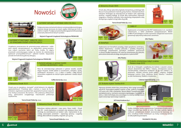 h kiem szu ka zn a c rga Na t a Nowości . 6. Belownica Orwak 3605 j stoisk z ty m Orwak 3605 oferuje optymalną logistykę transportową, produkując bele 80x120 cm przy podstawie i masie do 450 kg z kartonu. Autostart oraz drzwi żaluzjowe otwierające się automatycznie po każdym cyklu zapewniają sprawną i wygodną obsługę. W Orwak 3605 wykorzystano najnowsze osiągnięcia z dziedziny hydrauliki, które gwarantują niespotykanie niską dla tego typu urządzeń emisję hałasu (63,9 dB). stoisko 50 Wojciech Pręgowski Urządzenia Technologiczne PREWA BIS 2. AUTOMAT ETYKIETUJĄCY SERII ETA 2011 DO OPAKOWAŃ OSIOWO-SYMETRYCZNYCH Opakowanie w krystalicznej folii PET dedykowane m.in. wyrobom cukierniczym, a także produktom pozaspożywczym. Blister CUBB-X® jest dostępny w wielu rozmiarach. Eleganckie wzornictwo gwarantuje optymalną widoczność zawartości. pawilon 5 stoisko 55 ANL Plastics 8. DomePack Urządzenie przeznaczone do automatycznego pobierania i naklejania etykiet samoprzylepnych na opakowania osiowo-symetryczne małych rozmiarów takich jak: fiolka, kredka. Po zdjęciu przystawki automatyzującej nadaje się również do etykietowania opakowań prostopadłościennych i płaskich butelek. Opcjonalnie posiada termodrukową głowicę datującą. Opakowania serii DomePack posiadają, dzięki specjalnemu zamknięciu, idealnie dopasowaną i szczelną pokrywkę z powłoką antyparową, umożliwiając prezentowanie rozmaitych produktów spożywczych w różnych kanałach dystrybucji. DP może być prezentowane bez pokrywki, jednocześnie doskonale zamykając dania gotowe w systemie MAP. pawilon 5 Wojciech Pręgowski Urządzenia Technologiczne PREWA BIS stoisko 50 Druk do 5 linii/32pkt z prędkością do 6,6m/s z użyciem uniwersalnych atramentów bez MEKu i ketonu. Zmniejszone zużycie rozcieńczalnika, zwiększona wydajność do 90 mln znaków z 1L atramentu. Wysoka ochrona przed pyłem i wilgocią. Podgląd bieżącego zużycia. Duży, dotykowy ekran. Głowica i obudowa ze stali nierdzewnej. Dbałość o środowisko. stoisko 37 Coleman International Sp. z o.o. 4. Belownica Orwak 3115 10. Drukarka etykiet Toshiba B-EX Orwak 3115 to największy „kompakt” wśród belownic do odpadów opakowaniowych. Produkuje bele z kartonu o masie do 60 kg. Autostart, regulowana wysokość beli, opcjonalne krzyżowe wiązanie oraz funkcje prasowania dla kartonu i folii podnoszą efektywność pracy, jednocześnie uwzględniając indywidualne preferencje użytkownika. Najnowsza drukarka etykiet klasy przemysłowej, która zastąpi sprawdzoną serię B-SX. Przemysłowa prędkość wydruku 14''/sek., graficzny wyświetlacz LCD, porty LAN i USB w standardzie. Głowice płaskie i krawędziowe, moduł oszczędzania taśmy, mechanizm przewijania zapobiegający marszczeniu się taśmy, a także technologia pracy pozwalająca na znaczną redukcję zużycia prądu to atuty tego najnowszego urządzenia. pawilon 5 6 pawilon 5 Coffee Service Sp. z o.o. pawilon 5 Tomra Orwak Polska Sp. z o.o. stoisko 66 stoisko 55 9. Drukarka atramentowa małych znaków Markem-Imaje 9232 Służy do automatycznego pakowania w gotowe saszetki, saszetki stojące Doypack, torebki płaskie (z eurootworem, wentylem, rączką, zamknięciem strunowym i in.), a także w torebki z fałdą boczną. Uniwersalne urządzenie do różnych typów opakowań o bardzo dużym zakresie. stoisko 24 pawilon 5 ANL Plastics 3. Automat pakujący w gotowe torebki COFPACK AN DOYPACK C 160G pawilon 5 stoisko 66 7. CUBB-X® Podaje automatycznie kartoniki ułożone na stosie pod głowicę drukującą. Automat drukuje termicznie do trzech rzędów informacji po 8 lub 10 znaków w rzędzie. Po odjęciu przystawki pobierającej kartoniki pozostaje uniwersalny datownik do różnych wyrobów. pawilon 5 pawilon 5 Tomra Orwak Polska Sp. z o.o. 1. AUTOMAT DATUJĄCY KARTONIKI SERII STA 2011 stoisko 66 pawilon 5 HIT-Kody Kreskowe Sp.J. stoisko 11 5. Belownica Orwak 3410 SD 11. Dwukierunkowa liczarka etykiet LER-3 Rekordowa redukcja głośności i czasu pracy. Nowy model - Orwak 3410 SD - został wyposażony w autostart oraz żaluzjowe drzwi, które otwierają się automatycznie po każdym cyklu. Usprawnienia te pozwalają zaoszczędzić przestrzeń i zapewniają sprawną i wygodną obsługę. Bela wielkości europalety, waga beli: 300-450 kg. Szybka, dokładna, bardzo ergonomiczna i funkcjonalna liczarka wykrywająca wszystkie typy etykiet na rynku. Ma opcje wydruku raportu, możliwość zainstalowania drukarki atramentowej lub laserowej, systemu weryfikacji kodów kreskowych czy funkcji wzrokowej kontroli ze stała prędkością przewijania. Tomra Orwak Polska Sp. z o.o. pawilon 5 stoisko 31 PACKMATIC POLSKA NOWOŚCI NOWOŚCI 7 12. Dwu-kolorowa drukarka etykiet Cab XC Series 17. Kompaktom bezdotykowy Orwak 1030 Dwukolorowa przemysłowa drukarka etykiet z funkcją oszczędzania taśmy – 300 dpi, spełniająca wszystkie wymogi dotyczące etykietowania substancji chemicznych zgonie z wytycznymi GHS. Obudowa z odlewanego aluminium. Obsługa dużych rolek o średnicy do 300mm. Zaawansowane możliwości programowania dla współpracy z zewnętrznymi aplikacjami. Funkcjonalne oprogramowanie do projektowania i wydruku w zestawie. Kompaktor dla restauracji fast-food, centrów handlowych, stacji benzynowych, lotnisk oraz dworców. Zapewnia bezdotykową obsługę, a dzięki niej - łatwe i higieniczne usuwanie odpadów. Możliwość wykonania w grafice klienta. Dane techniczne: 7-12 krotna redukcja objętości odpadów, cykl pracy 15 sekund, poziom hałasu <60 dB. Coleman International Sp. z o.o. pawilon 5 pawilon 5 stoisko 37 Prosta w obsłudze i tania w eksploatacji linia o niewielkich gabarytach całkowicie eliminuje pracę ręczną. Automatyczna linia pobiera płaski karton, otwiera go oraz zakleja dolne klapy. Karton trafia do maszyny grupująco-pakującej, która zlicza, grupuje i umieszcza określoną ilość produktów/opakowań jednostkowych w kartonie. Zała