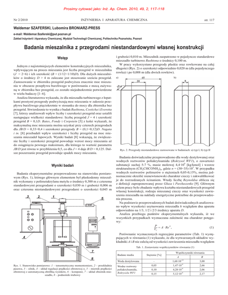 Prosimy cytować jako: Inż. Ap. Chem. 2010, 49, 2, 117-118 INŻYNIERIA I APARATURA CHEMICZNA Nr 2/2010 str. 117 Waldemar SZAFERSKI, Lubomira BRONIARZ-PRESS e-mail: [email protected] Zakład Inżynierii i Aparatury Chemicznej, Wydział Technologii Chemicznej, Politechnika Poznańska, Poznań Badania mieszalnika z przegrodami niestandardowymi własnej konstrukcji Wstęp Jednym z najistotniejszych elementów konstrukcyjnych mieszalnika, wpływającym na proces mieszania jest liczba przegród w mieszalniku (J = 2÷6) i ich szerokość (B = (1/12÷1/10)D). Dla dużych mieszalników o średnicy D > 4 m zalecane jest stosowanie sześciu przegród. Zastosowanie w zbiorniku przegród podwyższa znacznie moc mieszania w obszarze przepływu burzliwego w porównaniu z mocą zużywaną w zbiorniku bez przegród, co zostało niejednokrotnie potwierdzone w wielu badaczy [1–6]. Analiza literaturowa wykazała, że dla mieszadła turbinowego z łopatkami prostymi przegrody podwyższają moc mieszania w zakresie przepływu burzliwego pięciokrotnie w stosunku do mocy dla zbiornika bez przegród. Stwierdzenie to wynika z badań Rushtona, Costicha i Everetta [7], którzy analizowali wpływ liczby i szerokości przegród oraz ustalili następujące wielkości standardowe: liczbę przegród J = 4 i szerokość przegród B = 0,1D. Bates, Fondy i Corpstein [5] z kolei wykazali, że maksymalną moc mieszania można uzyskać przy czterech przegrodach dla JB/D = 0,33÷0,4 i szerokości przegrody B = (0,1÷0,12)D. Nagata i in. [8] przebadali wpływ szerokości i liczby przegród na moc mieszania mieszadeł łapowych. Wyniki badań [8] wskazują, że zwiększenie liczby i szerokości przegród powoduje wzrost mocy mieszania aż do osiągnięcia pewnego maksimum, dla którego to wartość parametru JB/D jest równa w przybliżeniu 0,5, co dla J = 4 daje B/D = 0,125. Dalsze poszerzanie przegród powoduje spadek mocy mieszania. Wyniki badań Badania eksperymentalne przeprowadzono na stanowisku pomiarowym (Rys. 1), którego głównym elementem był płaskodenny mieszalnik wykonany z polimetakrylanu metylu o średnicy 0,300 m z czterema standardowymi przegrodami o szerokości 0,030 m i grubości 0,006 m oraz czterema niestandardowymi przegrodami o szerokości 0,045 m i grubości 0,010 m. Mieszalnik zaopatrzono w pojedyncze standardowe mieszadło turbinowe Rushtona o średnicy 0,100 m. W pracy wykorzystano przegrody płaskie oraz rowkowane na całej długości (Rys. 2) o szerokości odpowiednio 0,020 m (dla pojedynczego rowka) i po 0,008 m (dla dwóch rowków). a) b) Rys. 2. Przegrody niestandardowe zastosowane w badaniach: a) typ I, b) typ II Badania doświadczalne przeprowadzono dla wody destylowanej oraz wodnych roztworów poliakryloamidu (Rokrysol WF1), o zawartości substancji suchej 5-7 %, masie molowej 4,4·106 [kg/kmol] i wzorze strukturalnym (CH2CHCONH2)n, gdzie n = (30÷35)⋅103. W przypadku wodnych roztworów polimerów o stężeniach 0,05-0,15%, można jednoznacznie określić nienewtonowski charakter cieczy i zakwalifikować je do rozrzedzanych ścinaniem. Wtedy liczbę Reynoldsa oblicza się z definicji zaproponowanej przez Głuza i Pawłuszenko [9]. Głównym celem pracy było zbadanie wpływu kształtu niestandardowych przegród własnej konstrukcji, rodzaju mieszanej cieczy oraz wysokości zawieszenia mieszadła na nakłady energetyczne potrzebne do przeprowadzenia procesu. Na podstawie przeprowadzonych badań doświadczalnych analizowano wpływ wysokości usytuowania mieszadła h względem dna aparatu odpowiednio na 1/3, 1/2 i 2/3 średnicy aparatu D. Analiza przebiegu punktów eksperymentalnych wykazała, iż we wszystkich przypadkach wyznaczana zależność ma charakter potęgowy: P A $ Re B , (1) VC = Porównanie wyznaczonych regresyjnie parametrów (Tab. 1) występujących w równaniu (1) wykazało, że dla wytwarzanych układów wykładniki A i B nie zależą od wysokości zawieszenia mieszadła względem Tab. 1. Zestawienie współczynników równania (1) Badane media Woda destylowana Rys. 1. Stanowisko pomiarowe: 1 – tensometryczny momentomierz, 2 – przekładnia pasowa, 3 – silnik, 4 – układ regulacji prędkości obrotowej n, 5 – miernik prędkości obrotowej z automatyczną obróbką wyników, 6 – komputer, 7 – układ zbiornik-mieszadło, 8 – podnośnik śrubowy Wodne roztwory poliakryloamidu, Rokrysolu WF1 Stężenie [%] Współczynniki równania A B – 1,68·10-12 3,00 0,05 1,47·10-9 2,66 0,10 4,28·10-6 2,06 0,15 5,12·10-6 2,17 Prosimy cytować jako: Inż. Ap. Chem. 2010, 49, 2, 117-118 str. 118 INŻYNIERIA I APARATURA CHEMICZNA Nr 2/2010 dna aparatu i rodzaju zastosowanych przegród. Wpływ na jednostkową moc mieszania ma rodzaj cieczy stosowanej w badaniach oraz stężenia w przypadku roztworów polimeru Rokrysol WF1. Zwiększając obroty powyżej 15 1/s zauważono, że jednostkowa moc mieszania zależy od usytuowania mieszadła względem dna aparatu oraz rodzaju przegród. Ilość powietrza zasysana przez mieszadło jest na tyle duża, że bezpośrednio wpływa na uzyskiwane wyniki. Przeprowadzono analizę zależności liczby Newtona od liczby Reynoldsa dla trzech typów przegród i trzech wysokości usytuowania mieszadła. W przypadku prowadzenia procesu w wodzie destylowanej uzyskano liczbę mocy równą 5,6 dla wszystkich badanych układów konstrukcyjnych mieszalnika. Zaobserwowano, że wysokość zawieszenia mieszadła, jak i rodzaj zastosowanych przegród nie wpływają na wartość liczby mocy. Prowadząc proces mieszania w roztworach polimeru uzyskano liczbę mocy 4,7 dla stężenia roztworu polimeru 0,05%, natomiast dla stężeń 0,1 i 0,15% uzyskano odpowiednio 3,5. Rys. 3. Analiza wpływu wysokości usytuowania mieszadła oraz rodzaju przegród na jednostkową moc mieszania Wnioski Rys. 4. Wpływ stężenia roztworu polimeru na jednostkową moc mieszania dla zastosowanych przegród w mieszalniku Analiza mocy jednostkowej potrzebnej do przeprowadzenia proce