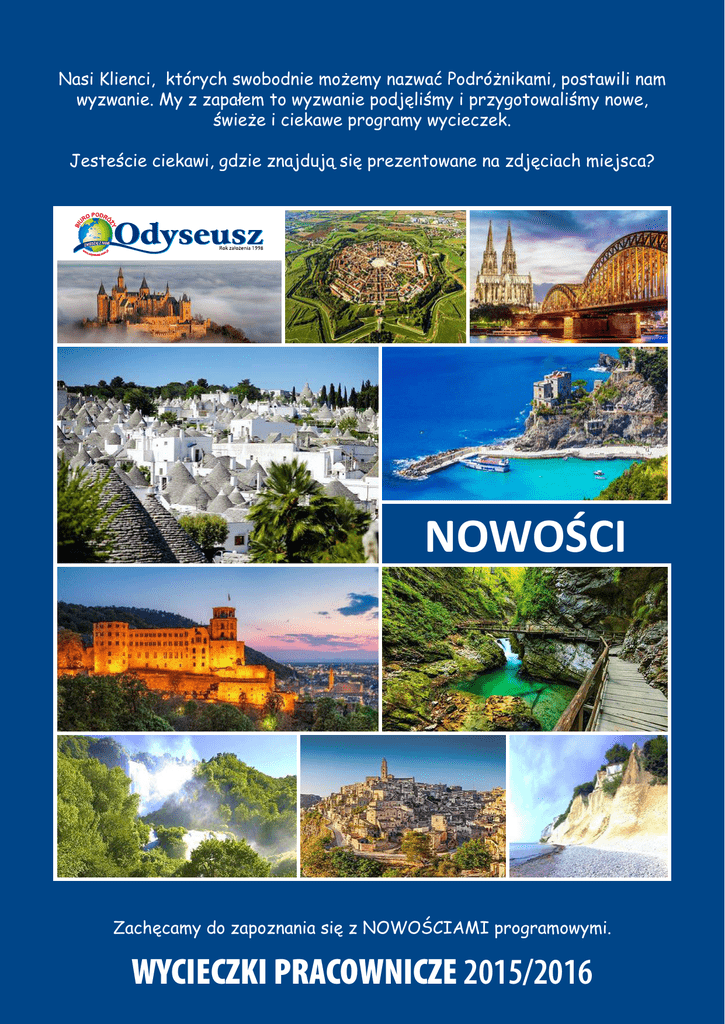 Nasi Klienci, których swobodnie możemy nazwać Podróżnikami, postawili nam wyzwanie. My z zapałem to wyzwanie podjęliśmy i przygotowaliśmy nowe, świeże i ciekawe programy wycieczek. Jesteście ciekawi, gdzie znajdują się prezentowane na zdjęciach miejsca? NOWOŚCI Zachęcamy do zapoznania się z NOWOŚCIAMI programowymi. WYCIECZKI PRACOWNICZE 2015/2016 WYCIECZKI PRACOWNICZE 2015/2016 NOWOŚCI CZESKIE KRAJOBRAZY I CZESKIE ZAMKI – 3 DNI Brama Pravcicka Zamek Kost 3 2 Ramowy program wycieczki: 1 dzień: Wyjazd z umówionego miejsca. Skalne Miasto – Adrschpach: jedno z najpiękniejszych miejsc w Czechach. Czekają tu rozległe labirynty skalne i wspaniałe widoki z wierzchołków wzniesień. Odbędziemy spacer wśród malowniczych skał oraz rejs po jeziorku. Przejazd na obiadokolację i nocleg. 2 dzień: Śniadanie. Zamek Kost: jeden z najlepiej zachowanych gotyckich zamków w Czechach. Czeska Saksonia: spacer po parku, spływ łodziami po rzece Kamenicy, następnie przejście pod największym naturalnym mostem skalnym w Europie – Pravčicka Brama. Przejazd na obiadokolację i nocleg. 3 dzień: Śniadanie. Bozkowskie Jaskinie Dolomitowe z podziemnymi jeziorkami z przeźroczystą, niebieskozieloną wodą. Bozkowskie Jaskinie są jedynymi udostępnionymi do zwiedzania jaskiniami w północnych Czechach. Przejazd do Harrachowa: ze słynnym kompleksem skoczni narciarskich na zboczach góry Czarcia Góra. Wyjazd do Polski. Zakończenie wycieczki w późnych godzinach nocnych. CENA ZAWIERA: przejazd komfortowym autokarem (WC, AC, DVD, barek), 2 noclegi w hotelu lub pensjonacie w pokojach 2,3 osobowych z łazienkami, 2 śniadania, 2 obiadokolacje, opiekę pilota, ubezpieczenie KL, NNW, wszystkie opłaty drogowe oraz parkingi. dla 47 os. dla 35 os. 535 PLN/os. 520 PLN/os. 570 PLN/os. 595 PLN/os. 575 PLN/os. 645 PLN/os. ILOŚĆ OSÓB MIASTO Kraków Katowice Rzeszów CENA NIE ZAWIERA: biletów wstępu do zwiedzanych obiektów, rejsu statkiem, lokalnych przewodników napojów do obiadokolacji, dopłaty do pokoju 1-osobowego, zestawów słuchawkowych. CZESKIE ZAMKI – CZESKI KRAS – 4 DNI Jaskinia Koniepruska Zamek Jindřichův Hradec 4 Ramowy program wycieczki: 1 dzień: Wyjazd z umówionego miejsca. Telč: miasto wpisane na listę UNESCO, spacer po renesansowym mieście, zamek. Jindřichův Hradec: jeden z największych kompleksów zamkowych. Przejazd na obiadokolację i nocleg. 2 dzień: Śniadanie. Ćeské Budějovice: miasto u zbiegu Wełtawy i Malszy, stolica kraju południowo czeskiego. Zobaczymy min. Starówkę, rynek z fontanną Samsona, kamienice, Ratusz, katedrę św. Mikołaja, Czarną Wieżę. Ćeský Krumlov: miasto Róży (na liście UNESCO), Stare Miasto, renesansowy zamek Schwarzenbergów, wizyta w sklepach z ceramiką. Powrót na obiadokolacje i nocleg. Możliwość zorganizowania wieczoru integracyjnego. 3 dzień: Śniadanie. Hluboká nad Vltavou: neogotycki zamek Schwarzenbergów zwany czeskim Windsorem. Třeboň: miasto Róży należące do Schwarzenbergów, średniowieczne stawy rybne (na liście UNESCO), Starówka, zamek (z zewnątrz) i Mauzoleum Schwarzenbergów. Powrót na obiadokolację, nocleg. 4 dzień: Śniadanie. Czeski Kras: zwiedzanie Jaskiń Koniepruskich -trasa prowadzi przez szereg jaskiń oraz jezioro sintrowe, spacer ścieżką dydaktyczną Złoty Koń. Wyjazd do Polski. Zakończenie wycieczki w godzinach wieczornych/nocnych. CENA ZAWIERA: przejazd komfortowym autokarem (WC, AC, DVD, barek), 3 noclegi w hotelu*** lub pensjonacie, w pokojach 2,3 osobowych z łazienkami, 3 śniadania, 3 obiadokolacje, opiekę pilota, ubezpieczenie KL, NNW, wszystkie opłaty drogowe oraz parkingi. CENA NIE ZAWIERA: biletów wstępu do zwiedzanych obiektów, lokalnych przewodników napojów do obiadokolacji, dopłaty do pokoju 1-osobowego, zestawów słuchawkowych, wieczoru integracyjnego. Zamek Hummershus dla 35 os. 825 PLN/os. 800 PLN/os. 870 PLN/os. 4 3 Ramowy program wycieczki: 1 dzień: Wyjazd z umówionego miejsca. Szczecin: Zamek Książąt Pomorskich, Nowe i Stare Miasto, Katedra, wjazd na wieżę, Plac Orła Białego, Brama Królewska i Kościół Św. Piotra i Pawła, przejazd Złotym Szlakiem od Wałów Chrobrego do Jasnych Błoni, spacer do „Różanki”. Międzyzdroje - zwane „perłą Bałtyku”. Spacer promenadą , wizyta na Alei Gwiazd. Przejazd na obiadokolację i nocleg. 2 dzień: Śniadanie. Kołobrzeg: Port Rybacki, Latarnia Morska, Molo, Oceanarium, Stare Miasto z Ratuszem, Bazylika Konkatedra. Czas wolny. Powrót na obiadokolację i nocleg. 3 dzień: Zaokrętowanie pasażerów na prom w Kołobrzegu. Rejs na Wyspę Bornholm do Nexo - czas rejsu około 4h - (w czasie rejsu: suchy prowiant zamiast śniadania). Czterogodzinna wycieczka objazdowa. Przejazd trasą wzdłuż wschodniego, skalistego wybrzeża. Przystanek w Gudhjem, urokliwym miasteczku i przy Hammershus, z największymi w Skandynawii ruinami średniowiecznego zamku. Przejazd do Nyker, z charkaterystycznym kościołem. Przejazd przez kompleks leśny Almindingen, Aakirkeby. Powrót do Nexo. Czas wolny. Zaokrętowanie na promie. Rejs do Kołobrzegu. (w czasie rejsu obiadokolacja – usługa dodatkowo płatna). Przejazd na nocleg. 4 dzień: Śniadanie. Wyjazd w drogę powrotną. Zakończenie wycieczki w godzinach wieczornych. CENA ZAWIERA: przejazd komfortowym autokarem (WC, AC, DVD, barek), 3 noclegi w hotelu lub pensjonacie w pokojach 2, 3 osobowych z łazienkami, 2 śniadania, suchy prowiant w 3 dniu, 2 obiadokolacje, przeprawę promową Kołobrzeg – Bornholm – Kołobrzeg, opiekę pilota, ubezpieczenie KL, NNW, wszystkie opłaty drogowe oraz parkingi. CENA NIE ZAWIERA: biletów wstępów do zwiedzanych obiektów, lokalnych przewodników, obiadokolacji na promie na Bornholm, dopłaty do pokoju 1-osobowego, zestawów słuchawkowych. 30 dla 47 os. 740 PLN/os. 725 PLN/os. 775 PLN/os. ILOŚĆ OSÓB MIASTO Kraków Katowice Rzeszów WYSPA BORNHOLM – SZCZECIN – MIĘDZYZDROJE – KOŁ