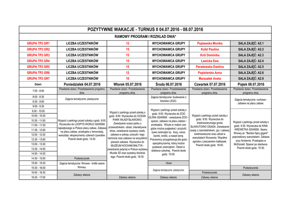 POZYTYWNE WAKACJE - TURNUS II 04.07.2016 - 08.07.2016 RAMOWY PROGRAM I ROZKŁAD DNIA* GRUPA TP2 GR1 LICZBA UCZESTNIKÓW 12 WYCHOWAWCA GRUPY Popławska Monika SALA ZAJĘĆ: A2.1 GRUPA TP2 GR2 LICZBA UCZESTNIKÓW 15 WYCHOWAWCA GRUPY Kufel Paulina SALA ZAJĘĆ: A2.2 GRUPA TP2 GR3 LICZBA UCZESTNIKÓW 15 WYCHOWAWCA GRUPY Król Dominika SALA ZAJĘĆ: A2.3 GRUPA TP2 GR4 LICZBA UCZESTNIKÓW 15 WYCHOWAWCA GRUPY Ławicka Ewa SALA ZAJĘĆ: A2.4 GRUPA TP2 GR5 LICZBA UCZESTNIKÓW 15 WYCHOWAWCA GRUPY Paradowska Ewelina SALA ZAJĘĆ: A2.5 GRUPA TP2 GR6 LICZBA UCZESTNIKÓW 12 WYCHOWAWCA GRUPY Popielarska Anna SALA ZAJĘĆ: A2.6 GRUPA TP2 GR7 LICZBA UCZESTNIKÓW 10 WYCHOWAWCA GRUPY Marszałek Aneta SALA ZAJĘĆ: A2.9 Dzień: Poniedziałek 04.07.2016 Wtorek 05.07.2016 Środa 06.07.2016 Czwartek 07.07.2016 Piątek 08.07.2016 7:00 - 8:00 Powitanie dzieci. Przedstawienie programu dnia. Powitanie dzieci. Przedstawienie programu dnia. Powitanie dzieci. Przedstawienie programu dnia. Powitanie dzieci. Przedstawienie programu dnia. Powitanie dzieci. Przedstawienie programu dnia. 8:00 - 8:30 8:30 - 9:00 Zajęcia tematyczne: budowanie z klocków LEGO. Zajęcia tematyczne: plastyczne. Zajęcia tematyczne: ruchowe zabawa na placu zabaw. 9:00 - 9:30 9:30 - 10:00 10:00 - 10:30 10:30 - 11:00 11:00 - 11:30 11:30 - 12:00 12:00 - 12:30 12:30 - 13:00 Wyjazd z parkingu przed szkołą o godz. 9:00. Wycieczka do LOOPYS WORLD GDAŃSK największego w Polsce placu zabaw. Zabawa na placu zabaw, przekąska z lemoniadą, warsztaty: eksperymenty czterech żywiołów. Powrót około godz. 14:30. 13:00 - 13:30 13:30 - 14:00 14:00 - 14:30 14:30 - 15:00 Podwieczorek. 15:00 - 15:30 Zajęcia tematyczne: filmowe - krótki seans filmowy. 15:30 - 16:00 16:00 - 16:30 16:30 - 17:00 Zabawy własne. Wyjazd z parkingu przed szkołą o Wyjazd z parkingu przed szkołą o godz. 9:00. Wycieczka do ZOO godz. 8:00. Wycieczka do OCEAN OLIWA GDAŃSK - zwiedzanie ZOO - Wyjazd z parkingu przed szkołą o godz. 8:00. Wycieczka do PARK WŁADYSŁAWOWO. spacer, zabawa na placu zabaw i Wyjazd z parkingu przed szkołą o średniowiecznego grodu Zwiedzanie ocean parku z przekąska. Wizyta w małym zoo godz. 9:30. Wycieczka do KINA przewodnikiem, obiad, interaktywne gdzie można pogłaskać i przytulić SŁAWUTOWO OSADA. Zwiedzanie KREWETKA GDAŃSK. Seans osady z rzemieślnikiem, gry i zabawy show, zwiedzanie wystawy rzeźb, żywe zwierzęta np. kozy, owce, filmowy pt. "Bardzo fajny gigant" średniowieczne oraz udział w zabawa w pokoju ucieczki i lego świnki, króliki, a nawet lamę. poprzedzony warsztatami. Zabawa warsztatach filcowania. Współne namiocie oraz zabawa na wszystkich Pracownicy przygotowują dla gości przy fontannie. Przekąska w ognisko z pieczeniem kiełbasek. placach zabawa. Wycieczka do specjalną karmę, którą można McDonald. Spacer po starówce. Powrót około godz. 16:00. MUZEUM KOCHAM BAŁTYK podawać zwierzętom. Obiad w Powrót około godz. 15:30. zwiedzanie jedynej w Polsce wystawy stołówce szkolnej. Powrót około Murale 3D oraz wystawy klocków godz. 15:00. lego. Powrót około godz. 16:30. Obiad Zajęcia tematyczne: plastyczne. Zabawy własne. Zabawy własne. Podwieczorek. Podwieczorek. Zabawy własne. Zabawy własne.