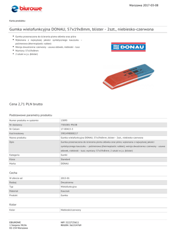 Warszawa 2017-03-08 Karta produktu: Gumka wielofunkcyjna DONAU, 57x19x8mm, blister - 2szt., niebiesko-czerwona Gumka przeznaczona do ścierania pisma ołówka oraz pióra Wykonana z najwyższej jakości syntetycznego kauczuku – polimerowa (thermoplastic rubber) Wersja dwustronna: czerwony - usuwa ołówek, niebieski - tusz Wymiary: 57x19x8mm 2 sztuki w j.s. (blister) Cena 2,71 PLN brutto Podstawowe parametry produktu Numer produktu w systemie 13895 Nr dostawcy 7301001-99/2B Nr Celcen 17-00415-3 Kod kreskowy 5901498008217 Nazwa produktu Gumka wielofunkcyjna DONAU, 57x19x8mm, blister - 2szt., niebiesko-czerwona Opis Gumka przeznaczona do ścierania pisma ołówka oraz pióra; wykonana z najwyższej jakości syntetycznego kauczuku – polimerowa (thermoplastic rubber); wersja dwustronna: czerwony - usuwa ołówek, niebieski - tusz; wymiary: 57x19x8mm; 2 sztuki w j.s. (blister) Kategoria Gumki Klasa Standard Marka DONAU Cecha W ofercie od 2013-01 Rodzaj Dwustronna Typ Wielofunkcyjna Materiał Kauczuk Produkt Gumka Kolor Kolor Niebieski/czerwony EBIUROWE 1 Sierpnia 39/26 02-134 Warszawa NIP: 5222725611 REGON: 362214769 Warszawa 2017-03-08 Karta katalogowa produktu cd. Gumka wielofunkcyjna DONAU, 57x19x8mm, blister - 2szt., niebiesko-czerwona Wspólny słownik zamówień CPV 30192100-2 Gumki Certyfikaty Nowy produkt w ofercie Standard Hit Standard Wymiary Wymiary (mm) 57x19x8 Pozostałe zdjęcia produktu Serdecznie zapraszamy do współpracy EBIUROWE zespół. EBIUROWE 1 Sierpnia 39/26 02-134 Warszawa NIP: 5222725611 REGON: 362214769