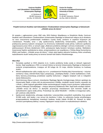 Centrum Studiów nad Człowiekiem i Środowiskiem Uniwersytetu Śląskiego ul. Bankowa 9 40-007 Katowice tel./fax: 32 3591235 Centre for Studies on Human and Natural Environment University of Silesia Bankowa 9 PL 40-007 Katowice, Poland tel./fax: #48 32 3591235 ___________________________________________________________________________ Projekt Centrum Studiów nad Człowiekiem i Środowiskiem Uniwersytetu Śląskiego w Katowicach „USiołek wraca do domu” W związku z ogłoszeniem przez ONZ roku 2013 Rokiem Współpracy w Dziedzinie Wody, Centrum Studiów nad Człowiekiem i Środowiskiem Uniwersytetu Śląskiego w Katowicach włącza się w działania na rzecz zrozumienia problematyki niedoboru czystej wody, zarówno w aspekcie krajowym jak i światowym. Ponadto, wraz z całą społecznością akademicką Uniwersytetu, podejmiemy się praktycznej pomocy ludziom cierpiącym na chroniczny niedostatek wody pitnej. Cykliczne spotkania organizowane przez CSCS, w ramach zajęć „Wybrane problemy ekologii i ochrony środowiska”, w roku jubileuszowym 20-lecia działalności CSCS, poświęcone będą bowiem tematyce wodnej. Wykładom towarzyszyć będzie spektakularna akcja, przeprowadzona we współpracy z Polską Akcją Humanitarną (PAH), pod hasłem: „USiołek wraca do domu”. Celem akcji będzie zebranie funduszy, które umożliwią wybudowanie studni wody pitnej na terenie Somalii lub Sudanu Południowego. Idea akcji Tematyka spotkań w CSCS obejmie m.in. trudne problemy braku wody w różnych regionach świata. Stąd współpraca z PAH, w ramach której na terenie Uniwersytetu Śląskiego w Katowicach zostanie przeprowadzona, trwająca od 28 lutego do 23 maja, zbiórka funduszy na budowę studni. Wśród wykładowców cyklu znajdą się m.in.: przedstawiciel Polskiej Akcji Humanitarnej – inżynier sanitarny z Gazy, członek Klubu Gaja z propozycją: „Zaadoptuj Rzekę”, a także wykładowca z Indii, który barwną prezentacją przedstawi aspekty kulturowe i religijne świętych rzek w indyjskim stanie Maharasztra. Osioł domowy (Equus asinus), mieszkaniec Śląskiego Ogrodu Zoologicznego, którym opiekuje się Uniwersytet Śląski, a który stał się pierwowzorem USiołka, maskotki naszej Uczelni, wywodzi się z Afryki, z dziko żyjących gatunków osłów zamieszkujących między innymi pustynne i półpustynne obszary Półwyspu Somalijskiego – miejsca aktywnej działalności PAH. Stąd hasło wiodące zbiórki: „USiołek wraca do domu”, w domyśle: przynosząc mieszkańcom tych terenów środki na wybudowanie ujęcia wody pitnej. Przewiduje się udział Maskotki – USiołka w inauguracji cyklu, jak i podczas całej zbiórki. Społeczność akademicka, wliczając studentów i pracowników wszystkich wydziałów, liczy ponad 35 000 osób. Jeśli każdy z nas wrzuci do skarbony 2 złote, to uzbieramy kwotę umożliwiającą przeprowadzenie kompletnej inwestycji budowy studni (około 65 000 zł). Pozwoli to także umieścić pamiątkową tablicę z nazwą i logotypem naszej Uczelni na wybudowanym obiekcie. http://www.watercooperation2013.org/