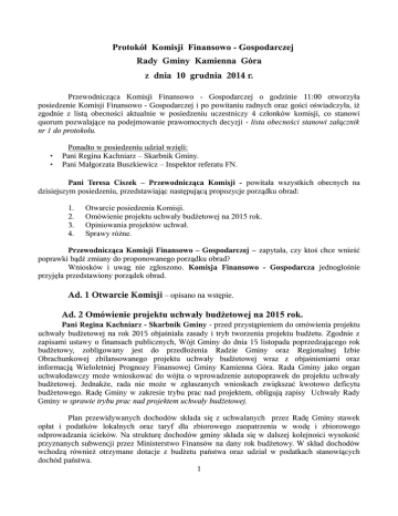 Protokół Komisji Finansowo - Gospodarczej Rady Gminy Kamienna Góra z dnia 10 grudnia 2014 r. Przewodnicząca Komisji Finansowo - Gospodarczej o godzinie 11:00 otworzyła posiedzenie Komisji Finansowo - Gospodarczej i po powitaniu radnych oraz gości oświadczyła, iż zgodnie z listą obecności aktualnie w posiedzeniu uczestniczy 4 członków komisji, co stanowi quorum pozwalające na podejmowanie prawomocnych decyzji - lista obecności stanowi załącznik nr 1 do protokołu. • • Ponadto w posiedzeniu udział wzięli: Pani Regina Kachniarz – Skarbnik Gminy. Pani Małgorzata Buszkiewicz – Inspektor referatu FN. Pani Teresa Ciszek – Przewodnicząca Komisji - powitała wszystkich obecnych na dzisiejszym posiedzeniu, przedstawiając następującą propozycje porządku obrad: 1. 2. 3. 4. Otwarcie posiedzenia Komisji. Omówienie projektu uchwały budżetowej na 2015 rok. Opiniowania projektów uchwał. Sprawy różne. Przewodnicząca Komisji Finansowo – Gospodarczej – zapytała, czy ktoś chce wnieść poprawki bądź zmiany do proponowanego porządku obrad? Wniosków i uwag nie zgłoszono. Komisja Finansowo - Gospodarcza jednogłośnie przyjęła przedstawiony porządek obrad. Ad. 1 Otwarcie Komisji – opisano na wstępie. Ad. 2 Omówienie projektu uchwały budżetowej na 2015 rok. Pani Regina Kachniarz - Skarbnik Gminy - przed przystąpieniem do omówienia projektu uchwały budżetowej na rok 2015 objaśniała zasady i tryb tworzenia projektu budżetu. Zgodnie z zapisami ustawy o finansach publicznych, Wójt Gminy do dnia 15 listopada poprzedzającego rok budżetowy, zobligowany jest do przedłożenia Radzie Gminy oraz Regionalnej Izbie Obrachunkowej zbilansowanego projektu uchwały budżetowej wraz z objaśnieniami oraz informacją Wieloletniej Prognozy Finansowej Gminy Kamienna Góra. Rada Gminy jako organ uchwałodawczy może wnioskować do wójta o wprowadzenie autopoprawek do projektu uchwały budżetowej. Jednakże, rada nie może w zgłaszanych wnioskach zwiększać kwotowo deficytu budżetowego. Radę Gminy w zakresie trybu prac nad projektem, obligują zapisy Uchwały Rady Gminy w sprawie trybu prac nad projektem uchwały budżetowej. Plan przewidywanych dochodów składa się z uchwalanych przez Radę Gminy stawek opłat i podatków lokalnych oraz taryf dla zbiorowego zaopatrzenia w wodę i zbiorowego odprowadzania ścieków. Na strukturę dochodów gminy składa się w dalszej kolejności wysokość przyznanych subwencji przez Ministerstwo Finansów na dany rok budżetowy. W skład dochodów wchodzą również otrzymane dotacje z budżetu państwa oraz udział w podatkach stanowiących dochód państwa. 1 Zadania remontowe i inwestycyjne wpisane zostały do projektu wydatków budżetu gminy min. zgodnie z obowiązującym Wieloletnim Planem Inwestycyjnym oraz Wieloletnim Programem Gospodarowania Mieszkaniowym Zasobem Gminy. Przygotowując założenia do uchwały budżetowej wysłano zawiadomienia do wszystkich uczestników budżetu z informacją o składaniu zapotrzebowań w zakresie wydatków budżetowych. Po otrzymaniu tychże informacji nastąpiły prace nad tworzeniem projektu uchwały budżetowej. Prezentacja projektu uchwały w sprawie budżetu Gminy Kamienna Góra na rok 2015 rozpoczęta została od szczegółowej analizy planu dochodów gminy według jego źródeł. Dochody budżetowe sklasyfikowane zostały w kwocie 27 296 883,00 zł. w tym: • dochody własne gminy – 13 311 648,00 zł, • subwencja ogólna z budżetu państwa – 10 420 952,00 zł, • dotacje celowe z budżetu państwa na realizacje zadań administracji rządowej – 2 485 111,00 zł, • dotacje celowe otrzymywane z budżetu państwa na realizacje własnych zadań bieżących – 904 611,00 zł, • dotacje celowe w ramach programów finansowanych z udziałem środków europejskich – 174 561,00 zł. Różnica między dochodami a wydatkami to kwota 336 000,00 zł. Rozchody zaplanowane zostały w wysokości 664 000,00 zł. z przeznaczeniem na spłatę rat pożyczek i kredytów, wykazanych z objaśnieniach do projektu. • • Plan wydatków budżetowych na rok 2015 ustalony został na poziomie 27 632 883,00zł. wydatki bieżące – 24 013 130,26 zł, wydatki inwestycyjne – 3 619 752,74 zł. Szczegółowe omówienie planu dochodów i wydatków oparto na załączniku nr 1 i 2 do projektu uchwały budżetowej na rok 2015. Pan Jan Łepski – nawiązując do wydatków związanych z dotowaniem CBK w Krzeszowie wskazał, iż środki wydatkowane na ten cel są bardzo wysokie, co nie jest równoznaczne z efektywnością działania tych ośrodków. Pani Teresa Ciszek – w odpowiedzi na wypowiedź radnego wskazała, iż kwota środków wydatkowanych na ten cel nie wzrosła w stosunku do roku poprzedniego, a ze środków tych pokrywane są wszystkie koszty funkcjonowania tych ośrodków, łącznie z wynagrodzeniem pracowników. Pani Regina Kachniarz – Skarbnik Gminy – wyjaśniła, iż w związku z tym, iż funkcjonujące centrum powołane zostało uchwałą Rady Gminy, to gmina ma obowiązek zabezpieczyć środki na pokrycie kosztów związanych z jego działaniem. Pan Jan Łepski – zapytał w którym miejscu w Czarnowie będzie budowany piec chlebowy i czy jest to zadanie własne gminy? Pani Regina Kachniarz – Skarbnik Gminy – odpowiedziała, że jest to zadanie własne gminy, a piec stawiany będzie na wolnej przestrzeni , do użytku wszystkich mieszkańców gminy. 2 Pan Jan Łepski – zapytał czy wpływy z tytułu opłaty eksploatacyjnej obejmują wszystkie kopalnie? Pani Regina Kachniarz – Skarbnik Gminy – odpowiedziała, że teoretycznie opłata dotyczy wszystkich kopalni, natomiast wpływy są tylko z 2-óch, które maja wydobycie. Pan Robert Mikołajczyk – zapytał czy na terenie gminy mamy do czynienia z zakładami pracy, które nie odprowadzają należnego podatku? Pani Regina Kachniarz – Skarbnik Gminy – odpowiedziała, że nie ma zakładów pracy, które 