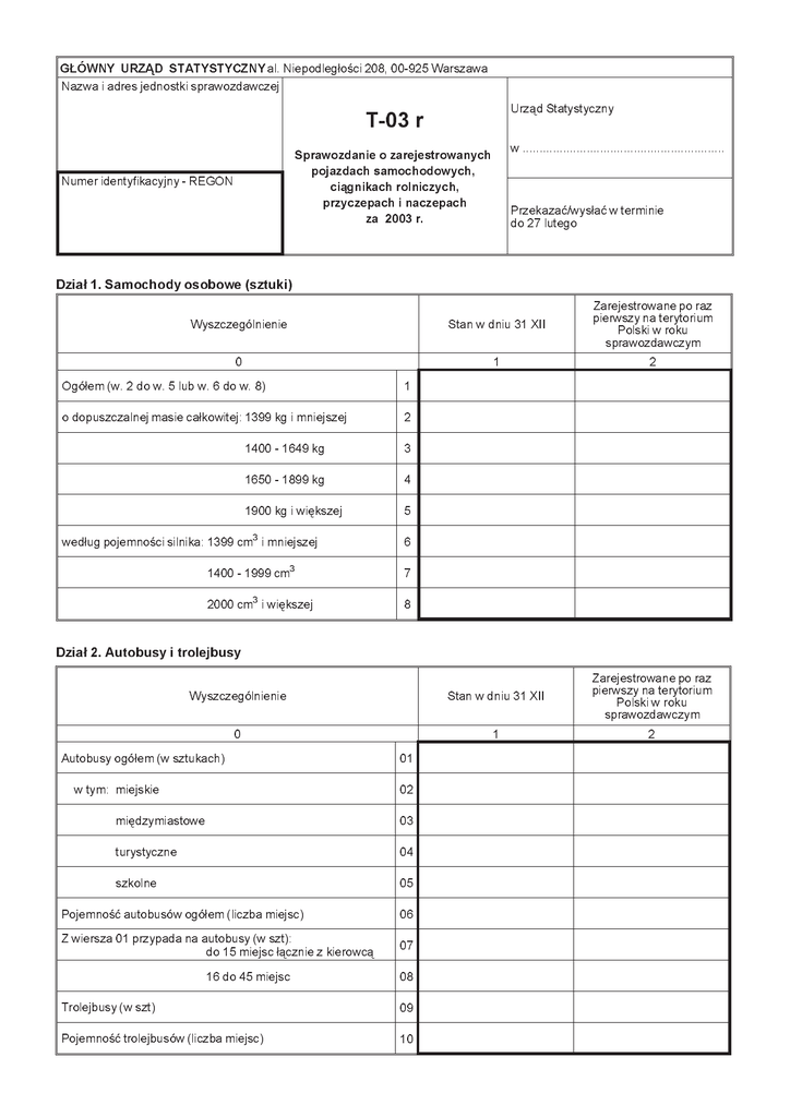 G£ÓWNY URZ¥D STATYSTYCZNY al. Niepodleg³oci 208, 00-925 Warszawa Nazwa i adres jednostki sprawozdawczej Urz¹d Statystyczny T-03 r w ............................................................ Sprawozdanie o zarejestrowanych pojazdach samochodowych, ci¹gnikach rolniczych, przyczepach i naczepach za 2003 r. Numer identyfikacyjny - REGON Przekazaæ/wys³aæ w terminie do 27 lutego Dzia³ 1. Samochody osobowe (sztuki) Wyszczególnienie Stan w dniu 31 XII 0 1 Ogó³em (w. 2 do w. 5 lub w. 6 do w. 8) 1 o dopuszczalnej masie ca³kowitej: 1399 kg i mniejszej 2 1400 - 1649 kg 3 1650 - 1899 kg 4 1900 kg i wiêkszej 5 wed³ug pojemnoci silnika: 1399 cm! i mniejszej Zarejestrowane po raz pierwszy na terytorium Polski w roku sprawozdawczym 2 6 1400 - 1999 cm! 7 2000 cm! i wiêkszej 8 Dzia³ 2. Autobusy i trolejbusy Wyszczególnienie Stan w dniu 31 XII 0 1 Autobusy ogó³em (w sztukach) w tym: miejskie 01 02 miêdzymiastowe 03 turystyczne 04 szkolne 05 Pojemnoæ autobusów ogó³em (liczba miejsc) 06 Z wiersza 01 przypada na autobusy (w szt): do 15 miejsc ³¹cznie z kierowc¹ 07 16 do 45 miejsc 08 Trolejbusy (w szt) 09 Pojemnoæ trolejbusów (liczba miejsc) 10 Zarejestrowane po raz pierwszy na terytorium Polski w roku sprawozdawczym 2 Dzia³ 3. Samochody ciê¿arowe Wyszczególnienie Stan w dniu 31 XII 0 1 Zarejestrowane po raz pierwszy na terytorium Polski w roku sprawozdawczym 2 W sztukach Ogó³em (w. 02 do w.11) 01 wed³ug grup ³adownoci: 999 kg i mniej 02 1000 - 1499 kg 03 1500 - 2999 kg 04 3000 - 3499 kg 05 3500 - 4999 kg 06 5000 - 6999 kg 07 7000 - 9999 kg 08 10000 - 14999 kg 09 15000 - 19999 kg 10 20000 kg i wiêcej Z ogó³em (w. 01) przypada na samochody: ciê¿arowo-osobowe furgony 11 w tym: izotermiczne 12 13 14 ch³odnie i lodownie 15 wywrotki 16 cysterny 17 do przewozu kontenerów 18 £adownoæ samochodów w tonach= Ogó³em 19 w tym o ³adownoci 1499 kg i mniejszej = 20 Z jednym znakiem po przecinku. Dzia³ 4. Pozosta³e pojazdy silnikowe i motorowery (sztuki) Wyszczególnienie Stan w dniu 31 XII 0 1 Motorowery 1 Motocykle 2 w tym o pojemnoci silnika 125 cm! i mniejszej 3 Ci¹gniki siod³owe 4 Ci¹gniki balastowe 5 Samochody specjalne 6 Ci¹gniki rolnicze 7 w tym ko³owe 8 Zarejestrowane po raz pierwszy na terytorium Polski w roku sprawozdawczym 2 Dzia³ 5. Pojazdy samochodowe wed³ug grup wieku (stan w dniu 31 XII) - sztuki Ogó³em (rubr. 2 do rubr. 8) 1 Wyszczególnienie 0 Samochody osobowe w tym o pojemnoci silnika 1399 cm! i mniejszej Samochody ciê¿arowe W wieku lat 2 i mniej 3-5 6 - 10 11 - 15 16 -20 21 - 30 31 i wiêcej 2 3 4 5 6 7 8 01 02 03 w tym o ³adownoci 1500 kg 04 i wiêkszej Autobusy 05 w tym: do 15 miejsc ³¹cznie z kierowc¹ 16 - 45 miejsc Trolejbusy Ci¹gniki 06 07 08 siod³owe 09 balastowe 10 Dzia³ 6. Pojazdy samochodowe wed³ug rodzajów stosowanego paliwa (sztuki) Zarejestrowane po raz pierwszy na terytorium Polski w roku sprawozdawczym Stan w dniu 31 XII Wyszczególnienie 0 Samochody osobowe ogó³em (w. 02 do w. 04) 1399 cm! i mniejszej o pojem1400 - 1999 cm! noci silnika 2000 cm! i wiêkszej Autobusy ogó³em w tym ogó³em 1 01 02 03 04 05 do 15 miejsc ³¹cznie z kierowc¹ 06 16 - 45 miejsc 07 Samochody ciê¿arowe ogó³em (w. 09 do w. 10) 08 1499 kg i mniejszej 09 1500 kg i wiêkszej 10 o ³adownoci Ci¹gniki siod³owe 11 Samochody specjalne 12 w tym na napêbenzynê olejdowy 2 3 gaz (LPG) 4 ogó³em 5 w tym na napêbenzynê olej dowy 6 7 gaz (LPG) 8 Dzia³ 7. Naczepy i przyczepy (sztuki) Wyszczególnienie Stan w dniu 31 XII 0 1 Naczepy ciê¿arowe - ogó³em (w. 02 do w.07) 01 o ³adownoci: 4999 kg i mniejszej 02 5000 - 9999 kg 03 10000 - 14999 kg 04 15000 - 19999 kg 05 20000 kg - 24999 kg 06 25000 kg i wiêkszej 07 Z wiersza 01 przypada na: cysterny 08 izotermiczne 09 ch³odnie i lodownie 10 do przewozu kontenerów 11 niskopodwoziowe 12 Naczepy specjalne 13 Przyczepy ciê¿arowe= - ogó³em (w. 15 do w.18) 14 o ³adownoci: 4999 kg i mniejszej= 15 5000 - 9999 kg 16 10000 - 14999 kg 17 15000 kg i wiêkszej 18 Z wiersza 14 przypada na: wywrotki 19 cysterny 20 izotermiczne 21 ch³odnie i lodownie 22 do przewozu kontenerów 23 niskopodwoziowe 24 Przyczepy specjalne 25 Przyczepy ciê¿arowe rolnicze 26 = Zarejestrowane po raz pierwszy na terytorium Polski w roku sprawozdawczym 2 Bez przyczep lekkich (o dopuszczalnej masie ca³kowitej do 750 kg). .................................................................. (imiê, nazwisko i telefon osoby, która sporz¹dzi³a sprawozdanie .......................................................................... (miejscowoæ, data) .......................................................... (piecz¹tka imienna i podpis osoby dzia³aj¹cej w imieniu sprawozdawcy) OBJANIENIA do formularza T-03r Uwagi ogólne 1. Sprawozdaniem nale¿y obj¹æ pojazdy: ` ` wg stanu w dniu 31.XII., tj. zarejestrowane w roku sprawozdawczym i w latach poprzednich z wy³¹czeniem pojazdów wyrejestrowanych. Pojazdy czasowo zarejestrowane, dla których nie dokonano jeszcze rejestracji sta³ej nale¿y równie¿ uwzglêdniæ, jednak¿e nie nale¿y ich uwzglêdniaæ po raz drugi w przypadku wydania rejestracji sta³ej. zarejestrowane po raz pierwszy na terytorium Polski w roku sprawozdawczym. Oznacza to, ¿e te pojazdy wykazuje tylko to starostwo, które dokona³o pierwszej rejestracji w kraju. W danych tych nale¿y uj¹æ zarówno pojazdy fabrycznie nowe, jak i pojazdy u¿ywane sprowadzone z zagranicy, dla których dokonano pierwszej rejestracji w kraju oraz tzw. SAM-y. Dzia³ 1. Samochody osobowe 2. W wierszu 1 nale¿y podaæ ogóln¹ liczbê samochodów osobowych, ³¹cznie z taksówkami osobowymi. Taksówki osobowe pojazdy samochodowe odpowiednio wyposa¿one i oznaczone, przeznaczone do przewozu za ustalon¹ na podstawie taksometru op³at¹ osób nie wiêcej ni¿ 9 ³¹cznie z kierowc¹ oraz ich baga¿u podrêcznego. 3. Do samochodów osobowych zalicza siê pojazdy samochodowe przeznaczone konstrukcyjnie do przewozu nie wiêcej ni¿ 9 o