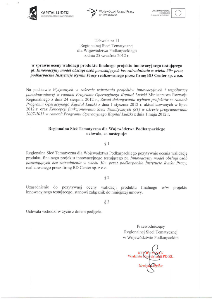 KAPITAI TUDZKI t' UNIAEUSOPEJSM I :-; I ElFoftnK | I f u r c u z e o o Y l ' . " . 1" Wojew6dzki UrzEdPracy Uchwalanr I 1 RegionalnejSieci Tematycznej dla Woj ew6dztwaPodkarpackiego z dnia 25 wlzesnia2012r. w sprawie oceny walidacji produktu finalnego projektu innowacyinego testuj4cego pt. Innob,ttq,j y model obsltrgi osib pozostajqcych bez zattudhiehia w wieka 50+ptzez podkirpackie Instytucje Rltrka Pmcy rc^lizow^nego przez firme BD Center sp. z o.o. Na podstawie l|ytycznych w zakresie vdruzani4 prcjekt'ri, innoy'a.rnych i wsp6lpracy ponadndrodolej tt ramach Programu OperacyjnegoKapital Ludzki MinisterstwaRozwoju Regionalnegoz dnia 24 sierpnia 2012 r., Zasad dokonywaniaWboru projektdw w ramach Prcgramu OperacyjnegoKapital Ludzki z dnia I stycznia2012 r. aktualizowanychw lipcu 2012 r. oraz Ko cepcjifLmkcjonowaniaSieci Tematycznych(ST) w okresieprogtamowa io 2007-2013 w tafiach Programu OperacyjnegoKapita! Ludzki z dnia I maja2012 r. Regionalna SiedTemafyczna dl. Woiew6dztwa I'odkarpackiego u c h w a h .c o n a s t t F u j e : s1 RegionalnaSie6Tematycznadla Wojew6dztwaPodkarpackiegopoz)'t)'wnieoceniawalidacjQ produktu fiDalnegoprojektu innowacyjnegotestuj4cegopt. Innoy,acyjnymodel obslugi osdb pozostajqcychbez zalrLdnienid t| wieku 50+ przez podkarpackie Insrytucje Rlnku Pracy, realizowanegoprzez 1-r1mQ BD Centersp. z o.o. s2 Uzasadnieniedo pozytywnej oceny walidacji produktu linalnego dw innowacyjnego testuj4cego, stanowizalqcznikdo niniejszejumowy. projektu sl Uchwalawchodziw zyciez dniempodjQcia Plzewodnicz4cy RegionalnejSieci Tematycznej w Wojew6dztwiePodkarpackjm KI Resionahe, sieci fema,yczne d, *o**uoo*u ooouol,lffiS :llf'11#:i;':!;l','l !v sprawr!oooryrvdlidacjr produktufinalnego prcjektuinn.vacyjnceo Dt.]nnata.yjtlt, ,1o.lel obshrgtavih po..rtdJqclch be. :atrudnienid r'\i.kr 5A+ pte. pa./karpuckteksqurck RrnkuPru.r rcal@\vnegoprzcznnnl BD Centersp z o o UZASADNIENIE do ocenyRegionalnejSieciTcmatycznejdla Wojcw6dztwaPodkarpackiegow zakresie pozyt).rvnej walidacji produktu finalncgoproiektu innowacyjnegotestuj4cego pt, Ihttotoacyjnymo.lel obslugi osih pozostajqcychbezzabudhienia w wieku 50+pryezpodkarysckieInstyacje R))ttkuPruc!, Zgodni,e z l4/ytycznymi w zakresie wdra2ania projela'lr, ifinofiaq)jnych iwspdlprucy ponadnarodowej w ramach Prcgrafiu Opera.yjnego Kapital Ludzki Ministerstwa Rozwoju Regionalnegoz dnra 24 sierynia 2012 r., Zasadami doknnywania v,yboru projekl'w w ramach ProgrcLmuOper,:tcyjnego Kapital Ludzki z dnia 1 stycznia 2012 r. alctualizowanymiw lipcu 2012 t., Kakcepcjq.lLtnkcjonowania Sieci Tematyczt\)ch (ST) \,t okresieprogramo\I)ania 2A07-2a13w ramach Progtcltllu Opetaq)jnego Kapital Ludzki z dnia L maja 2012 r. onz Regulaminemfunkcjonot'ania Regionalnej Sieci Temarycznej dla ltr/ojewddztv,aPodkarpackiego przyjEtym uchwal4 nr 8 z dnia 19 marca 2012 r. clo zadai RST nalezy min. walidacja produkt6w finalnych projekt6w innowacyjnych. Sieci Tematyczne zobowiqzane s4 do pzeprowadzenia walidacji produldu finalnegona podstawieopisu produktu finalnegopr.ojektuimowacyjnego zlozonegopzez beneficjentarealizuj4cegoprojekt. Walidacjajest ocen4realizowanegoprojektu pod k4tem innowacyjnoSci,trafno3cii uzytecznoSciwypmcowanegoproduktu finalnego.Stanowiona kluczowy elementdziedanwlqczaj4cychw politykQi ma na celu rozstzygniQcie,czy dany rezultatpowinien zostai wdrozony ,ta szerok4skalQ. RST WP w celu dokonaniawnikliwe.j i kornpleksowejoceny walidacji produktu finalnego projeldu innowacyjnego testuj4cego ,,lnnowacyjny model obsl.ugi osdb pazostajqcychbez zattudkienia w v,iekl! 5A+ przez podkctrpqckieInstytucjeRynku Pracy" zapoznalasiQi przeanalizowaladokumentyAozo\e pftezBenef\cjenta finnQ BD Center sp.z o.o. Dodalkowo zlecila dokonanie oceny w/w produktu pzez niezale2negoeksperta zewnQtrznego, kt6ry w swej opinii uznal, iz produkt finalny projeldu innowacyjnegozostal zwalidowany. PodczasposiedzeniaRST WP czlonkowie Sieci oraz zapfoszeDiGoscie w tym Lider ds. os6b 50+ dzialai4cy plzy RO EFS w Rzeszowic omz Ewaluator zewnQtrzny projektu zarekomendowali,i2 materialy wypracowane w ramach projektu b9d4 bardzo pzydatne w pracy pmcownik6w publicznych i niepublicznych instytucji ry cu pracy a w konsekwencji ulatwi4 aktywizacjQ os6b 50+. Ponadto stwierdzono, iZ niekt6re elementywypracowanegoproduktu b9d4 mogly byi wykorzystaneprzy aldywizacji os6b mlodszych. Wszyscy czlonl<owie zgodzili siQ iZ wypracowany produkt fina1ny jest innowacyjny iuz)teczny i powinien byi wdrozony w w/w instytucjachna terenie calego kraju. Czlonkowie RST WP jcdnoglosnie podjfli decyzjp, ii produkt finalny projel(u innowacyjnego testujAcego ,,Innowacyjny tuodel obslugi osbb poztstajqcych bez Zatudhiehia wwieku 50+ prze| podkttrptckie Ins,ttucje Rynku Prucy,' zost^l zwalidowan KIERO\1\ WtdzianrK Grailna O KI,