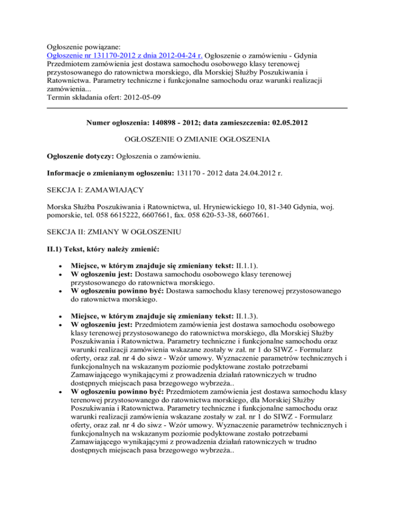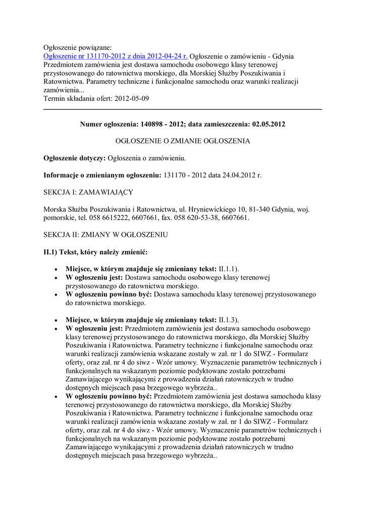 Og oszenie powi zane: Og oszenie nr 131170-2012 z dnia 2012-04-24 r. Og oszenie o zamówieniu - Gdynia Przedmiotem zamówienia jest dostawa samochodu osobowego klasy terenowej przystosowanego do ratownictwa morskiego, dla Morskiej S by Poszukiwania i Ratownictwa. Parametry techniczne i funkcjonalne samochodu oraz warunki realizacji zamówienia... Termin sk adania ofert: 2012-05-09 Numer og oszenia: 140898 - 2012; data zamieszczenia: 02.05.2012 OG OSZENIE O ZMIANIE OG OSZENIA Og oszenie dotyczy: Og oszenia o zamówieniu. Informacje o zmienianym og oszeniu: 131170 - 2012 data 24.04.2012 r. SEKCJA I: ZAMAWIAJ CY Morska S ba Poszukiwania i Ratownictwa, ul. Hryniewickiego 10, 81-340 Gdynia, woj. pomorskie, tel. 058 6615222, 6607661, fax. 058 620-53-38, 6607661. SEKCJA II: ZMIANY W OG OSZENIU II.1) Tekst, który nale y zmieni : Miejsce, w którym znajduje si zmieniany tekst: II.1.1). W og oszeniu jest: Dostawa samochodu osobowego klasy terenowej przystosowanego do ratownictwa morskiego. W og oszeniu powinno by : Dostawa samochodu klasy terenowej przystosowanego do ratownictwa morskiego. Miejsce, w którym znajduje si zmieniany tekst: II.1.3). W og oszeniu jest: Przedmiotem zamówienia jest dostawa samochodu osobowego klasy terenowej przystosowanego do ratownictwa morskiego, dla Morskiej S by Poszukiwania i Ratownictwa. Parametry techniczne i funkcjonalne samochodu oraz warunki realizacji zamówienia wskazane zosta y w za . nr 1 do SIWZ - Formularz oferty, oraz za . nr 4 do siwz - Wzór umowy. Wyznaczenie parametrów technicznych i funkcjonalnych na wskazanym poziomie podyktowane zosta o potrzebami Zamawiaj cego wynikaj cymi z prowadzenia dzia ratowniczych w trudno dost pnych miejscach pasa brzegowego wybrze a.. W og oszeniu powinno by : Przedmiotem zamówienia jest dostawa samochodu klasy terenowej przystosowanego do ratownictwa morskiego, dla Morskiej S by Poszukiwania i Ratownictwa. Parametry techniczne i funkcjonalne samochodu oraz warunki realizacji zamówienia wskazane zosta y w za . nr 1 do SIWZ - Formularz oferty, oraz za . nr 4 do siwz - Wzór umowy. Wyznaczenie parametrów technicznych i funkcjonalnych na wskazanym poziomie podyktowane zosta o potrzebami Zamawiaj cego wynikaj cymi z prowadzenia dzia ratowniczych w trudno dost pnych miejscach pasa brzegowego wybrze a.. Miejsce, w którym znajduje si zmieniany tekst: II.1.5). W og oszeniu jest: 34.11.00.00-1. W og oszeniu powinno by : 34.14.42.00-0. Miejsce, w którym znajduje si zmieniany tekst: IV.4.4). W og oszeniu jest: Termin sk adania wniosków o dopuszczenie do udzia u w post powaniu lub ofert: 09.05.2012. W og oszeniu powinno by : Termin sk adania wniosków o dopuszczenie do udzia u w post powaniu lub ofert: 18.05.2012. Dyrektor Marek D ugosz 02.05.2012r