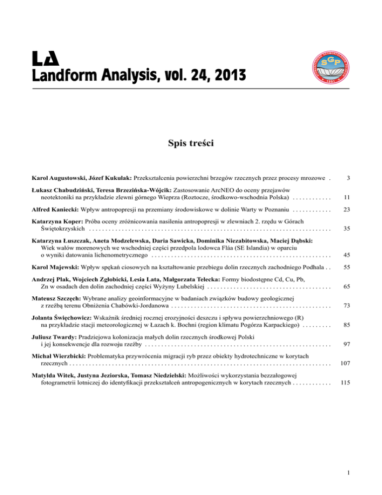 Spis treści Karol Augustowski, Józef Kukulak: Przekształcenia powierzchni brzegów rzecznych przez procesy mrozowe . 3 Łukasz Chabudziński, Teresa Brzezińska-Wójcik: Zastosowanie ArcNEO do oceny przejawów neotektoniki na przykładzie zlewni górnego Wieprza (Roztocze, środkowo-wschodnia Polska) . . . . . . . . . . . . 11 Alfred Kaniecki: Wpływ antropopresji na przemiany środowiskowe w dolinie Warty w Poznaniu . . . . . . . . . . . . 23 Katarzyna Koper: Próba oceny zróżnicowania nasilenia antropopresji w zlewniach 2. rzędu w Górach Świętokrzyskich . . . . . . . . . . . . . . . . . . . . . . . . . . . . . . . . . . . . . . . . . . . . . . . . . . . . . . . . . . . . . . . . . . . . . . . . . . 35 Katarzyna Łuszczak, Aneta Modzelewska, Daria Sawicka, Dominika Niezabitowska, Maciej Dąbski: Wiek wałów morenowych we wschodniej części przedpola lodowca Fláa (SE Islandia) w oparciu o wyniki datowania lichenometrycznego . . . . . . . . . . . . . . . . . . . . . . . . . . . . . . . . . . . . . . . . . . . . . . . . . . . . . . 45 Karol Majewski: Wpływ spękań ciosowych na kształtowanie przebiegu dolin rzecznych zachodniego Podhala . 55 Andrzej Plak, Wojciech Zgłobicki, Lesia Lata, Małgorzata Telecka: Formy biodostępne Cd, Cu, Pb, Zn w osadach den dolin zachodniej części Wyżyny Lubelskiej . . . . . . . . . . . . . . . . . . . . . . . . . . . . . . . . . . . . . 65 Mateusz Szczęch: Wybrane analizy geoinformacyjne w badaniach związków budowy geologicznej z rzeźbą terenu Obniżenia Chabówki-Jordanowa . . . . . . . . . . . . . . . . . . . . . . . . . . . . . . . . . . . . . . . . . . . . . . . . 73 Jolanta Święchowicz: Wskaźnik średniej rocznej erozyjności deszczu i spływu powierzchniowego (R) na przykładzie stacji meteorologicznej w Łazach k. Bochni (region klimatu Pogórza Karpackiego) . . . . . . . . . 85 Juliusz Twardy: Pradziejowa kolonizacja małych dolin rzecznych środkowej Polski i jej konsekwencje dla rozwoju rzeźby . . . . . . . . . . . . . . . . . . . . . . . . . . . . . . . . . . . . . . . . . . . . . . . . . . . . . . . . 97 Michał Wierzbicki: Problematyka przywrócenia migracji ryb przez obiekty hydrotechniczne w korytach rzecznych . . . . . . . . . . . . . . . . . . . . . . . . . . . . . . . . . . . . . . . . . . . . . . . . . . . . . . . . . . . . . . . . . . . . . . . . . . . . . . . 107 Matylda Witek, Justyna Jeziorska, Tomasz Niedzielski: Możliwości wykorzystania bezzałogowej fotogrametrii lotniczej do identyfikacji przekształceń antropogenicznych w korytach rzecznych . . . . . . . . . . . 115 1