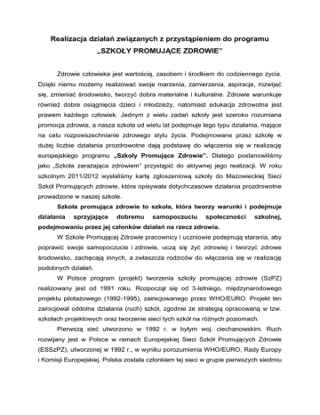 Realizacja działań związanych z przystąpieniem do programu „SZKOŁY PROMUJĄCE ZDROWIE” Zdrowie człowieka jest wartością, zasobem i środkiem do codziennego życia. Dzięki niemu możemy realizować swoje marzenia, zamierzenia, aspiracje, rozwijać się, zmieniać środowisko, tworzyć dobra materialne i kulturalne. Zdrowie warunkuje również dobre osiągnięcia dzieci i młodzieży, natomiast edukacja zdrowotna jest prawem każdego człowiek. Jednym z wielu zadań szkoły jest szeroko rozumiana promocja zdrowia, a nasza szkoła od wielu lat podejmuje tego typu działania, mające na celu rozpowszechnianie zdrowego stylu życia. Podejmowane przez szkołę w dużej liczbie działania prozdrowotne dają podstawę do włączenia się w realizację europejskiego programu „Szkoły Promujące Zdrowie”. Dlatego postanowiliśmy jako „Szkoła zarażająca zdrowiem” przystąpić do aktywnej jego realizacji. W roku szkolnym 2011/2012 wysłaliśmy kartę zgłoszeniową szkoły do Mazowieckiej Sieci Szkół Promujących zdrowie, która opisywała dotychczasowe działania prozdrowotne prowadzone w naszej szkole. Szkoła promująca zdrowie to szkoła, która tworzy warunki i podejmuje działania sprzyjające dobremu samopoczuciu społeczności szkolnej, podejmowaniu przez jej członków działań na rzecz zdrowia. W Szkole Promującej Zdrowie pracownicy i uczniowie podejmują starania, aby poprawić swoje samopoczucie i zdrowie, uczą się żyć zdrowiej i tworzyć zdrowe środowisko, zachęcają innych, a zwłaszcza rodziców do włączania się w realizację podobnych działań. W Polsce program (projekt) tworzenia szkoły promującej zdrowie (SzPZ) realizowany jest od 1991 roku. Rozpoczął się od 3-letniego, międzynarodowego projektu pilotażowego (1992-1995), zainicjowanego przez WHO/EURO. Projekt ten zainicjował oddolne działania (ruch) szkół, zgodnie ze strategią opracowaną w tzw. szkołach projektowych oraz tworzenie sieci tych szkół na różnych poziomach. Pierwszą sieć utworzono w 1992 r. w byłym woj. ciechanowskim. Ruch rozwijany jest w Polsce w ramach Europejskiej Sieci Szkół Promujących Zdrowie (ESSzPZ), utworzonej w 1992 r., w wyniku porozumienia WHO/EURO, Rady Europy i Komisji Europejskiej. Polska została członkiem tej sieci w grupie pierwszych siedmiu krajów. Certyfikaty ESSzPZ otrzymały tylko szkoły uczestniczące w programie pilotażowym, w tym 14 szkół w Polsce (1993). Ustanowienie Certyfikatu „Szkoły Promującej Zdrowie” może przynieść następujące korzyści: − zwiększenie prestiżu szkoły, satysfakcję dla całej społeczności szkolnej oraz motywację do dalszej pracy, − przykłady dobrej praktyki oraz wymianę doświadczeń i współpracę między szkołami, − stworzenie banku danych o szkołach oraz upowszechnianie koncepcji szkoły promującej zdrowie w Polsce. Koncepcja i strategia Szkoły Promującej Zdrowie Koncepcja Szkoły Promującej Zdrowie „wyrosła” z ogólnych założeń promocji zdrowia, rozwijanej przez Światową Organizację Zdrowia oraz z dorobku kilku międzynarodowych konferencji poświęconych szkolnej edukacji zdrowotnej. Nie ma jednej, ogólnie przyjętej definicji takiej szkoły. Każdy kraj wypracowuje swój model SzPZ w zależności od uznawanych wartości oraz własnych doświadczeń. W Polsce koncepcja szkoły promującej zdrowie stale się rozwija i ulega modyfikacjom. Przyjęto, że szkoła promująca zdrowie jest: środowiskiem, którego społeczność nie tylko uczy się i pracuje, ale także żyje - nawiązuje kontakty z innymi, przeżywa porażki i sukcesy, odpoczywa, bawi się itp. W związku z tym jest miejscem, w którym społeczność ma nie tylko wywiązywać się z obowiązków, ale także powinna dobrze się czuć. elementem środowiska lokalnego: oba te środowiska wzajemnie na siebie oddziałują. miejscem, które przygotowuje młodych ludzi nie tylko do następnego etapu edukacji, ale również do życia, w tym do dokonywania „zdrowych” wyborów. Szkoła Promująca Zdrowie to inaczej Szkoła tworząca warunki (fizyczne i społeczne), sprzyjające ochronie i pomnażaniu zdrowia. Szkoła umożliwiająca aktywne uczestnictwo społeczności szkolnej w działaniach na rzecz zdrowia. Zdrowie to cztery wymiary w harmonii fizyczne psychiczne społeczne duchowe Nowa definicja szkoły promującej zdrowie Szkoła promująca zdrowie tworzy warunki i podejmuje działania, które sprzyjają dobremu samopoczuciu społeczności szkolnej, podejmowaniu przez jej członków działań na rzecz zdrowia. Koncepcja Szkoły Promującej Zdrowie oparta jest na spełnianiu standardów określonych dla realizacji programu: Standard pierwszy: Szkoła promująca zdrowie pomaga członkom społeczności szkolnej zrozumieć i akceptować koncepcję szkoły promującej zdrowie. Standard drugi: Szkoła promująca zdrowie zarządza projektami promocji zdrowia w sposób sprzyjający: - uczestnictwu, partnerstwu i współdziałaniu społeczności szkolnej, w tym rodziców i społeczności lokalnej, - skuteczności i długofalowości działań. Standard trzeci: Szkoła promując zdrowie prowadzi edukację zdrowotną uczniów i pracowników oraz dąży do zwiększenia jej jakości i skuteczności. Standard czwarty: Szkoła promująca zdrowie tworzy klimat społeczny sprzyjający: - satysfakcji z nauki i pracy w szkole, osiąganiu sukcesów oraz wzmacnianiu poczucia własnej wartości u uczniów i pracowników, - zdrowiu i rozwojowi uczniów i pracowników, - uczestnictwu, partnerstwu i współdziałaniu członków społeczności szkolnej, rodziców i osób ze społeczności lokalnej. Standard piaty: Szkoła promująca zdrowie tworzy środowisko fizyczne sprzyjające zdrowiu, bezpieczeństwu i dobremu samopoczuciu uczniów i pracowników. W oparciu o określone standardy dla Szkół Promujących Zdrowie oraz wszelkie działania podejmowane w szkole w zakresie promocji zdrowia opracowaliśmy cele, które stały 