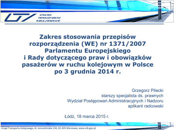 Zakres stosowania przepisów rozporządzenia (WE) nr 1371/2007 Parlamentu Europejskiego i Rady dotyczącego praw i obowiązków pasażerów w ruchu kolejowym w Polsce po 3 grudnia 2014 r. Grzegorz Pilecki starszy specjalista ds. prawnych Wydział Postępowań Administracyjnych i Nadzoru aplikant radcowski Łódź, 18 marca 2015 r. Urząd Transportu Kolejowego, Al. Jerozolimskie 134, 02-305 Warszawa, www.utk.gov.pl Podstawa prawna wyłączeń stosowania przepisów Rozporządzenia 1371 art. 2 Rozporządzenia 1371 ust. 4 (…) państwo członkowskie może w przejrzysty i niedyskryminujący sposób przyznać zwolnienie ze stosowania przepisów niniejszego rozporządzenia na okres nieprzekraczający 5 lat, który może zostać dwukrotnie przedłużony, za każdym razem na okres nieprzekraczający 5 lat, w odniesieniu do krajowych kolejowych połączeń pasażerskich. ust. 5 (…) państwo członkowskie może zwolnić ze stosowania przepisów niniejszego rozporządzenia miejskie, podmiejskie i regionalne kolejowe usługi pasażerskie. (…) ust. 6 Na okres maksymalnie 5 lat państwo członkowskie może w przejrzysty i niedyskryminujący sposób przyznać czasowe zwolnienie, które może zostać przedłużone, ze stosowania przepisów niniejszego rozporządzenia dotyczących określonych usług lub tras, ze względu na to, że istotna część kolejowej usługi pasażerskiej, w tym co najmniej jeden planowany przystanek na stacji, ma miejsce poza Wspólnotą. Urząd Transportu Kolejowego, Al. Jerozolimskie 134, 02-305 Warszawa, www.utk.gov.pl Motyw 26 preambuły do Rozporządzenia 1371 „Miejskie, podmiejskie i regionalne kolejowe usługi pasażerskie mają inny charakter niż usługi dalekobieżne. Dlatego państwa członkowskie powinny mieć możliwość udzielania czasowych zwolnień ze stosowania przepisów niniejszego rozporządzenia dla miejskich, podmiejskich i regionalnych kolejowych usług pasażerskich, z wyjątkiem niektórych przepisów, które powinny mieć zastosowanie do wszelkich kolejowych usług pasażerskich w całej Wspólnocie”. Urząd Transportu Kolejowego, Al. Jerozolimskie 134, 02-305 Warszawa, www.utk.gov.pl Uzasadnienie projektu ustawy z dnia 19 sierpnia 2011 r. o zmianie ustawy o transporcie kolejowym „Prawa pasażera wynikające z Rozporządzenia 1371 przyznają mu natomiast uprawnienia dodatkowe, nieprzewidziane prawem przewozowym. Wyłączenie stosowania niektórych jego przepisów (…) nie wpływa na stosowanie przepisów prawa przewozowego, a gdyby nawet pojawiła się sytuacja objęta unormowaniami obydwu aktów jednocześnie, to niewątpliwie pierwszeństwo przysługuje rozporządzeniu 1371/2007 wraz z wyłączeniami, na które zezwolił polski ustawodawca. Rozporządzenie unijne ma bowiem pierwszeństwo przed aktami prawa krajowego.” Urząd Transportu Kolejowego, Al. Jerozolimskie 134, 02-305 Warszawa, www.utk.gov.pl Wyłączenie bezterminowe stosowania przepisów Rozporządzenia 1371 Art. 3a. u.o.t.k. Przepisów Rozporządzenia 1371 z wyjątkiem przepisów art. 4, art. 5, art. 8 ust. 1, art. 9, art. 11, art. 12, art. 16, art. 19, art. 20 ust. 1, art. 21 ust. 2, art. 22, art. 23, art. 24, art. 26, art. 27, art. 28 i art. 29 tego rozporządzenia, nie stosuje się do miejskich, podmiejskich i regionalnych kolejowych przewozów osób. Urząd Transportu Kolejowego, Al. Jerozolimskie 134, 02-305 Warszawa, www.utk.gov.pl Faktyczny zakres wyłączeń z art. 3a u.o.t.k. Dotyczy wszystkich pociągów osobowych przewoźników samorządowych takich jak: • Koleje Mazowieckie, • Koleje Dolnośląskie, • Koleje Śląskie, • Koleje Małopolskie, • Koleje Wielkopolskie, • Arriva RP, • Łódzka Kolej Aglomeracyjna, • Szybka Kolej Miejska w Warszawie, • PKP SKM w Trójmieście, • Warszawska Kolej Dojazdowa, • pociągów REGIO Przewozów Regionalnych Urząd Transportu Kolejowego, Al. Jerozolimskie 134, 02-305 Warszawa, www.utk.gov.pl Uprzednie wyłączenie terminowe stosowania przepisów Rozporządzenia 1371 Rozporządzenia Ministra Infrastruktury z dnia 25 maja 2011 r. w sprawie zwolnienia ze stosowania niektórych przepisów Rozporządzenia 1371 § 1. Przepisów Rozporządzenia 1371 z wyjątkiem art. 4, art. 5, art. 7, art. 8 ust. 1, art. 9, art. 11, art. 12, art. 16, art. 19, art. 20 ust. 1, art. 21 ust. 2, art. 22, art. 23, art. 24, art. 25, art. 26, art. 27, art. 28 i art. 29, nie stosuje się do kolejowych krajowych połączeń pasażerskich oraz połączeń ze stacjami położonymi poza granicami Unii Europejskiej, ujętych w rozkładzie jazdy pociągów obowiązującym w danym roku, z zastrzeżeniem § 2. § 2. Do kolejowych krajowych połączeń pasażerskich oraz połączeń ze stacjami położonymi poza granicami Unii Europejskiej, realizowanych pociągami rodzaju Ekspres, InterCity, Express InterCity, EuroCity oraz EuroNight, stosuje się także art. 13 i art. 17 Rozporządzenia 1371. Urząd Transportu Kolejowego, Al. Jerozolimskie 134, 02-305 Warszawa, www.utk.gov.pl Rozporządzenie Ministra Infrastruktury i Rozwoju z dnia 20 listopada 2014 r. § 1. Do krajowych połączeń pasażerskich oraz połączeń ze stacjami położonymi poza granicami Unii Europejskiej, ujętych w rozkładzie jazdy pociągów obowiązującym w danym roku, nie stosuje się art. 8 ust. 3, art. 10 i art. 21 ust. 1 Rozporządzenia 1371. a contrario § 1 do krajowych połączeń pasażerskich oraz połączeń ze stacjami położonymi poza granicami Unii Europejskiej stosuje się pozostałe przepisy Rozporządzenia 1371 § 3. Rozporządzenie wchodzi w życie z dniem 3 grudnia 2014 r. Urząd Transportu Kolejowego, Al. Jerozolimskie 134, 02-305 Warszawa, www.utk.gov.pl Aktualny zakres obowiązywania przepisów Rozporządzenia 1371 w stosunku do przewoźników krajowych Z wyjątkiem art. 8 ust. 3, art. 10 i art. 21 ust. 1 – Rozporządzenie stosuje się w całości do: a) krajowych pociągów dalekobieżnych kategorii: Express InterCity (EIC), Express InterCity Premium