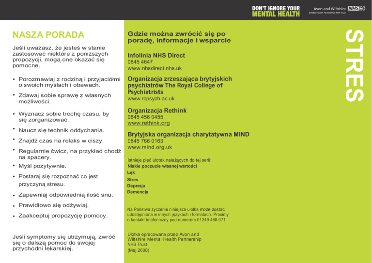 Gdzie można zwrócić się po poradę, informacje i wsparcie Jeśli uważasz, że jesteś w stanie zastosować niektóre z poniższych propozycji, mogą one okazać się pomocne. Infolinia NHS Direct • Porozmawiaj z rodziną i przyjaciółmi o swoich myślach i obawach. • Zdawaj sobie sprawę z własnych możliwości. • Wyznacz sobie trochę czasu, by się zorganizować. • Naucz się technik oddychania. • Znajdź czas na relaks w ciszy. • Regularnie ćwicz, na przykład chodź na spacery. • Myśl pozytywnie. • Postaraj się rozpoznać co jest przyczyną stresu. • Zapewniaj odpowiednią ilość snu. • Prawidłowo się odżywiaj. 0845 4647 www.nhsdirect.nhs.uk Organizacja zrzeszająca brytyjskich psychiatrów The Royal College of Psychiatrists www.rcpsych.ac.uk Organizacja Rethink 0845 456 0455 www.rethink.org Brytyjska organizacja charytatywna MIND 0845 766 0163 www.mind.org.uk Istnieje pięć ulotek należących do tej serii: Niskie poczucie własnej wartości Lęk Stres Depresja Demencja • Zaakceptuj propozycję pomocy. Na Państwa życzenie niniejsza ulotka może zostać udostępniona w innych językach i formatach. Prosimy o kontakt telefoniczny pod numerem 01249 468 071 Jeśli symptomy się utrzymują, zwróć się o dalszą pomoc do swojej przychodni lekarskiej. Ulotka opracowana przez Avon and Wiltshire Mental Health Partnership NHS Trust (Maj 2008) STRES NASZA PORADA CO TO JEST STRES? Każdy z nas w jakimś momencie swojego życia doświadcza pewnych form stresu. PRZYCZYNY SYMPTOMY Zazw yczaj nie ma jednej określonej Oznakami stresu są: przyczyny pojawienia się stresu, ale • utrata koncentracji, spowodowany on jest nagromadzeniem Stres nie zawsze jest szkodliwy, gdyż każdy się małych problemów. • zwiększona wrażliwość na krytykę, • przejawy napięcia, na przykład z nas potrzebuje mieć jakieś cele i wyzwania. Do głównych przyczyn stresu należą: Jednakże zbyt wiele stresu może być • zmartwienia finansowe, szkodliwe, wywołać chorobę i przyczynić się • problemy w związkach z innymi, sen, problemy z zasypianiem i problemy • przeprowadzka, z budzeniem się, do powstania problemów fizycznych i emocjonalnych. • żałoba, • praca, życie szkolne lub presja studiów, • bezrobocie, obgryzanie paznokci, • problemy ze spaniem, w tym niespokojny • picie większej ilości alkoholu niż zazwyczaj, • palenie większej ilości papierosów niż zazwyczaj, • rozwód, • zwiększona skłonność do irytacji, • zmiana kariery. • utrata apetytu, • problemy skórne. NIE IGNORUJ SWOJEGO ZDROWIA PSYCHICZNEGO NIE IGNORUJ SWOJEGO ZDROWIA PSYCHICZNEGO