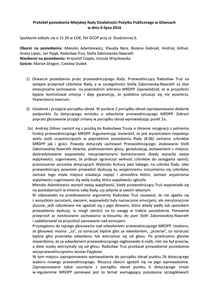 Protokół posiedzenia Miejskiej Rady Działalności Pożytku Publicznego w Gliwicach w dniu 6 lipca 2016 Spotkanie odbyło się o 15.30 w COK, filii GCOP przy ul. Studziennej 6. Obecni na posiedzeniu: Mieszko Adamkiewicz, Klaudia Bera, Bożena Gabryel, Andrzej Gillner, Aneta Lipiec, Jan Pająk, Radosław Truś, Stella Zaborowska-Nawrath Nieobecni na posiedzeniu: Krzysztof Czapla, Urszula Więckowska Goście: Marian Dragon, Czesław Dudek 1) Otwarcie posiedzenia przez przewodniczącego Rady. Przewodniczący Radosław Truś na wstępie przeprosił członków Rady, a w szczególności Stellę Zaborowską-Nawrath za zbyt emocjonalne zachowanie na poprzednim zebraniu MRDPP. Zapowiedział, że w przyszłości będzie kontrolował emocje i daje gwarancję, że podobna sytuacja się nie powtórzy. Stwierdzono kworum. 2) Ustalenie i przyjęcie porządku obrad. W punkcie 2 porządku obrad zaproponowano dodanie podpunktu 2a dotyczącego wniosku o odwołanie przewodniczącego MRDPP. Zebrani poprzez głosowanie przyjęli zmiany w porządku obrad wprowadzając punkt 2a. 2a) Andrzej Gillner zwrócił się z prośbą do Radosława Trusia o złożenie rezygnacji z pełnienia funkcji przewodniczącego MRDPP. Argumentując stwierdził, że jest wyrazicielem niepokoju wielu osób uczestniczących w poprzednim posiedzeniu Rady (8.06) zarówno członków MRDPP jak i gości. Powody dotyczyły zachowań Przewodniczącego: atakowanie Stelli Zaborowskiej-Nawrath słownie, podnoszeniem głosu, gestykulacją, wstawaniem z miejsca; dyskredytowanie wypowiedzi nieuprawnionymi komentarzami (kiedy wyraziła swoje wątpliwości, sugerowano, że próbuje ograniczyć wolność członków do zasięgania opinii); przenoszenie zarzutów dotyczących Wydziału Kultury jako takiego, na członka Rady. Jako przewodniczący powinien prowadzić dyskusję ku wzajemnemu zrozumieniu się członków, zamiast tego miała miejsce eskalacja napięć i atmosfera kłótni; zamiast wyjaśniania wątpliwości sugerowano złą wolę osoby, która wątpliwości zgłosiła. Mieszko Adamkiewicz wyraził swoją wątpliwość, kiedy przewodniczący Truś wypowiada się na posiedzeniach w imieniu całej Rady, czy jedynie w swoim własnym. W odpowiedzi na przedstawione argumenty Radosław Truś zauważył, że nie zgadza się z wszystkimi zarzutami, owszem, wypowiedzi były naznaczone emocjami, ale merytorycznie słuszne, jeśli członkowie nie zgadzali się z jego słowami, które wtedy padły lub sposobem prowadzenia dyskusji, to mogli zwrócić na to uwagę w trakcie posiedzenia. Ponownie przeprosił za niestosowne zachowania w stosunku do pani Stelli Zaborowskiej-Nawrath i zadeklarował na przyszłość panowanie nad emocjami. Przystąpiono do tajnego głosowania nad odwołaniem przewodniczącego MRDPP. Ustalono, że głosować można: „za”, co oznaczać będzie głos za odwołaniem, „przeciw”, co oznaczać będzie głos przeciwko odwołaniu lub wstrzymać się od głosu. Po przeliczeniu głosów stwierdzono, że za odwołaniem przewodniczącego zagłosowało 6 osób, nikt nie był przeciw, a dwie osoby wstrzymały się od głosu. Radosław Truś przekazał prowadzenie posiedzenia wiceprzewodniczącemu Janowi Pająkowi. W tym miejscu zaproponowano wprowadzenie do porządku obrad punktu 2b dotyczącego wyboru nowego przewodniczącego. Wszyscy obecni zgodzili się na jego wprowadzenie. Zaproponowano także usunięcie z porządku obrad punktu 6 dotyczącego zmian w regulaminie MRDPP ponieważ jest to temat wymagający pozyskania szczegółowych informacji i przeprowadzenia oddzielnej dyskusji. Jan Pająk stwierdził, że lepiej będzie zająć się tą kwestią po okresie urlopowym, kiedy wszyscy członkowie będą mogli być obecni na posiedzeniu MRDPP. Ostatecznie zebrani w drodze głosowania zadecydowali, że temat zmian w regulaminie MRDPP zostanie usunięty z porządku obrad bieżącego posiedzenia. 2b) Jan Pająk poprosił o zgłaszanie kandydatur na stanowisko przewodniczącego MRDPP. Andrzej Gillner zgłosił kandydaturę Anety Lipiec, która wyraziła zgodę na kandydowanie. Ustalono, że można oddać głos: „za” – za kandydaturą Anety Lipiec, „przeciw” – przeciwko jej kandydaturze, lub wstrzymać się od głosu. W tajnym głosowaniu wszyscy obecni opowiedzieli się za kandydaturą Anety Lipiec na stanowisko przewodniczącej MRDPP. Nowo wybrana przewodnicząca przejęła prowadzenie posiedzenia. 3) Przyjęcie protokołu poprzedniego posiedzenia. Radosław Truś zauważył, że zgłosił poprawki do protokołu z ostatniego posiedzenia (8.06.2016) i zostały one wprowadzone, jednak w ostatecznej wersji dokumentu znalazły się także poprawki Stelli Zaborowskiej-Nawrath, które nie zostały wcześniej skonsultowane z pozostałymi członkami Rady. Andrzej Gillner poinformował, że był przekonany, iż informacja o tych poprawkach dotarła do wszystkich członków Rady. Jednocześnie zauważył, że modyfikacje zaproponowane przez Stellę Zaborowską-Nawrath i Radosława Trusia były ze sobą sprzeczne. Radosław Truś zapytał sekretarza, czy uważa, że tego rodzaju działanie było w tej sytuacji poprawne. Andrzej Gillner stwierdził, że należało poinformować wszystkich członków Rady o każdej propozycji zapisów, niemniej ponieważ protokół nie został dotąd przyjęty, w związku z czym można przedyskutować i wprowadzić właściwe zmiany. Rozpoczęto dyskusję nad punktem 5, w którym zapisano, że: „pani Stella Zaborowska-Nawrath zauważyła, że Rada może zasięgnąć opinii ekspertów, jeśli jest taka potrzeba.” Radosław Truś zaproponował zmianę słowa „zauważyła” na „przyznała”, na co nie zgodziła się Stella Zaborowska-Nawrath. Stwierdziła jednocześnie, że poprawki do protokołu powinny dotyczyć kwestii merytorycznych, a nie pojedynczych słów, które nie mają znaczenia dla treści protokołu. Klaudia Bera stwierdziła, że problem wynika z niezrozumienia szczegółów dot