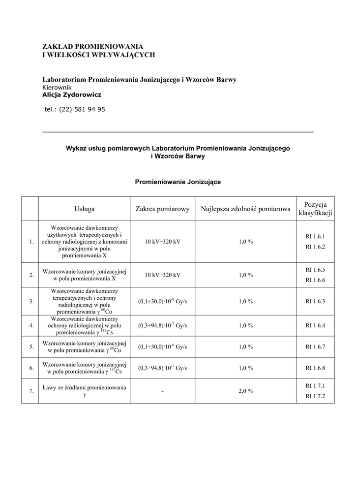 ZAKŁAD PROMIENIOWANIA I WIELKOŚCI WPŁYWAJĄCYCH Laboratorium Promieniowania Jonizującego i Wzorców Barwy Kierownik Alicja Zydorowicz tel.: (22) 581 94 95 Wykaz usług pomiarowych Laboratorium Promieniowania Jonizującego i Wzorców Barwy Promieniowanie Jonizujące Pozycja klasyfikacji Usługa Zakres pomiarowy Najlepsza zdolność pomiarowa 1. Wzorcowanie dawkomierzy użytkowych terapeutycznych i ochrony radiologicznej z komorami jonizacyjnymi w polu promieniowania X 10 kV÷320 kV 1,0 % 2. Wzorcowanie komory jonizacyjnej w polu promieniowania X 10 kV÷320 kV 1,0 % (0,1÷30,0)·10-6 Gy/s 1,0 % RI 1.6.3 (0,3÷94,8)·10-7 Gy/s 1,0 % RI 1.6.4 3. 4. Wzorcowanie dawkomierzy terapeutycznych i ochrony radiologicznej w polu promieniowania γ 60Co Wzorcowanie dawkomierzy ochrony radiologicznej w polu promieniowania γ 137Cs RI 1.6.1 RI 1.6.2 RI 1.6.5 RI 1.6.6 5. Wzorcowanie komory jonizacyjnej w polu promieniowania γ 60Co (0,1÷30,0)·10-6 Gy/s 1,0 % RI 1.6.7 6. Wzorcowanie komory jonizacyjnej w polu promieniowania γ 137Cs (0,3÷94,8)·10-7 Gy/s 1,0 % RI 1.6.8 7. Ławy ze źródłami promieniowania γ - 2,0 % RI 1.7.1 RI 1.7.2