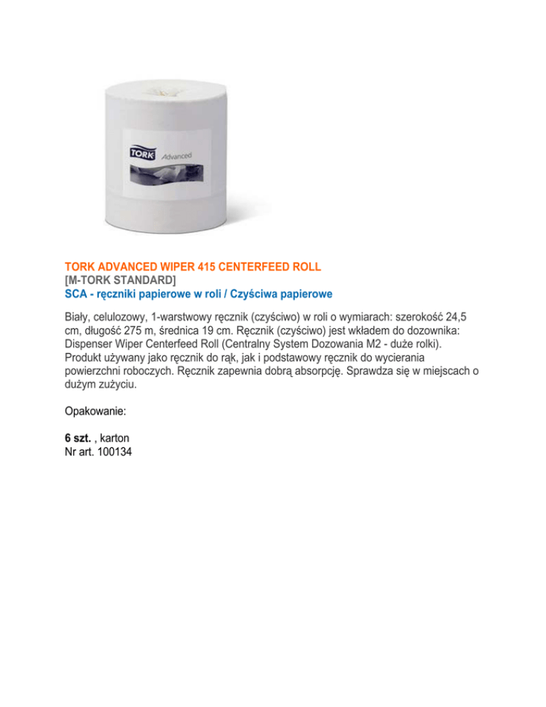 TORK ADVANCED WIPER 415 CENTERFEED ROLL [M-TORK STANDARD] SCA - ręczniki papierowe w roli / Czyściwa papierowe Biały, celulozowy, 1-warstwowy ręcznik (czyściwo) w roli o wymiarach: szerokość 24,5 cm, długość 275 m, średnica 19 cm. Ręcznik (czyściwo) jest wkładem do dozownika: Dispenser Wiper Centerfeed Roll (Centralny System Dozowania M2 - duŜe rolki). Produkt uŜywany jako ręcznik do rąk, jak i podstawowy ręcznik do wycierania powierzchni roboczych. Ręcznik zapewnia dobrą absorpcję. Sprawdza się w miejscach o duŜym zuŜyciu. Opakowanie: 6 szt. , karton Nr art. 100134