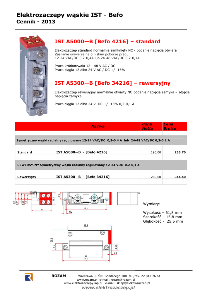 Elektrozaczepy wąskie IST - Befo Cennik - 2013 IST A5000—B [Befo 4216] – standard Elektrozaczep standard normalnie zamknięty NC - podanie napięcia otwiera Zasilanie uniwersalne o niskim poborze prądu 12-24 VAC/DC 0,2-0,4A lub 24-48 VAC/DC 0,2-0,1A Praca krótkotrwała 12 - 48 V AC / DC Praca ciągła 12 albo 24 V AC / DC +/- 15% IST A5300—B [Befo 34216] – rewersyjny Elektrozaczep rewersyjny normalnie otwarty NO podanie napięcia zamyka – zdjęcie napięcia zamyka Praca ciągła 12 albo 24 V DC +/- 15% 0,2-0,1 A Nazwa Cena Netto Cena Brutto Symetryczny wąski radialny regulowany 12-24 VAC/DC 0,2-0,4 A lub 24-48 VAC/DC 0,2-0,1 A Standard IST A5000—B - [Befo 4216] 190,00 233,70 280,00 344,40 REWERSYJNY Symetryczny wąski radialny regulowany 12-24 VDC 0,2-0,1 A Rewersyjny IST A5300—B - [Befo 34216] Wymiary: Wysokość – 61,8 mm Szerokość – 15,8 mm Głębokość - 25,5 mm ROZAM Warszawa ul. Św. Bonifacego 100 tel./fax. 22 842 76 61 www.rozam.pl e-mail: [email protected] www.elektrozaczepy.lap.pl e-mail: [email protected] www.elektrozaczep.pl Elektrozaczepy wąskie IST Cennik - 2013 IST A5001—B standard z czujnikiem, mikroprzełącznikiem Elektrozaczep standard z czujnikiem, mikroprzełącznikiem jako styk sygnałowy, normalnie zamknięty NC - podanie napięcia otwiera Zasilanie uniwersalne o niskim poborze prądu 12-24 VAC/DC 0,2-0,4A lub 24-48 VAC/DC 0,2-0,1A Praca krótkotrwała 12 - 48 V AC / DC Praca ciągła 12 albo 24 V AC / DC +/- 15% IST A5301—B rewersyjny z czujnikiem z czujnikiem, mikroprzełącznikiem Elektrozaczep rewersyjny czujnikiem, mikroprzełącznikiem jako styk sygnałowy, normalnie otwarty NO podanie napięcia zamyka – zdjęcie napięcia zamyka Praca ciągła 12 albo 24 V DC +/- 15% 0,2-0,1 A Cena Netto Nazwa Cena Brutto Symetryczny wąski radialny regulowany 12-24 VAC/DC 0,2-0,4 A lub 24-48 VAC/DC 0,2-0,1 A Standard z czujnikiem IST A5001—B 380,00 467,40 485,00 596,55 REWERSYJNY Symetryczny wąski radialny regulowany 12-24 VDC 0,2-0,1 A Rewersyjny z czujnikiem IST A5301—B Elektrozaczep z czujnikiem Wymiary: Wysokość – 64,55 mm Szerokość – 15,8 mm Głębokość - 25,5 mm ROZAM Warszawa ul. Św. Bonifacego 100 tel./fax. 22 842 76 61 www.rozam.pl e-mail: [email protected] www.elektrozaczepy.lap.pl e-mail: [email protected] www.elektrozaczep.pl Elektrozaczepy wąskie IST Cennik - 2013 z wyłącznikiem IST A5010—B – standard z wyłącznikiem Elektrozaczep standard z wyłącznikiem normalnie zamknięty NC - podanie napięcia otwiera z funkcją stałego odblokowania (mechaniczna dźwigienka zwalniająca) Zasilanie uniwersalne o niskim poborze prądu 12-24 VAC/DC 0,2-0,4A lub 24-48 VAC/DC 0,2-0,1A Praca krótkotrwała 12 - 48 V AC / DC Praca ciągła 12 albo 24 V AC / DC +/- 15% Nazwa Cena Netto Cena Brutto Symetryczny wąski radialny regulowany 12-24 VAC/DC 0,2-0,4 A lub 24-48 VAC/DC 0,2-0,1 A Standard z wyłącznikiem IST A5010—B 220,00 270,60 Wymiary: Wysokość – 61,8 mm Szerokość – 15,8 mm Głębokość - 25,5 mm ROZAM Warszawa ul. Św. Bonifacego 100 tel./fax. 22 842 76 61 www.rozam.pl e-mail: [email protected] www.elektrozaczepy.lap.pl e-mail: [email protected] www.elektrozaczep.pl Elektrozaczepy wąskie IST Cennik - 2013 z wyłącznikiem i z czujnikiem IST A5011—B standard z wyłącznikiem i z czujnikiem, mikroprzełącznikiem Elektrozaczep standard z wyłącznikiem i z czujnikiem, mikroprzełącznikiem jako styk sygnałowy oraz z funkcją stałego odblokowania (mechaniczna dźwigienka zwalniająca) normalnie zamknięty NC - podanie napięcia otwiera Zasilanie uniwersalne o niskim poborze prądu 12-24 VAC/DC 0,2-0,4A lub 24-48 VAC/DC 0,2-0,1A Praca krótkotrwała 12 - 48 V AC / DC Praca ciągła 12 albo 24 V AC / DC +/- 15% Nazwa Cena Netto Cena Brutto Symetryczny wąski radialny regulowany 12-24 VAC/DC 0,2-0,4 A lub 24-48 VAC/DC 0,2-0,1 A Standard z wyłącznikiem i z czujnikiem IST A5011—B 430,00 528,90 Elektrozaczep z czujnikiem Wymiary: Wysokość – 64,55 mm Szerokość – 15,8 mm Głębokość - 25,5 mm ROZAM Warszawa ul. Św. Bonifacego 100 tel./fax. 22 842 76 61 www.rozam.pl e-mail: [email protected] www.elektrozaczepy.lap.pl e-mail: [email protected] www.elektrozaczep.pl