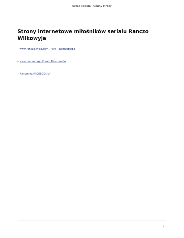 Urzad Miasta i Gminy Mrozy Strony internetowe miłośników serialu Ranczo Wilkowyje ● www.ranczo.wikia.com - Fani Ranczopedia ● www.ranczo.org - Forum Ranczersów ● Ranczo na FACEBOOK'U 1