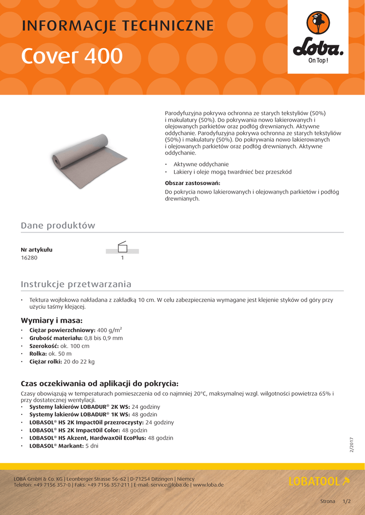 INFORMACJE TECHNICZNE Cover 400 Parodyfuzyjna pokrywa ochronna ze starych tekstyliów (50%) i makulatury (50%). Do pokrywania nowo lakierowanych i olejowanych parkietów oraz podłóg drewnianych. Aktywne oddychanie. Parodyfuzyjna pokrywa ochronna ze starych tekstyliów (50%) i makulatury (50%). Do pokrywania nowo lakierowanych i olejowanych parkietów oraz podłóg drewnianych. Aktywne oddychanie. • A ktywne oddychanie • L akiery i oleje mogą twardnieć bez przeszkód Obszar zastosowań: Do pokrycia nowo lakierowanych i olejowanych parkietów i podłóg drewnianych. Dane produktów Nr artykułu 16280 1 Instrukcje przetwarzania • Tektura wojłokowa nakładana z zakładką 10 cm. W celu zabezpieczenia wymagane jest klejenie styków od góry przy użyciu taśmy klejącej. Wymiary i masa: • • • • • Ciężar powierzchniowy: 400 g/m² Grubość materiału: 0,8 bis 0,9 mm Szerokość: ok. 100 cm Rolka: ok. 50 m Ciężar rolki: 20 do 22 kg Czasy obowiązują w temperaturach pomieszczenia od co najmniej 20°C, maksymalnej wzgl. wilgotności powietrza 65% i przy dostatecznej wentylacji. • Systemy lakierów LOBADUR® 2K WS: 24 godziny • Systemy lakierów LOBADUR® 1K WS: 48 godzin • LOBASOL® HS 2K ImpactOil przezroczysty: 24 godziny • LOBASOL® HS 2K ImpactOil Color: 48 godzin • LOBASOL® HS Akzent, HardwaxOil EcoPlus: 48 godzin • LOBASOL® Markant: 5 dni 2/2017 Czas oczekiwania od aplikacji do pokrycia: LOBA GmbH & Co. KG | Leonberger Strasse 56-62 | D-71254 Ditzingen | Niemcy Telefon: +49 7156 357-0 | Faks: +49 7156 357-211 | E-mail: [email protected] | www.loba.de Strona 1/2 INFORMACJE TECHNICZNE Cover 400 Instrukcje przetwarzania Ważne wskazówki Nie umieszczać taśmy klejącej na powierzchni lakierowanej lub olejowanej. Tektura wojłokowa nie gwarantuje ochrony przed działaniem wilgoci. Jeżeli wilgoć przeniknie na lub pod pokrycie, należy liczyć się ze szkodami, np. zmianą koloru drewna, pęcznieniem i deformacjami elementów parkietu. Duże obciążenie mechaniczne lub silne zanieczyszczenia powierzchni spowodowane przez kolejnych wykonawców mogą wymagać dodatkowych środków ochronnych, np. nałożenie płyt pilśniowych. Zasady ogólne Czas suszenia: Podane czasy suszenia obowiązują w temperaturze +20°C i przy wilgotności względnej 55% do 65% oraz przy starannej wentylacji pomieszczeń roboczych, bez przeciągów. Niższe temperatury, wyższa względna wilgotność powietrza, gorsza wentylacja prowadzą do wydłużenia czasów suszenia. Przed osiągnięciem końcowej twardości nie wykonywać czyszczenia i nie układać dywanów. Do przykrycia powierzchni przed osiągnięciem końcowej twardości użyć środka LOBATOOL Cover 400. Wytyczne specyficzne dla produktu znajdują się w odpowiednich dokumentacjach technicznych. 2/2017 Informacje zawarte w niniejszym dokumencie i wszystkie inne wskazówki oraz zalecenia podawane jako doradztwo wykonawcze są wynikiem dotychczasowych doświadczeń i odnoszą się do warunków normatywnych. W związku z różnorodnymi możliwościami zastosowań i warunkami obróbki niniejszym nie zwalniamy użytkownika z przeprowadzania własnych prób lub zasięgnięcia rady przez kontakt z firmą LOBA-Anwendungstechnik. Przestrzegać zaleceń producentów wykładzin i aktualnych norm. Nasze zasady rękojmi i odpowiedzialności są określone w Ogólnych Warunkach Handlowych i nie podlegają rozszerzeniu przez udzielanie przez nas informacji jak i doradztwo. Wydanie nowej informacji technicznej anuluje obowiązywanie starej informacji. LOBA GmbH & Co. KG | Leonberger Strasse 56-62 | D-71254 Ditzingen | Niemcy Telefon: +49 7156 357-0 | Faks: +49 7156 357-211 | E-mail: [email protected] | www.loba.de Strona 2/2