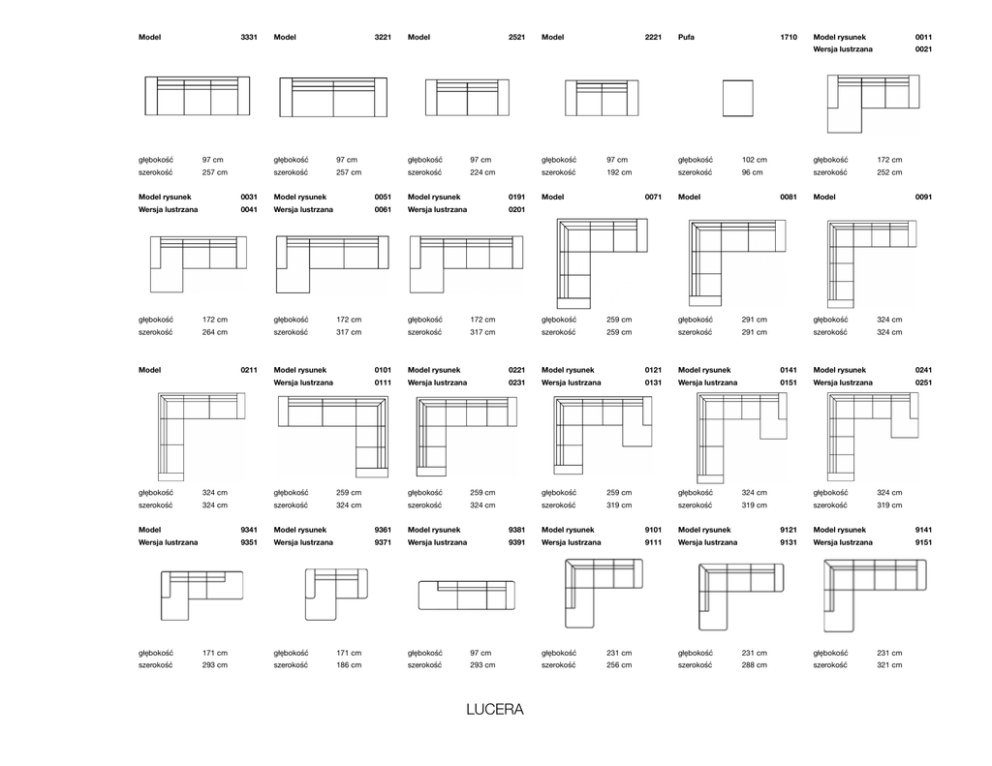 Model 3331 Model 3221 Model 2521 Model 2221 Pufa 1710 Model rysunek 0011 Wersja lustrzana 0021 głębokość 97 cm głębokość 97 cm głębokość 97 cm głębokość 97 cm głębokość 102 cm głębokość 172 cm szerokość 257 cm szerokość 257 cm szerokość 224 cm szerokość 192 cm szerokość 96 cm szerokość 252 cm Model rysunek 0031 Model rysunek 0051 Model rysunek 0191 Wersja lustrzana 0041 Wersja lustrzana 0061 Wersja lustrzana 0201 Model 0071 Model 0081 Model 0091 głębokość 172 cm głębokość 172 cm głębokość 172 cm głębokość 259 cm głębokość 291 cm głębokość 324 cm szerokość 264 cm szerokość 317 cm szerokość 317 cm szerokość 259 cm szerokość 291 cm szerokość 324 cm Model 0211 Model rysunek 0101 Model rysunek 0221 Model rysunek 0121 Model rysunek 0141 Model rysunek 0241 Wersja lustrzana 0111 Wersja lustrzana 0231 Wersja lustrzana 0131 Wersja lustrzana 0151 Wersja lustrzana 0251 głębokość 324 cm głębokość 259 cm głębokość 259 cm głębokość 259 cm głębokość 324 cm głębokość 324 cm szerokość 324 cm szerokość 324 cm szerokość 324 cm szerokość 319 cm szerokość 319 cm szerokość 319 cm Model 9341 Model rysunek 9361 Model rysunek 9381 Model rysunek 9101 Model rysunek 9121 Model rysunek 9141 Wersja lustrzana 9351 Wersja lustrzana 9371 Wersja lustrzana 9391 Wersja lustrzana 9111 Wersja lustrzana 9131 Wersja lustrzana 9151 głębokość 171 cm głębokość 171 cm głębokość 97 cm głębokość 231 cm głębokość 231 cm głębokość 231 cm szerokość 293 cm szerokość 186 cm szerokość 293 cm szerokość 256 cm szerokość 288 cm szerokość 321 cm LUCERA Model rysunek 9161 Model rysunek 9181 Model rysunek 9401 Model rysunek 9201 Model rysunek 9421 Wersja lustrzana 9171 Wersja lustrzana 9191 Wersja lustrzana 9411 Wersja lustrzana 9211 Wersja lustrzana 9431 głębokość 231 cm głębokość 231 cm głębokość 231 cm głębokość 231 cm głębokość 231 cm szerokość 321 cm szerokość 321 cm szerokość 353 cm szerokość 386 cm szerokość 386 cm Poduszka 1000015 Poduszka 1000016 wysokość 17 cm wysokość 17 cm szerokość 60 cm szerokość 81 cm LUCERA
