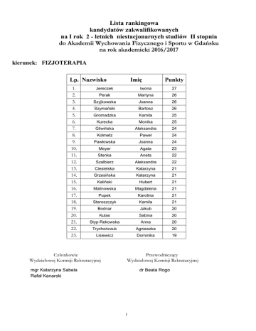 Lista rankingowa kandydatów zakwalifikowanych na I rok 2 - letnich niestacjonarnych studiów II stopnia do Akademii Wychowania Fizycznego i Sportu w Gdańsku na rok akademicki 2016/2017 kierunek: FIZJOTERAPIA Lp. Nazwisko 1. 2. 3. 4. 5. 6. 7. 8. 9. 10. 11. 12. 13. 14. 15. 16. 17. 18. 19. 20. 21. 22. 23. Imię Punkty Jereczek Iwona 27 Perak Martyna 26 Szyjkowska Joanna 26 Szymański Bartosz 26 Gromadzka Kamila 25 Kurecka Monika 25 Gliwińska Aleksandra 24 Kolmetz Paweł 24 Pawłowska Joanna 24 Meyer Agata 23 Stenka Aneta 22 Szalbierz Aleksandra 22 Ciesielska Katarzyna 21 Grzesińska Katarzyna 21 Kaliński Hubert 21 Malinowska Magdalena 21 Pupek Karolina 21 Staroszczyk Kamila 21 Bodnar Jakub 20 Kulas Sabina 20 Styp-Rekowska Anna 20 Trychończuk Agnieszka 20 Lisiewicz Dominika 19 Członkowie Wydziałowej Komisji Rekrutacyjnej Przewodniczący Wydziałowej Komisji Rekrutacyjnej mgr Katarzyna Sabela Rafał Kanarski dr Beata Rogo 1 Lp. Nazwisko 24. 25. 26. 27. 28. 29. 30. 31. 32. 33. 34. 35. 36. 37. 38. 39. 40. 41. 42. 43. 44. Imię Punkty Tarasiuk Tomasz 19 Wijas Nina 19 Heller Adam 18 Jeka Karol 18 Pestka Martyna 18 Przybyłek Bartosz 18 Klunder Joanna 17 Ratkowska Monika 17 Tęcza Karolina 17 Żyrek Angelika 17 Brzeziński Igor 16 Dytkiewicz Tomasz 16 Prokopiuk Katarzyna 16 Wielgosz Michał 16 Olbromska Iwona 15 Tokarska Diana 15 Kowalski Adam 13 Urbańska Anna 13 Grądziel Lucyna 12 Wiśniewska Laura 12 Ostęp Adam 11 Członkowie Wydziałowej Komisji Rekrutacyjnej Przewodniczący Wydziałowej Komisji Rekrutacyjnej mgr Katarzyna Sabela Rafał Kanarski dr Beata Rogo 2