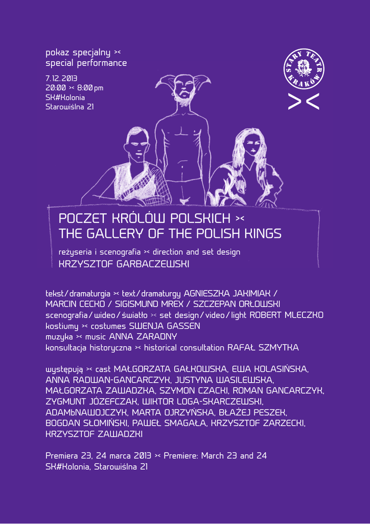 pokaz specjalny >< special performance 7. 12. 2013 20:00 >< 8:00 pm SK#Kolonia Starowiślna 21 POCZET KRÓLÓW POLSKICH >< THE GALLERY OF THE POLISH KINGS reżyseria i scenografia >< direction and set design KRZYSZTOF GARBACZEWSKI tekst / dramaturgia >< text / dramaturgy AGNIESZKA JAKIMIAK / MARCIN CECKO / SIGISMUND MREX / SZCZEPAN ORŁOWSKI scenografia / wideo / światło >< set design / video / light ROBERT MLECZKO kostiumy >< costumes SWENJA GASSEN muzyka >< music ANNA ZARADNY konsultacja historyczna >< historical consultation RAFAŁ SZMYTKA występują >< cast MAŁGORZATA GAŁKOWSKA, EWA KOLASIŃSKA, ANNA RADWAN-GANCARCZYK, JUSTYNA WASILEWSKA, MAŁGORZATA ZAWADZKA, SZYMON CZACKI, ROMAN GANCARCZYK, ZYGMUNT JÓZEFCZAK, WIKTOR LOGA-SKARCZEWSKI, ADAMbNAWOJCZYK, MARTA OJRZYŃSKA, BŁAŻEJ PESZEK, BOGDAN SŁOMIŃSKI, PAWEŁ SMAGAŁA, KRZYSZTOF ZARZECKI, KRZYSZTOF ZAWADZKI Premiera 23, 24 marca 2013 >< Premiere: March 23 and 24 SK#Kolonia, Starowiślna 21 Zaskakujący, porywający wizualnie i myślowo intrygujący spektakl. Rzecz rozgrywa się na Wawelu, który w czasie II wojny światowej przekształcony został w siedzibę hitlerowskiego gubernatora Hansa Franka. Ale toczy się też w teatrze, i to zarówno na scenie, jak i w kulisach i w podziemiach. Przede wszystkim jednak – na ekranie, bo znaczna część przedstawienia jest filmowana (na żywo) i wyświetlana na wielkim płótnie zasłaniającym niemal całą scenę. Istota przedstawienia, które mierzy się z obezwładniającymi nas historycznymi mitami, nie polega na śledzeniu linearnego przebiegu akcji. Wymaga swobodnej pracy wyobraźni, podążania za ciągiem nieraz zaskakujących skojarzeń, którymi atakują i uwodzą nas sceniczne obrazy. Jak zauważa Joanna Targoń (Gazeta Wyborcza Kraków): „Na początku mamy coś w rodzaju fabuły: Hans Frank w podziemiach Wawelu budzi polskich władców, tych pierwszych, Piastów i Jagiellonów. Wygrzebujące się z drewnianych trumien koronowane towarzystwo okazuje się jednak grupą spiskowców, którzy tylko posługują się królewskimi pseudonimami; ich zadaniem jest wyniesienie arrasów z zamku. Na górze, w komnatach, Frank wydaje przyjęcie, na którym gośćmi są królowie elekcyjni. Wtyczką spiskowców jest Anna Jagiellonka. Ale ta fabułka jest równie szemrana jak arras – zwyczajny dywan, który spiskowcy zwijają w pocie czoła. Zostaje wkrótce porzucona. Kim są więc ci ludzie, biorący udział, jak mówią w tej chorej fantazji jakiegoś faszysty? Fantazmatami, poskładanymi z faktów historycznych, współczesnej refleksji, nieskrępowanej wyobraźni, nieortodoksyjnego spojrzenia na historię. (...) A wszystko odbywa się pod wielkim, naturalistycznym bijącym sercem (polskości?), wśród porozstawianych po scenie krzeseł projektu Wyspiańskiego, młodopolskiego artysty, który ze swoją obsesją Wawelu – polskiego Akropolis i ekshumowanych królów polskich jest może nie patronem spektaklu, ale kolejnym duchem w nim wywoływanym. Spektakl Garbaczewskiego nie jest dostojny, ale ironiczny, kiczowaty, zabawny, choć jednocześnie dziwnie poważny. Krzysztof Garbaczewski (ur. 1983). Reżyser teatralny, scenograf. Od czasu debiutu Chórem sportowym wg Elfriede Jelinek w Teatrze w Opolu (2008) zdobył kilka prestiżowych nagród. Wyreżyserował: Opętanych wg powieści Gombrowicza, Nirvanę wg Tybetańskiej Księgi Umarłych, Odyseję wg epopei Homera, Życie seksualne dzikich wg pism Bronisława Malinowskiego, Biesy wg Dostojewskiego, Balladynę wg Słowackiego. Jego spektakle są nazywane teatralnymi perfomansami, reżyser tworzy afabularne widowiska, oparte na zasadzie wolnych skojarzeń. Sięga po techniki filmowe, tworząc przesycone metaforyką wizje. A surprising and visually and intellectually ravishing and intriguing performance. The action takes place at the Wawel Castle which during WWII was transformed into the residence of the Nazi governor, Hans Frank. It takes place simultaneously in the theatre and on the stage, as well as behind the scenes and in the vaults. Yet primarily, it is also shown on the screen, because a substantial part of the performance is filmed (live) and displayed on huge canvass covering almost the entire stage. The idea of the performance, which measures its strength against the historical myths does not consist in following the linear course of a plot. It requires a free flow of imagination, following the course of sometimes astonishing events, as we are attacked and seduced by the images appearing on the stage. As noticed by Joanna Targoń (Gazeta Wyborcza daily): “At the beginning, there is something of a plot: Hans Frank wakes up the Polish rulers in the vaults of the Wawel Castle – the first Piasts and the Jagiellonian dynasty. The crowned group, getting out of wooden coffins, turns out to be a bunch of conspirators, who just use their royal pseudonyms; their task is to take the arrases out of the castle. At the top, in the chambers, Frank throws a party where election kings are guests. The mole of the conspirators is Anna Jagiellonka. Yet this plot is just as shady as the arras – an ordinary carpet which the conspirators are folding with difficulty. Soon, it is discarded. Therefore, who are these people taking part in, as they say, “some sick fantasy of one Nazi?” Phantasms put together from historical facts, modern reflection, free imagination and unorthodox approach to history. (...) All of this takes place under a huge, naturalist beating heart (of Polishness), among chairs set on the stage according to the design of Stanisław Wyspiański, an artist of the Young Poland who, with his obsession with the Wawel – the Polish Acropolis – and exhumed Polish kings, is maybe not even the patron of the performance, but yet another spirit conjured in it. Garbaczewski’s performance is not dignified, but ironic, kitsch, funny, even though at the same time strangely serious. Krzysztof Garbaczewski (b. 1983) Theatre 