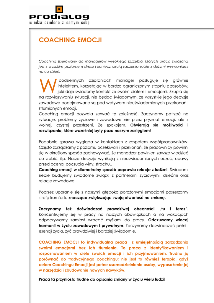 COACHING EMOCJI Coaching skierowany do managerów wysokiego szczebla, których praca związana jest z wysokim poziomem stresu i koniecznością radzenia sobie z dużymi wyzwaniami na co dzień. W codziennych działaniach manager posługuje się głównie intelektem, korzystając w bardzo ograniczonym stopniu z zasobów, jaki daje świadomy kontakt ze swoim ciałem i emocjami. Skupia się na rozwiązywaniu sytuacji, nie będąc świadomym, że wszystkie jego decyzje zawodowe podejmowane są pod wpływem nieuświadomionych przekonań i stłumionych emocji. Coaching emocji pozwala zerwać tę zależność. Zaczynamy patrzeć na sytuacje, problemy życiowe i zawodowe nie przez pryzmat emocji, ale z wolnej, czystej przestrzeni. Ze spokojem. Otwierają się możliwości i rozwiązania, które wcześniej były poza naszym zasięgiem! Podobnie sprawa wygląda w kontaktach z zespołem współpracowników. Często zarządzamy z poziomu oczekiwań i przekonań, że pracownicy powinni się w określony sposób zachowywać, że menadżer powinien zawsze wiedzieć co zrobić, itp. Nasze decyzje wynikają z nieuświadomionych uczuć, obawy przed oceną, poczucia winy, strachu… Coaching emocji w diametralny sposób poprawia relacje z ludźmi. Świadomi siebie budujemy świadome związki z partnerami życiowymi, dziećmi oraz relacje zawodowe. Poprzez uporanie się z naszymi głęboko położonymi emocjami poszerzamy strefę komfortu znacząco zwiększając swoją otwartość na zmianę. Zaczynamy też doświadczać prawdziwej obecności „tu i teraz”. Koncentrujemy się w pracy na naszych obowiązkach a na wakacjach odpoczywamy zamiast wracać myślami do pracy. Odczuwamy więcej harmonii w życiu zawodowym i prywatnym. Zaczynamy doświadczać pełni i esencji życia, żyć prawdziwiej i bardziej świadomie. COACHING EMOCJI to indywidualna praca z umiejętnością zarządzania swoimi emocjami bez ich tłumienia. To praca z identyfikowaniem i rozpoznawaniem w ciele swoich emocji i ich przyjmowaniem. Trudno ją porównać do tradycyjnego coachingu; nie jest to również terapia, gdyż celem Coachingu Emocji jest pełne usamodzielnienie osoby, wyposażenie jej w narzędzia i zbudowanie nowych nawyków. Praca ta przyniosła trudne do opisania zmiany w życiu wielu ludzi! Coaching Emocji jest autorskim programem Beaty Dyraga, która od wielu lat zajmuje się wnikliwą obserwacją wewnętrznych procesów towarzyszących podejmowaniu decyzji. Studiuje i poznaje różne pojawiające się na świecie metody pracy z emocjami poprzez ich przyjmowanie, m. in. E. Tolla, Colina P. Sissona, prof. Jon KabatZinna, W. Jagera, Metody Sedony, nurty taoizmu, rebirthing, tańca 5 rytmów i wielu innych. Od kilku lat pracuje swoją metodą z ludźmi nieustannie ją doskonaląc. Prowadzi warsztaty i coachingi, inspirując ludzi w całej Polsce! NA PYTANIE „CZYM JEST WODA?” MOŻNA ODPOWIEDZIEĆ DWOJAKO: OPCJA NR 1: TŁUMACZYMY KOMUŚ, ŻE WODA TO POŁĄCZENIE TLENU I WODORU, TO COŚ MOKREGO, MOŻE BYĆ CIEPŁE LUB ZIMNE, MA TEMPERATURĘ… OPCJA NR 2: WPROWADZAMY KOGOŚ DO WODY. TO JEST ODPOWIEDŹ NA POZIOMIE DOŚWIADCZANIA, A NIE GŁOWY. COACHING EMOCJI UDZIELA ODPOWIEDZI NA POZIOMIE DOŚWIADCZANIA. Korzyści: znacząco podniesiesz swoją odporność psychiczną czyli umiejętność skutecznego działania w trudnych warunkach i pod wpływem presji, nauczysz się poszerzać spektrum widzenia sytuacji, uzyskiwać dostęp do pełni rozwiązań i możliwości życiowych, uzyskasz dostęp do swojej intuicji, znacząco zwiększysz swoją otwartość do zmiany podniesiesz swoją kreatywności w każdej dziedzinie życia, poprawisz swój balans praca-życie, podniesiesz jakość swojego życia poprzez umiejętność koncentrowania się na tym co tu i teraz, w sposób zauważalny poprawisz swoje relacje z ludźmi. Cykl składa się z 10 dwugodzinnych sesji. Spotkania odbywają się raz w tygodniu, a pomiędzy nimi klient wykonuje zlecone ćwiczenia i zadania. Koszt: 10.000 zł za pełen cykl (1000zł za sesję). Przed rozpoczęciem pracy odbywa się spotkanie, podczas którego omawiany jest przebieg i zasady współpracy.