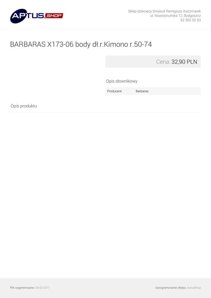 Sklep dziecięcy Smykuś Remigiusz Kaczmarek ul. Nowotoruńska 12, Bydgoszcz 52 362 02 63 BARBARAS X173-06 body dł.r.Kimono r.50-74 Cena: 32,90 PLN Opis słownikowy Producent Barbaras Opis produktu Plik wygenerowano: 08-03-2017 Powered by TCPDF (www.tcpdf.org) Oprogramowanie sklepu: AptusShop