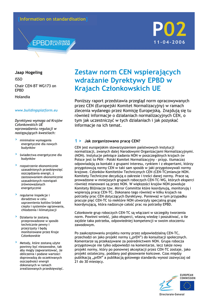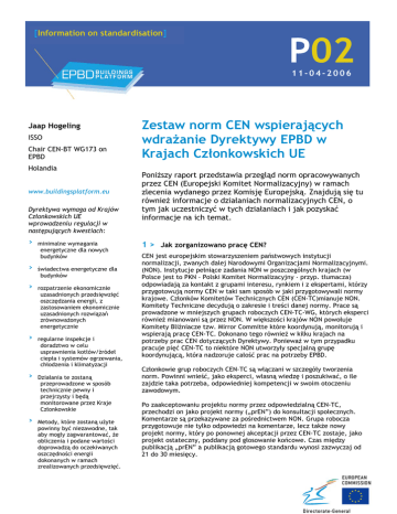 [Information on standardisation] P02 11-04-2006 Jaap Hogeling ISSO Chair CEN-BT WG173 on EPBD Holandia www.buildingsplatform.eu Dyrektywa wymaga od Krajów Członkowskich UE wprowadzeniu regulacji w następujących kwestiach: › › › › › › minimalne wymagania energetyczne dla nowych budynków świadectwa energetyczne dla budynków rozpatrzenie ekonomicznie uzasadnionych przedsięwzięć oszczędzania energii, z zastosowaniem ekonomicznie uzasadnionych rozwiązań zrównoważonych energetycznie regularne inspekcje i doradztwo w celu usprawnienia kotłów/źródeł ciepła i systemów ogrzewania, chłodzenia i klimatyzacji Działania te zostaną przeprowadzone w sposób technicznie pewny i przejrzysty i będą monitorowane przez Kraje Członkowskie Metody, które zostaną użyte powinny być niezawodne, tak aby mogły zagwarantować, że obliczenia i podane wartości doprowadzą do oczekiwanych oszczędności energii dokonanych w ramach zrealizowanych przedsięwzięć. Zestaw norm CEN wspierających wdrażanie Dyrektywy EPBD w Krajach Członkowskich UE Poniższy raport przedstawia przegląd norm opracowywanych przez CEN (Europejski Komitet Normalizacyjny) w ramach zlecenia wydanego przez Komisję Europejską. Znajdują się tu również informacje o działaniach normalizacyjnych CEN, o tym jak uczestniczyć w tych działaniach i jak pozyskać informacje na ich temat. 1 > Jak zorganizowano pracę CEN? CEN jest europejskim stowarzyszeniem państwowych instytucji normalizacji, zwanych dalej Narodowymi Organizacjami Normalizacyjnymi. (NON). Instytucje pełniące zadania NON w poszczególnych krajach (w Polsce jest to PKN - Polski Komitet Normalizacyjny - przyp. tłumacza) odpowiadają za kontakt z grupami interesu, rynkiem i z ekspertami, którzy przygotowują normy CEN w taki sam sposób w jaki przygotowywali normy krajowe. Członków Komitetów Technicznych CEN (CEN-TC)mianuje NON. Komitety Techniczne decydują o zakresie i treści danej normy. Prace są prowadzone w mniejszych grupach roboczych CEN-TC-WG, których eksperci również mianowani są przez NON. W większości krajów NON powołuje Komitety Bliźniacze tzw. Mirror Committe które koordynują, monitorują i wspierają pracę CEN-TC. Dokonano tego również w kilku krajach na potrzeby prac CEN dotyczących Dyrektywy. Ponieważ w tym przypadku pracuje pięć CEN-TC to niektóre NON utworzyły specjalną grupę koordynującą, która nadzoruje całość prac na potrzeby EPBD. Członkowie grup roboczych CEN-TC są włączani w szczegóły tworzenia norm. Powinni wnieść, jako eksperci, własną wiedzę i poszukiwać, o ile zajdzie taka potrzeba, odpowiedniej kompetencji w swoim otoczeniu zawodowym. Po zaakceptowaniu projektu normy przez odpowiedzialną CEN-TC, przechodzi on jako projekt normy („prEN”) do konsultacji społecznych. Komentarze są przekazywane za pośrednictwem NON. Grupa robocza przygotowuje nie tylko odpowiedzi na komentarze, lecz także nowy projekt normy, który po ponownej akceptacji przez CEN-TC zostaje, jako projekt ostateczny, poddany pod głosowanie końcowe. Czas między publikacją „prEN” a publikacją gotowego standardu wynosi zazwyczaj od 21 do 30 miesięcy. EPBD Buildings Platform > P02 PL 1 2 > Jak i gdzie uzyskam normy EN? http://www.cenorm.be/ Normy EN lub prEN lub normy EN-ISO są oficjalnie publikowane przez CEN w Brukseli ale można je uzyskać tylko za pośrednictwem NON. Na stronie internetowej CEN można znaleźć kontakty i skorzystać z wyszukiwarki, pozwalającej na sprawdzenie postępu prac nad daną normą i uzyskanie dostępu do projektów norm. Czy są one dostępne tylko w języku angielskim? Rzeczywiście, większość prac przygotowawczych prowadzonych przez TC i WG jest w języku angielskim. Podstawowa dokumentacja i wstępne projekty są również w języku angielskim. DIN i AFNOR decydują, czy chcą zapewnić CEN niemiecką i francuską wersję publikowanego projektu normy (prEN). Harmonogramy działań umożliwiają udostępnienie tłumaczeń w ciągu dwóch miesięcy. NON decyduje, czy powstaną inne wersje w innych językach krajowych. Taka decyzja będzie podjęta tylko w przypadku zasygnalizowania takiej potrzeby przez użytkowników. Będzie to mało prawdopodobne jeśli grupę użytkowników stanowić będzie mała grupa ekspertów na przykład deweloperzy oprogramowań. Jeśli norma jest bardziej ogólna i odnosi się do większej grupy docelowej, prośba o tłumaczenie powinna zostać rozpatrzona pozytywnie. 3 > Jaka relacja istnieje między normami krajowymi a międzynarodowymi (ISO)? Normy krajowe Między CEN i narodową organizacją normalizacyjną istnieje umowa, zgodnie z którą przed rozpoczęciem własnych krajowych prac normalizacyjnych rozpatruje się dotychczasowe działania normalizacyjne CEN. Jeśli działania CEN zostały już rozpoczęte należy się do nich stosować i nie rozpoczynać prac krajowych. Stan ten określany jest jako “stand still” (wyczekiwanie). Po opublikowaniu EN istniejące i prawdopodobnie sprzeczne z EN normy krajowe zostają wycofane w odpowiednim okresie. Jeśli ustawodawstwo krajowe obejmuje właśnie te normy, to NON może otrzymać kilka lat aby to zmienić. Okres od trzech do pięciu lat to maksymalny czas, w którym normy krajowe powinny zostać wycofane. Normy ISO Między CEN i ISO (Międzynarodowa Organizacja Normalizacyjna) istnieje umowa, zgodnie z którą instytucje te nie będą pracowały nad tymi samymi zagadnieniami (Working Items – WI). Praca nad nowym zagadnieniem może zostać rozpoczęta przez CEN tylko jeśli nie została rozpoczęta przez ISO i odwrotnie. CEN-TC są zachęcane do szukania kontaktów z odpowiednimi ISO-TC np: CEN-TC89 i ISO-TC163, w celu uzgodnienia możliwości równoległego głosowania. Oznacza to, że EN może stać się ISO-EN jeśli zostanie zaakceptowana przez ISO. Istniejące EN będą preferencyjnie uwzględniane przez odpowiednie ISO-TC. Tylko w przypadku gdy odpowied