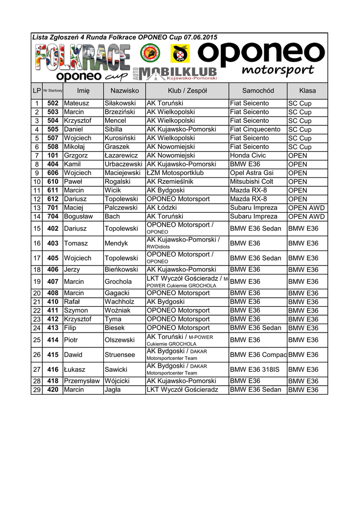 Lista Zgłoszeń 4 Runda MO PZM Folkrace OPONEO Cup 07.06.2015
