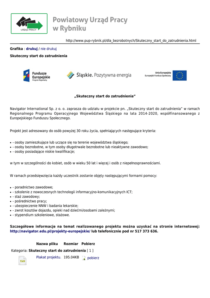 http://www.pup-rybnik.pl/dla_bezrobotnych/Skuteczny_start_do_zatrudnienia.html Grafika : drukuj / nie drukuj Skuteczny start do zatrudnienia „Skuteczny start do zatrudnienia” Navigator International Sp. z o. o. zaprasza do udziału w projekcie pn. „Skuteczny start do zatrudnienia” w ramach Regionalnego Programu Operacyjnego Województwa Śląskiego na lata 2014-2020, współfinansowanego z Europejskiego Funduszu Społecznego. Projekt jest adresowany do osób powyżej 30 roku życia, spełniających następujące kryteria: ● ● ● osoby zamieszkujące lub uczące się na terenie województwa śląskiego; osoby bezrobotne, w tym osoby długotrwale bezrobotne lub nieaktywne zawodowo; osoby posiadające niskie kwalifikacje; w tym w szczególności do kobiet, osób w wieku 50 lat i więcej i osób z niepełnosprawnościami. W ramach przedsięwzięcia każdy uczestnik zostanie objęty następującymi formami pomocy: ● ● ● ● ● ● ● poradnictwo zawodowe; szkolenie z nowoczesnych technologii informacyjno-komunikacyjnych ICT; staż zawodowy; pośrednictwo pracy; ubezpieczenie NNW i badania lekarskie; zwrot kosztów dojazdu, opieki nad dziećmi/osobami zależnymi; stypendium szkoleniowe, stażowe. Szczegółowe informacje na temat realizowanego projektu można uzyskać na stronie internetowej: http://navigator.edu.pl/projekty-europejskie/ lub telefonicznie pod nr 517 373 636. Nazwa pliku Rozmiar Pobierz Kategoria: Skuteczny start do zatrudnienia [ 1 ] Plakat projektu. 195.04KB pobierz