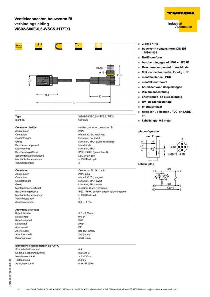 Ventielconnector, bouwvorm BI verbindingsleiding VIS02-S80E-0,6-WSC5.31T/TXL ■ 2-polig + PE ■ bouwvorm volgens norm DIN EN 175301-803 ■ RoHS-conform ■ beschermingsgraad: IP67 en IP69K ■ Beschermcomponent: transildiode ■ M12-connector, haaks, 2-polig + PE ■ mantelmateriaal: PUR ■ mantelkleur: zwart ■ bruikbaar voor sleepleidingen ■ lasvonkenbestendig ■ chemicaliën- en oliebestendig ■ UV- en ozonbestendig • 2017-03-03T12:19:44+01:00 ■ onontvlambaar Type Ident no. VIS02-S80E-0,6-WSC5.31T/TXL 6606826 Connector A-zijde Aantal polen Contacten Contactdrager Greep Beschermcomponent Dichtingsring Beschermingsklasse Schakeltoestandsindicatie Mechanische levensduur Vervuilingsgraad ventielsconnector, bouwvorm BI 2+PE metaal, CuSn, verzilverd kunststof, PA, zwart kunststof, TPU, zwart/translucide transildiode kunststof, TPU IP67, IP69K, (gemonteerd) LED geel / geel > 100 Steekcycli 3 Connector Aantal polen Contacten Contactdrager Greep Montagemoer /-schroef Beschermingsklasse Mechanische levensduur Vervuilingsgraad Aandraaimoment Connector, M12x1, recht 2+PE pins metaal, CuZn, verguld kunststof, TPU, zwart kunststof, TPU, zwart messing, CuZn, vernikkeld IP67, IP69K, enkel in geschroefde toestand > 100 Steekcycli 3 0.8 … 1 Nm Algemene gegevens Kabeldiameter Kabellengte Kabelmateriaal Kabelkleur Aderisolatie Aderkleuren Aderdoorsnede 5.2 ± 0.20mm 0.6 m PUR zwart PP BN, BU, GNYE Draadopbouw 3x0.34mm 42x0.1 mm Elektrische eigenschappen bij +20 °C Stroombelastbaarheid Nominale spanning [Umax] Isolatieweerstand Testspanning Aanligweerstand 4A max. 24 V > 1 Mò/km 2000 V max. 57 ò/km 1/2 ■ halogeen-, siliconen-, PVC- en LABSvrij ■ kabellengte: 0.6 meter pinconfiguratie schakelplan 2 Hans Turck GmbH & Co.KG ñ D-45472 Mülheim an der Ruhr ñ Witzlebenstraße 7 ñ Tel. 0208 4952-0 ñ Fax 0208 4952-264 ñ [email protected] ñ www.turck.com Ventielconnector, bouwvorm BI verbindingsleiding VIS02-S80E-0,6-WSC5.31T/TXL Mechanische en chemische eigenschappen max. trekvastheid (statisch) max. trekvastheid (dynamisch) Buigcycli Buigradius (vaste verplaatsing) Buigradius (flexibele inzet) Toegelaten versnelling 2 ð 20 N/mm > 5 Mio. >5xØ > 10 x Ø 2 max. 5 m/s 5 m (bij 5 m/s²) 2 m (bij 5 m/s²) 3.3 m/s ± 180 °/m 2 -50…+80°C -30…+90°C -25…+60°C • 2017-03-03T12:19:44+01:00 Toegelaten verplaatsing horizontaal Toegelaten verplaatsing verticaal Toegelaten verplaatsingssnelheid Torsiebelasting Omgevingstemperatuur in rusttoestand in bewogen toestand voor sleepleidingen ð 50 N/mm 2/2 Hans Turck GmbH & Co.KG ñ D-45472 Mülheim an der Ruhr ñ Witzlebenstraße 7 ñ Tel. 0208 4952-0 ñ Fax 0208 4952-264 ñ [email protected] ñ www.turck.com