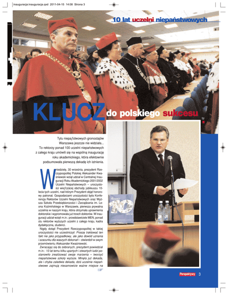 inauguracja:inauguracja.qxd 2011-04-15 14:08 Strona 3 10 lat uczelni niepaństwowych KLUCZ do polskiego sukcesu Tylu niepaƒstwowych gronostajów Warszawa jeszcze nie widziała... To rektorzy ponad 100 uczelni niepaństwowych z całego kraju umówili się na wspólną inaugurację roku akademickiego, która efektownie podsumowała pierwszą dekadę ich istnienia. niedzielę, 30 września, prezydent Rzeczypospolitej Polskiej Aleksander Kwaśniewski wziął udział w Centralnej Inauguracji Roku Akademickiego 2001/2002 Uczelni Niepaństwowych — uroczystości wieƒczàcej obchody jubileuszu 10lecia tych uczelni, nad którym Prezydent objął honorowy patronat. Gospodarzami uroczystości była Konferencja Rektorów Uczelni Niepaństwowych oraz Wyższa Szkoła Przedsiębiorczości i Zarządzania im. Leona Koźmińskiego w Warszawie, pierwsza prywatna uczelnia w naszym kraju, która otrzymała uprawnienia doktorskie i wypromowała już trzech doktorów. W inauguracji udział wzięli m.in.: przedstawiciele MEN, ponad stu rektorów wyższych uczelni z całego kraju, kadra dydaktyczna, studenci. Nigdy dotąd Prezydent Rzeczypospolitej w takiej uroczystości nie uczestniczył: Proszę traktować ten fakt nie jako przypadkowy, ale jako dowód uznania i szacunku dla waszych dokonań — stwierdził w swym przemówieniu Aleksander Kwaśniewski. Zwracając się do zebranych, prezydent powiedział m.in.: 10 lat temu kilku upartych i otwartych ludzi postanowiło zrealizować swoje marzenia — tworzyć niepaństwowe szkoły wyższe. Minęła już dekada, ale i chyba zaledwie dekada, dziś uczelnie niepaństwowe zajmują niesamowicie ważne miejsce na W K Perspektywy 3 inauguracja:inauguracja.qxd 2011-04-15 14:09 Strona 4 K mapie edukacyjnej Polski. Dwa dni temu miałem zaszczyt i przyjemność odznaczyć grono tych ludzi, którzy zapoczątkowali rozwój i nadali nowy kształt polskiej edukacji. A dorobek uczelni prywatnych budzi szacunek i podziw. Oto bowiem w Polsce działa 216 wyższych szkół niepaństwowych, kształcą one ponad 500 tysięcy studentów. Początkowy entuzjazm założycieli, a potem konsekwentnie podejmowany codzienny wysiłek przyczyniły się do osiągnięcia obecnych sukcesów. Uczelnie prywatne zmieniły obraz polskiego szkolnictwa wyższego; przedstawiono młodzieży ofertę interesującą i zróżnicowaną, programy nauczania zostały dostosowane do potrzeb naszej gospodarki, także do wymogów UE. Ale co chcę szczególnie podkreślić — miejsce studiowania młodzieży przybliżyło sił do miejsca jej zamieszkania. Szkoły okazały się po pierwsze szansą dla młodzieży z małych miast, środowisk robotniczych, wiejskich, rodzin niezamożnych. Dla niej staliście się przysłowio- wym oknem na świat. A po drugie szkoły wyższe niepubliczne ogromnie pomagają rozwojowi regionów, tworzą wartości kulturalne i intelektualne na tych terenach i dla wielu miejscowości stają się szansą. Szansą nieporównanie bardziej realną aniżeli wielkie inwestycje czy napływ dużych grup inwestorów. Wiemy, że jest jeszcze mnóstwo do poprawienia, ale jestem przekonany, że warunki ostrej konkurencji ze strony szkół państwowych Jak państwowy z niepaństwowym... Rektor Jerzy Woźnicki z PW (na pierwszym planie) w rozmowie z rektorem Paw em Nowackim z PJWSTK w Warszawie 4 Perspektywy inauguracja:inauguracja.qxd 2011-04-15 14:09 Strona 5 Z C U L K u sukces o g e i k s do pol Fot. Krzysztof Wojciewski Prof. Andrzej K. Koźmiƒski (z lewej) i prof. Józef Szab owski wręczyli Aleksandrowi Kwaśniewskiemu „Księgę 10-lecia uczelni niepaństwowych” Od lewej: prof. Jan Misiak, prof. Adam Koseski i prof. Andrzej Bartnicki wie i między poszczególnymi uczelniami spowodują, że z roku na rok, w większości (choć nie wszystkich) poprawia się jakość nauczania. Wiemy również, i to chcę powiedzieć całkowicie oficjalnie w tym miejscu, że najlepsze szkoły niepubliczne pracują na poziomie najwyższym. Rozwój szkolnictwa prywatnego można również ocenić wzrastającymi kwalifikacjami zatrudnionej kadry naukowej. (...) Edukacja ma dla Polski rolę kluczową. W XXI wieku o poziomie życia Polaków przesądzą bowiem nasze umiejętności, poziom wykształcenia, posiadanie kwalifikacji, które są niezbędne w świecie ostrej, międzynarodowej konkurencji. A więc potencjał intelektualny kraju staje się, czynnikiem o rozstrzygajàcym znaczeniu. Mamy atuty, Polska dysponuje wielkim kapitałem ludzi młodych, zdolnych, otwartych na świat. Dziesięcioletni dorobek wyższych uczelni niepaństwowych jest tego najlepszym dowodem. Wykształcona, świadoma potrzeb kraju, niezbędnych innowacji młodzież, to jest właśnie ta nadzieja, że w międzynarodowej rywalizacji nie będziemy tłem, nie będziemy gorsi od innych. Od rozwoju edukacji będzie zależało, czy uda nam się dokonaç cywilizacyjnego skoku, czy Polska będzie w tej ścisłej czołówce rozwiniętych i zamożnych społeczeństw europejskich. Tak więc to właśnie Wy, Panie i Panowie, naukowcy i adepci nauki, ludzie oddani pomnażaniu i wykorzystywaniu wiedzy, macie w rękach klucz do polskiego sukcesu. To jest szczera prawda — od Was tak wiele zależy. W tym dniu dziękuję wszystkim, którzy działają na rzecz szkolnictwa prywatnego, za Wasz rozwój, dorobek, współpracę, za mądre reagowanie na potrzeby rynku pracy, bo przecież gdyby ta młodzież nie znalazła wykształcenia, nie zna la zła szan sy na Wa szych uczel niach, to by ła by klien ta mi urzędów pracy. Ten istotny element, czynnik ekonomiczny, chcę również podkreślić. Ślubowanie najm odszych studentów WSPiZ im. Leona Koźmińskiego cza. Ciągle trzeba dążyć do sprawiedliwości społecznej i pracować dla dobra wspólnego. Natomiast 29 września br., pod hasłem „Edukacja dla rozwoju innowacyjnego w Polsce” obradował I Kongres Uczelni Niepaństwowych. Wzięło w nim udział ponad 300 osób, rektorów i pracowników naukowych u