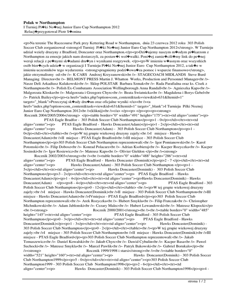 Polak w Northampton I Turniej Pi�ki No�nej Junior Euro Cup Northampton 2012 Relacj�przygotowal Piotr S�onina <p>Na terenie The Racecourse Park przy Kettering Road w Northampton, dnia 23 czerwca 2012 roku 303 Polish Soccer Club zorganizowal <strong>I Turniej Pi�ki No�nej Junior Euro Cup Northampton 2012</strong>. W Turnieju udzial wziely druzyny z Bradford, Doncaster oraz Northampton.</p><p>Dzi�ujemy naszym m�odym pi�karzom z Northampton za emocje jakich nam dostarczyli, za postaw�i wol�walki. Poni�ej zamie�cili�my link do pe�nej wersji relacji z pe�nymi sk�adami dru�yn i wynikami rozgrywek. </p><p>W imieniu w�asnym oraz wszystkich osób bior�cych udzia� w organizacji I Turnieju Pi�ki No�nej Junior Euro Cup Northampton 2012, a tak�e w imieniu uczestników tego wydarzenia <strong>pragniemy podzi�owa�za pomoc i wsparcie finansowe</strong>, jakie otrzymalismy od:<br />- K CARS Andrzej Krzyzanowski<br />- STAGECOACH MIDLANDS Steve Burd Managing Director<br />- BELMONT PRESS Martin J. Whatton Works, Production and Personnel Manager<br />Nasze Deli Arkadiusz Kulakowski<br />- Sklep POLSTAR Barbara Szmak<br />- Rada Parafialna oraz ks. Cisek z Northampton<br />- Polish Ex-Combatants Association Wellingborough Anna Randall<br />- Agnieszka Kaps<br />Malgorzata Kloska<br />- Malgorzata i Grzegorz Chyrc<br />- Beata Swiatnicka<br />- Magdalena i Borys Gebel<br />- Patrick Bailey</p><p><a href="index.php?option=com_content&task=view&id=631&Itemid=1" target="_blank">Przeczytaj sk�ady dru�un oraz oficjalne wyniki </a><br /><a href="index.php?option=com_content&task=view&id=631&Itemid=1" target="_blank">I Turnieju Pilki Noznej Junior Euro Cup Northampton 2012<br />(kliknij)<br /></a> </p><p> </p><p><p><strong> Rocznik 2004/2005/2006</strong> </p><table border="0" width="491" height="175"><tr><td align="center"><p> PTAS Eagle Bradfor - 303 Polish Soccer Club Northampton</p><p>1 - 0</p></td></tr><tr><td align="center"><p> PTAS Eagle Bradford - Hawks Doncaster(Adam)</p><p>1 - 2</p></td></tr><tr><td align="center"><p> Hawks Doncaster(Adam) - 303 Polish Soccer Club Northampton</p><p>1 0</p></td></tr></table><br /><p>W tej grupie wiekowej druzyny zajely:<br />I miejsce - Hawks Doncaster(Adam)<br />II miejsce - PTAS Eagle Bradford<br />III miejsce - 303 Polish Soccer Club Northampton</p><p>303 Polish Soccer Club Northampton reprezentowali:<br />- Igor Pomianowski<br />- Karol Potomski<br />- Filip Dobosz<br />- Konrad Polacarz<br />- Adrian Ksobieraj<br />- Kacper Rozyczka<br />- Kacper Sosinski<br />- Igor Rosiewicz<br />- Mateusz Kaps<br />- Olivier Gieldon </p><br /><strong> Rocznik 2002/2003</strong><br /><br /><table border="0" width="488" height="286"><tr><td align="center"><p> PTAS Eagle Bradford - Hawks Doncaster (Dominik)</p><p>2 - 7 </p></td></tr><tr><td align="center"><p> Hawks Doncaster(Adam) - 303 Polish Soccer Club Northampton </p><p>1 5</p></td></tr><tr><td align="center"><p> Hawks Doncaster(Dominik) - 303 Polish Soccer Club Northampton</p><p>3 - 2</p></td></tr><tr><td align="center"><p> PTAS Eagle Bradford - Hawks Doncaster(Adam)</p><p>1 - 4</p></td></tr><tr><td align="center"><p>Hawks Doncaster(Dominik) - Hawks Doncaster(Adam) </p><p>8 - 4</p></td></tr><tr><td align="center"><p> PTAS Eagle Bradford - 303 Polish Soccer Club Northampton</p><p>0 - 12</p></td></tr></table> <br /><p>W tej grupie wiekowej druzyny zajely:<br />I miejsce - Hawks Doncaster(Dominik)<br />II miejsce - 303 Polish Soccer Club Northampton<br />III miejsce - Hawks Doncaster(Adam)<br />IVmiejsce - PTAS Eagle Bradford</p><p>303 Polish Soccer Club Northampton reprezentowali:<br />- Arek Rozyczka<br />- Hubert Smykla<br />- Filip Fratczak<br />- Christopher Michnikowski<br />- Adam Jablonski<br />- Cezary Malec<br />- Hubert Lewandowski<br />- Mateusz Klopocki</p> <br /><strong> Rocznik 2000/2001</strong><br /><br /><table border="0" width="485" height="145"><tr><td align="center"><p> PTAS Eagle Bradford - 303 Polish Soccer Club Northampton</p><p>0 - 3</p></td></tr><tr><td align="center"><p> PTAS Eagle Bradford - Hawks Doncaster(Dominik)</p><p>1 - 3</p></td></tr><tr><td align="center"><p> Hawks Doncaster(Dominik) 303 Polish Soccer Club Northampton</p><p>0 - 2</p></td></tr></table><br /><p>W tej grupie wiekowej druzyny zajely:<br />I miejsce - 303 Polish Soccer Club Northampton<br />II miejsce - Hawks Doncaster(Dominik)<br />III miejsce - PTAS Eagle Bradford</p><p>303 Polish Soccer Club Northampton reprezentowali:<br />- Jakub Tomaszewicz<br />- Daniel Kowalski<br />- Jakub Chyrc<br />- Dawid Cybulin<br />- Kacper Basa<br />- Pawel Suchocki<br />- Mateusz Smykla<br />- Marcel Pawlik<br />- Patryk Bakowski<br />- Gabriel Borukalo</p><br /><strong> Rocznik 1999/1998 i starsi</strong><br /><br /><table border="0" width="521" height="160"><tr><td align="center"><p> Hawks Doncaster(Dominik) - 303 Polish Soccer Club Northampton1999</p><p>5 - 0</p></td></tr><tr><td align="center"><p>303 Polish Soccer Club Northampton1999 - 303 Polish Soccer Club Northampton1998</p><p>2 - 6</p></td></tr><tr><td align="center"><p> Hawks Doncaster(Dominik) - 303 Polish Soccer Club Northampton1998</p><p>4 strona 1 / 2 Polak w Northampton I Turniej Pi�ki No�nej Junior Euro Cup Northampton 2012 Relacj�przygotowal Piotr S�onina 1</p></td></tr></table><p><br />W tej grupie wiekowej druzyny zajely:<br />I miejsce - Hawks Doncaster(Dominik)<br />II miejsce - 303 Polish Soccer Club Northampton1998<br />III miejsce - 303 Polish Soccer Club Northampton1999<br /><br />303 Polish Soccer Club Northampton 99 reprezentowali:<br />- Tomasz Kulasik<br />- Oskar Potomski<br />- Patryk Kaminski<br />- Kacper Zychowicz<br />- Jakub Radzik<br />- Patryk Walcerz<br /><br />303 Polish Soccer Club Northampton 98 i starsi reprezentowali:<br />- Jakub Wojciechowski<br />- Mikolaj Kaczmarek<br />- Daniel Jadecki<br />- Krystian Skowronek<br />- Gaspar Motowidlo<br />- Kacper Watroba<br />- Jakub Slonina</p><p> </p><p>R